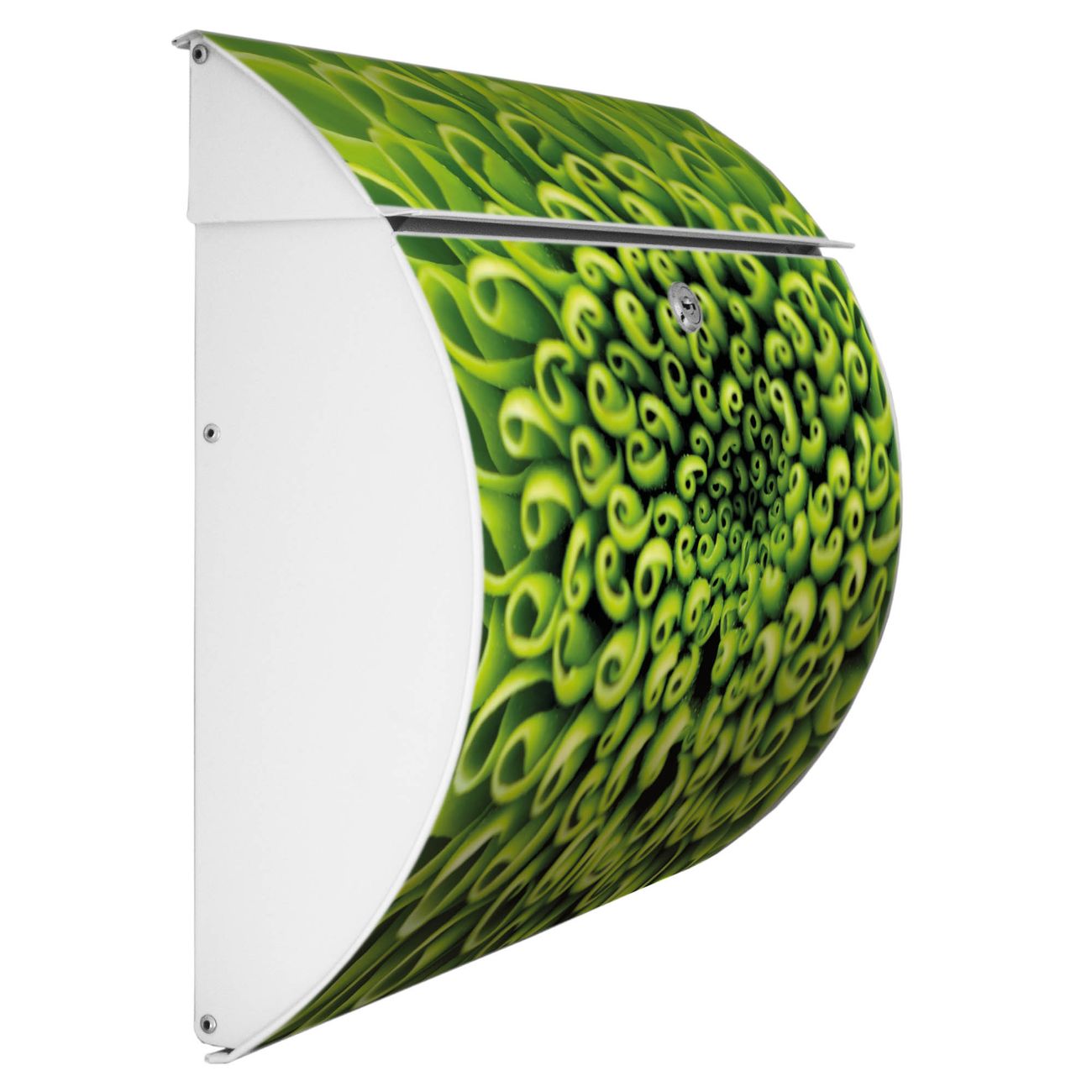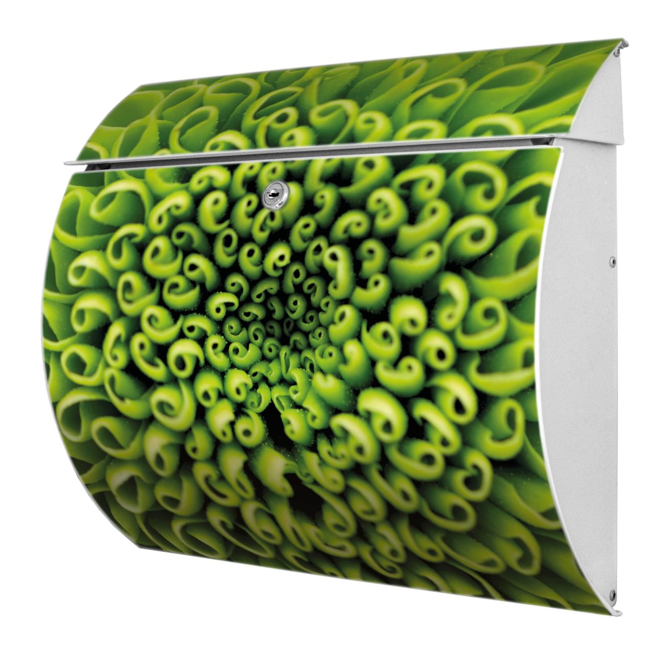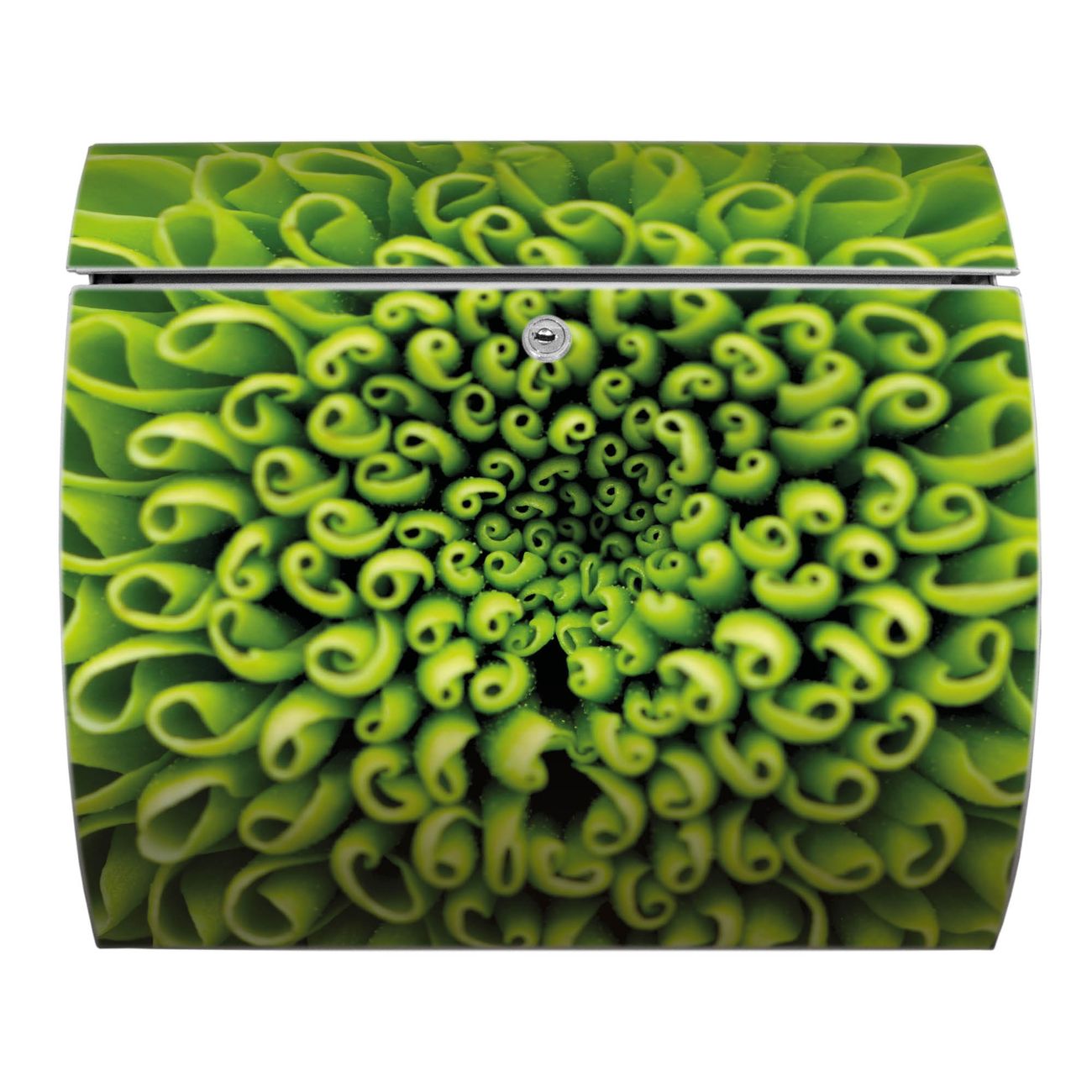 Der geschwungene Burg Wächter Briefkasten Toscana mit Motiv Grüne Chrysantheme bietet Ihnen mit seinem großen Fassungsvermögen genügend Platz auch für große A4 Sendungen. Auf Wunsch können Sie bei uns den passenden Standfuß bestellen und so aus dem Wandbriefkasten einen Standbriefkasten machen. Der integrierte Öffnungsstopp ermöglicht eine einfache Handhabung beim Entnehmen der Post.