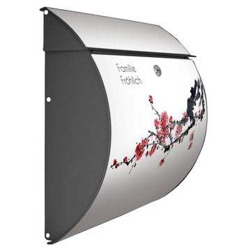 Der geschwungene Burg Wächter Briefkasten Toscana mit Motiv Japanische Blüten 2 bietet Ihnen mit seinem großen Fassungsvermögen genügend Platz auch für große A4 Sendungen. Auf Wunsch können Sie bei uns den passenden Standfuß bestellen und so aus dem Wandbriefkasten einen Standbriefkasten machen. Der integrierte Öffnungsstopp ermöglicht eine einfache Handhabung beim Entnehmen der Post.