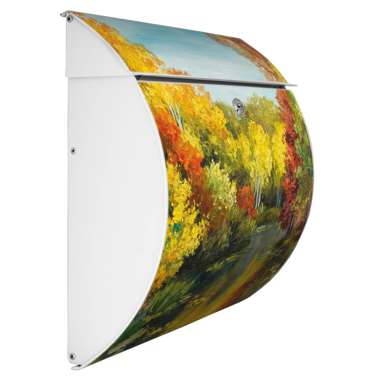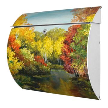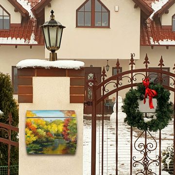 Der geschwungene Burg Wächter Briefkasten Toscana mit Motiv Kanal Im Herbst bietet Ihnen mit seinem großen Fassungsvermögen genügend Platz auch für große A4 Sendungen. Auf Wunsch können Sie bei uns den passenden Standfuß bestellen und so aus dem Wandbriefkasten einen Standbriefkasten machen. Der integrierte Öffnungsstopp ermöglicht eine einfache Handhabung beim Entnehmen der Post.