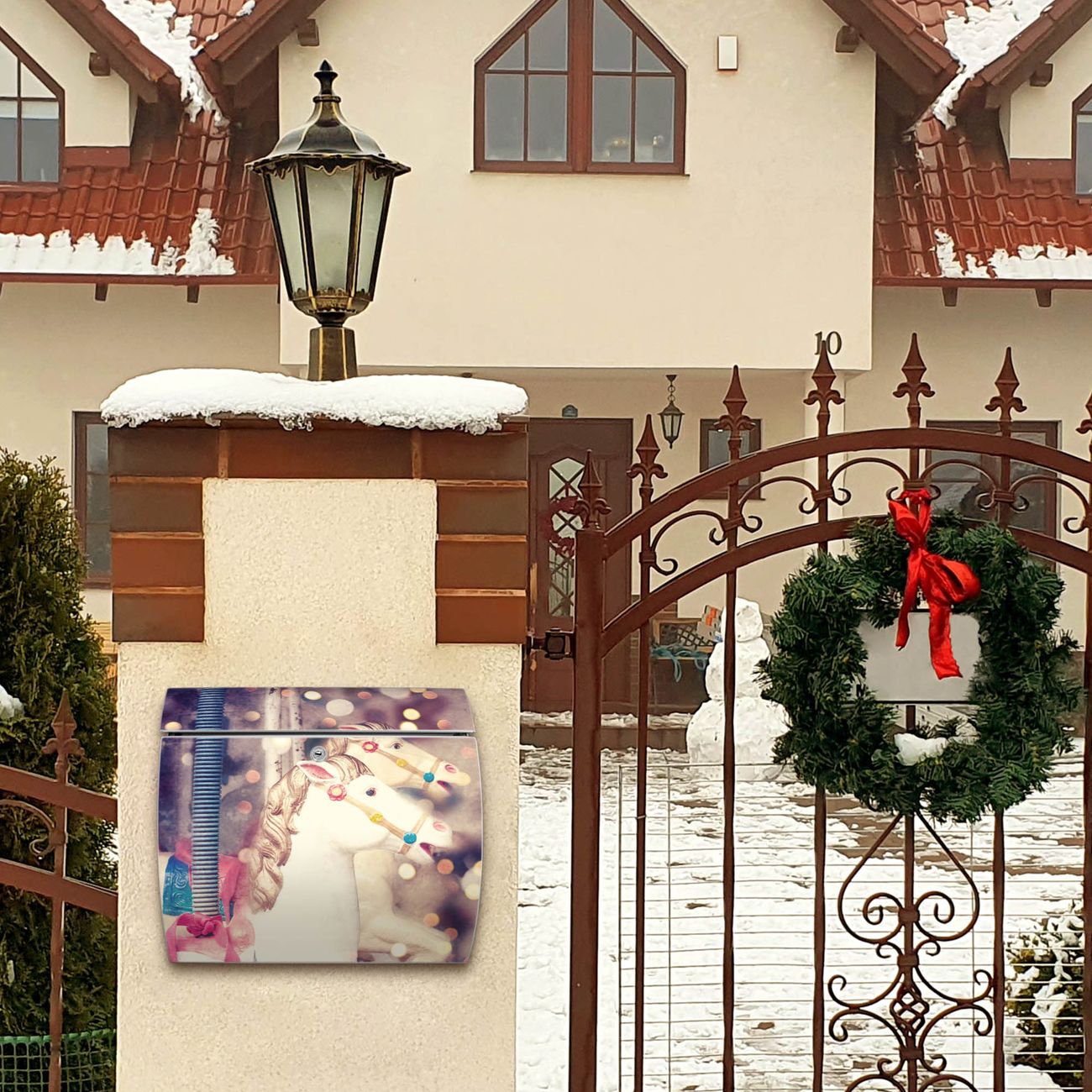 FUNKTION: DESIGN: Das Burg Wächter Modell Toscana mit Motiv Kinderkarussell hat ein sehr ansprechendes und zeitloses Design und ist besonderes wetterfest. Heben Sie Sich von der tristen grauen Masse ab, ohne auf Funktionalität zu verzichten. Wir bieten Ihnen ebenfalls Namensschilder, bereits beschriftet oder frei zu beschriften, und verschiedene selbst gestaltete Bitte-Keine-Werbung-Aufkleber. DETAILS: Der Postkasten besteht aus vollflächig verzinktem Stahl welcher in Anthrazit oder Weiß lackiert wurde oder aus Edelstahl (je nach gewählter Variante). Das Motiv besteht aus einer wetter- und UV-festen Folie, die mit einem Schutzlaminat überzogen ist, durch die Ihren Briefkasten zusätzlich vor Kratzern geschützt ist und auf den Briefkasten kaschiert wurde. Sie erhalten zu Ihrem neuen Design Briefkasten 2 Schlüssel sowie das passende Montagematerial. BANJADO: Ihr Briefkasten wird von Burg Wächter in Deutschland gefertigt und in unserer kleinen Manufaktur von Hand veredelt. Die Motivfolie ist lösungsmittelfrei und schutzlaminiert, dies sorgt für einen langen Halt. Wir legen großen Wert auf die Verbindung von Funktionalität und Design. Sie erhalten besondere Handarbeit aus Sachsen und Made in Germany.