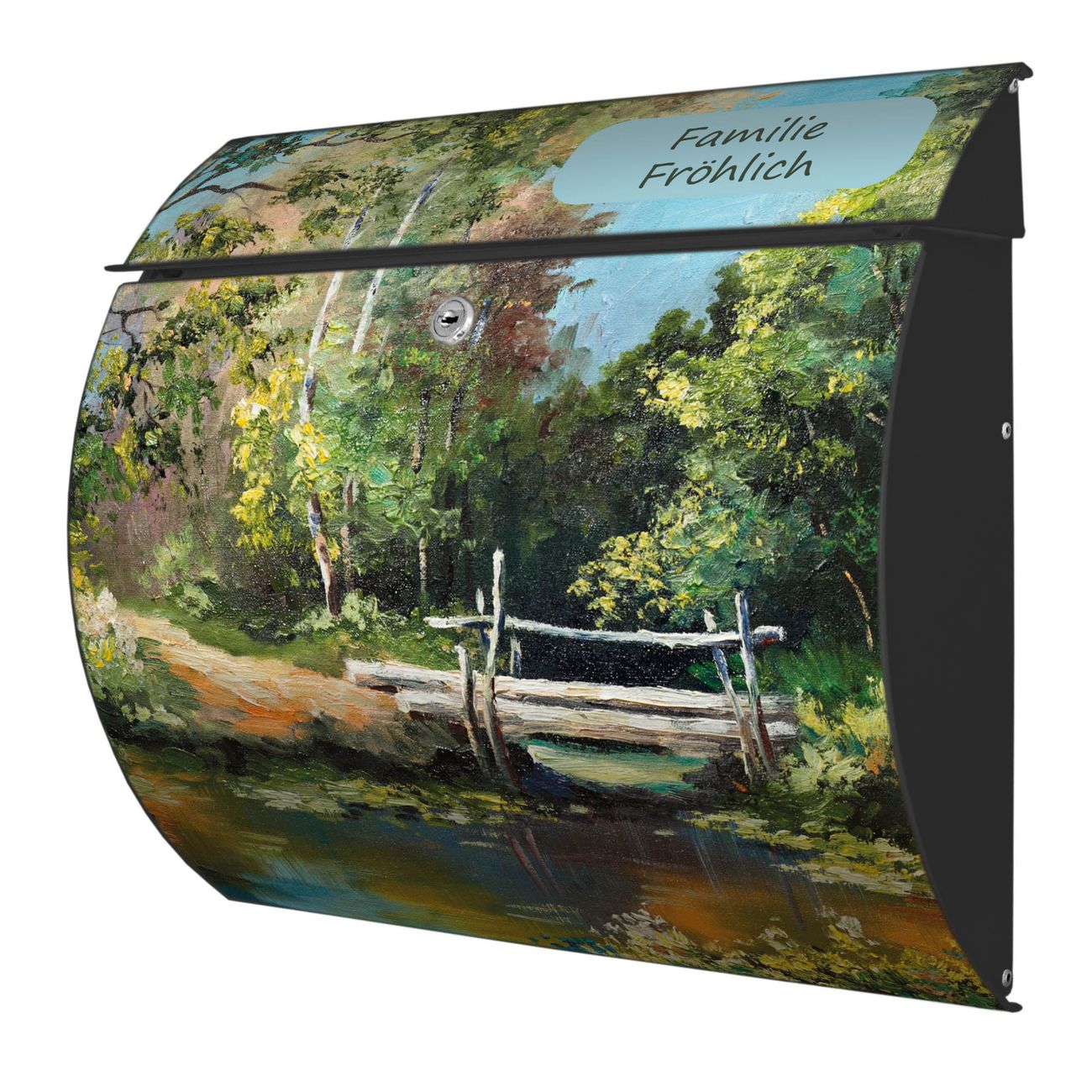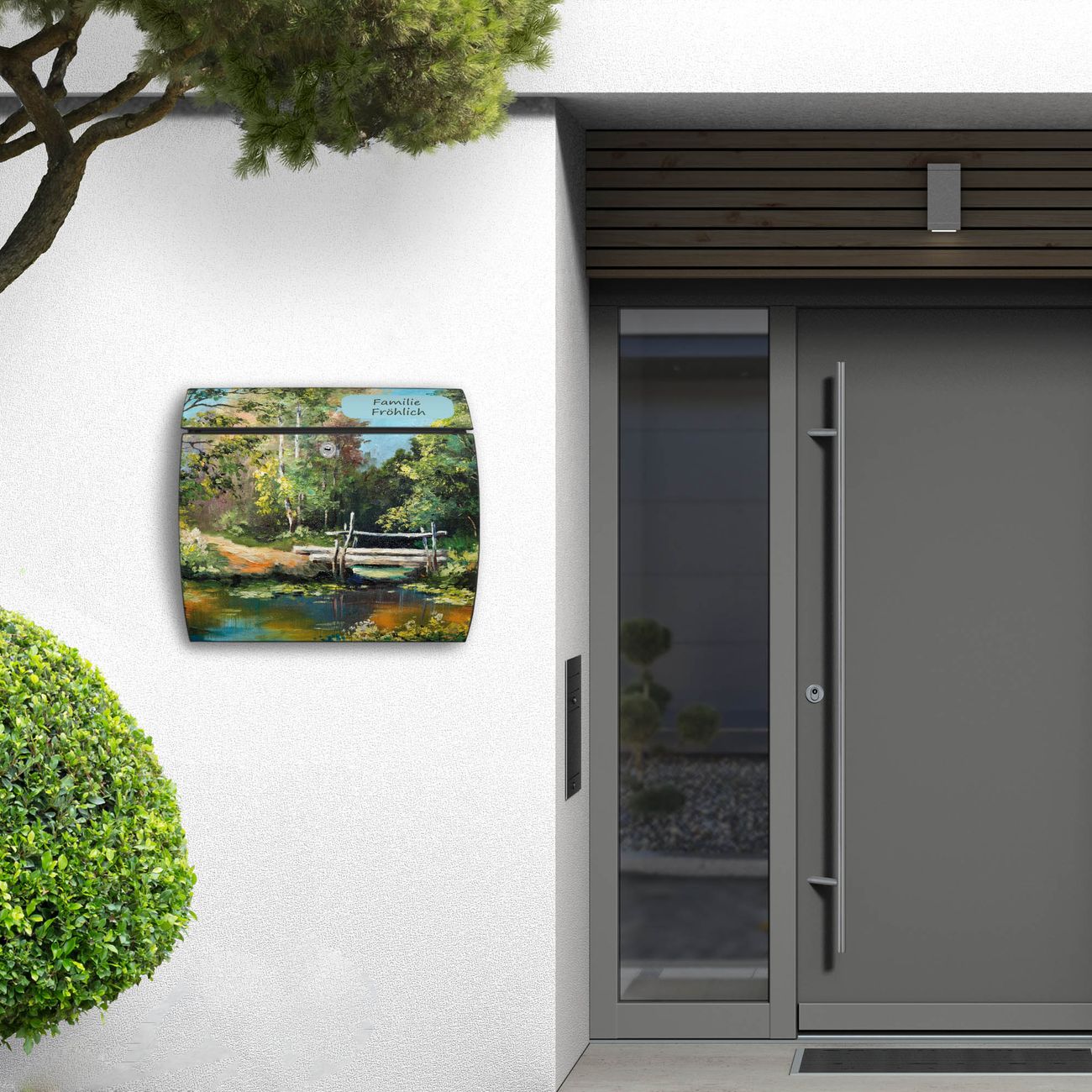 FUNKTION: DESIGN: Das Burg Wächter Modell Toscana mit Motiv Kleine Brücke hat ein sehr ansprechendes und zeitloses Design und ist besonderes wetterfest. Heben Sie Sich von der tristen grauen Masse ab, ohne auf Funktionalität zu verzichten. Wir bieten Ihnen ebenfalls Namensschilder, bereits beschriftet oder frei zu beschriften, und verschiedene selbst gestaltete Bitte-Keine-Werbung-Aufkleber. DETAILS: Der Postkasten besteht aus vollflächig verzinktem Stahl welcher in Anthrazit oder Weiß lackiert wurde oder aus Edelstahl (je nach gewählter Variante). Das Motiv besteht aus einer wetter- und UV-festen Folie, die mit einem Schutzlaminat überzogen ist, durch die Ihren Briefkasten zusätzlich vor Kratzern geschützt ist und auf den Briefkasten kaschiert wurde. Sie erhalten zu Ihrem neuen Design Briefkasten 2 Schlüssel sowie das passende Montagematerial. BANJADO: Ihr Briefkasten wird von Burg Wächter in Deutschland gefertigt und in unserer kleinen Manufaktur von Hand veredelt. Die Motivfolie ist lösungsmittelfrei und schutzlaminiert, dies sorgt für einen langen Halt. Wir legen großen Wert auf die Verbindung von Funktionalität und Design. Sie erhalten besondere Handarbeit aus Sachsen und Made in Germany.