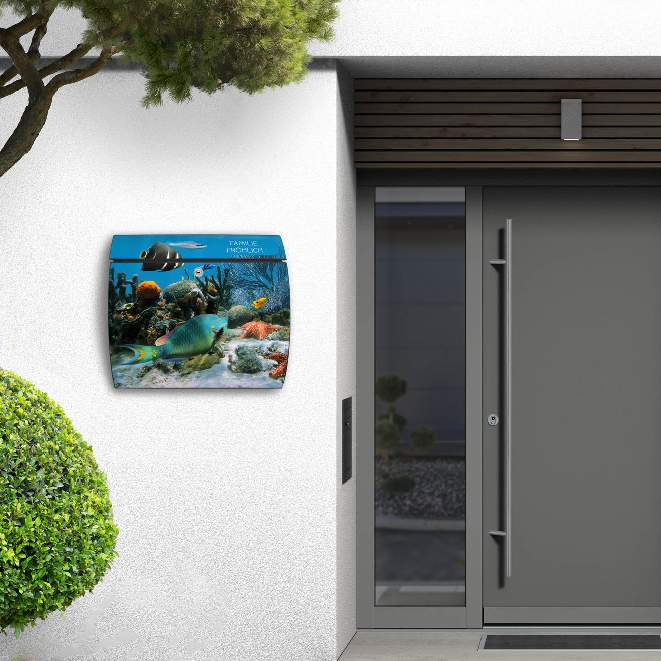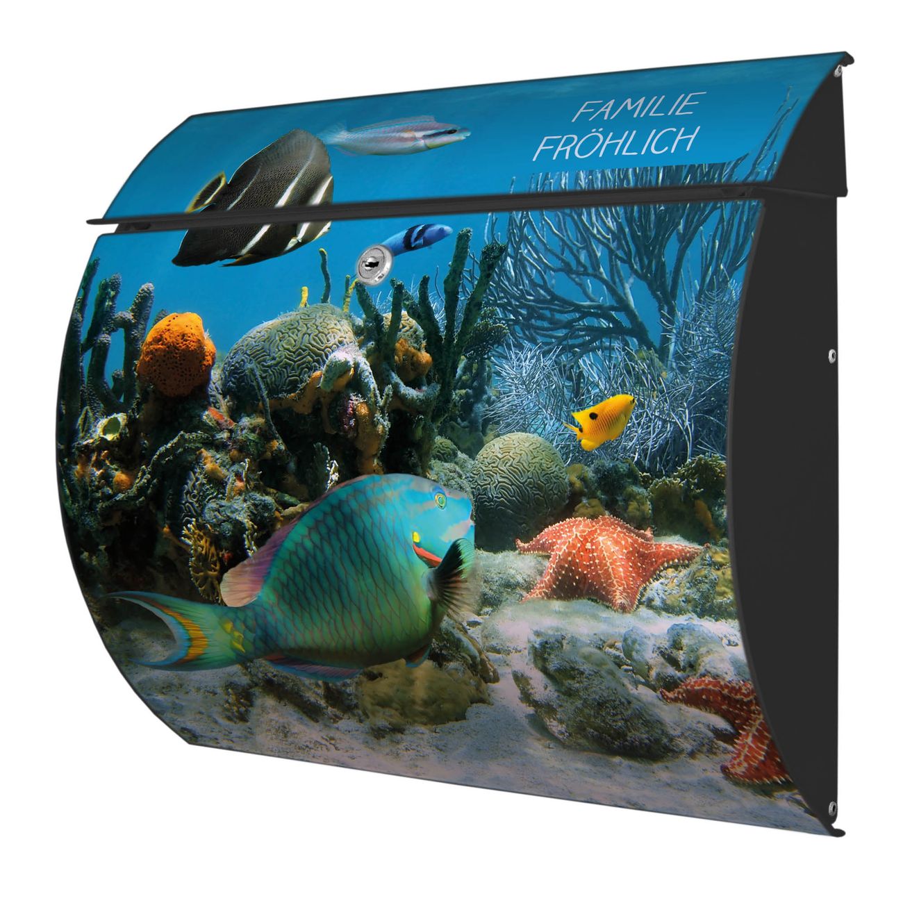 FUNKTION: DESIGN: Das Burg Wächter Modell Toscana mit Motiv Korallenriff 1 hat ein sehr ansprechendes und zeitloses Design und ist besonderes wetterfest. Heben Sie Sich von der tristen grauen Masse ab, ohne auf Funktionalität zu verzichten. Wir bieten Ihnen ebenfalls Namensschilder, bereits beschriftet oder frei zu beschriften, und verschiedene selbst gestaltete Bitte-Keine-Werbung-Aufkleber. DETAILS: Der Postkasten besteht aus vollflächig verzinktem Stahl welcher in Anthrazit oder Weiß lackiert wurde oder aus Edelstahl (je nach gewählter Variante). Das Motiv besteht aus einer wetter- und UV-festen Folie, die mit einem Schutzlaminat überzogen ist, durch die Ihren Briefkasten zusätzlich vor Kratzern geschützt ist und auf den Briefkasten kaschiert wurde. Sie erhalten zu Ihrem neuen Design Briefkasten 2 Schlüssel sowie das passende Montagematerial. BANJADO: Ihr Briefkasten wird von Burg Wächter in Deutschland gefertigt und in unserer kleinen Manufaktur von Hand veredelt. Die Motivfolie ist lösungsmittelfrei und schutzlaminiert, dies sorgt für einen langen Halt. Wir legen großen Wert auf die Verbindung von Funktionalität und Design. Sie erhalten besondere Handarbeit aus Sachsen und Made in Germany.