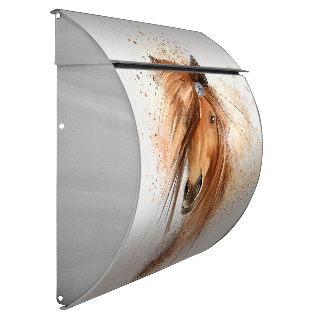 Der geschwungene Burg Wächter Briefkasten Toscana mit Motiv Magic Horse bietet Ihnen mit seinem großen Fassungsvermögen genügend Platz auch für große A4 Sendungen. Auf Wunsch können Sie bei uns den passenden Standfuß bestellen und so aus dem Wandbriefkasten einen Standbriefkasten machen. Der integrierte Öffnungsstopp ermöglicht eine einfache Handhabung beim Entnehmen der Post.