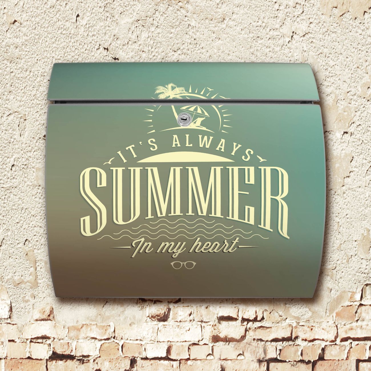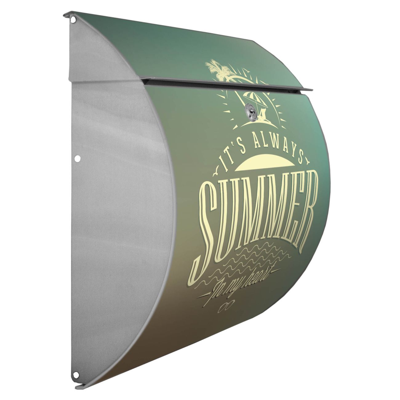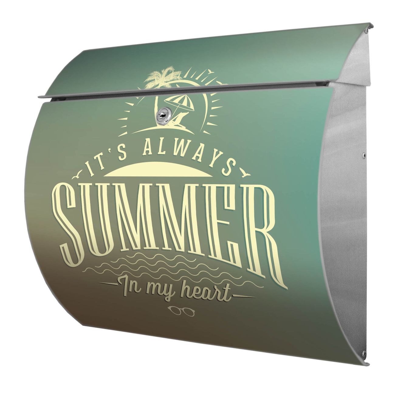 Motiv  Sommer Heart Nr. 12896 Material  Edelstahl Dekorfolie  UV-beständig, wetterfest Gesamtgröße  37,6x33x10,6cm BxHxT Briefschlitz  32,5x3,5cm BxH Gewicht  ca. 2,30 kg Zubehör  inkl. Öffnungsstopp, Montagezubehör und 2 Schlüssel