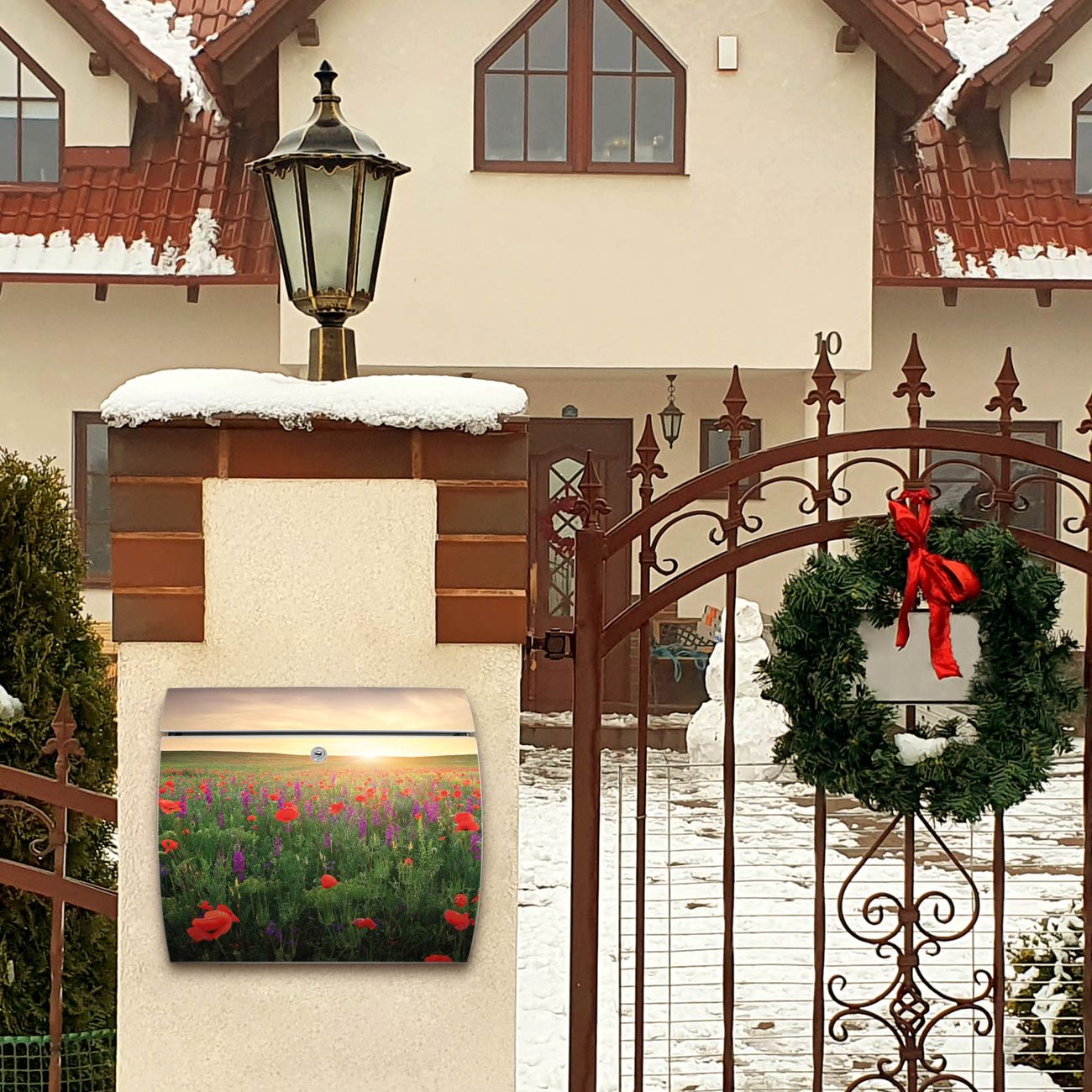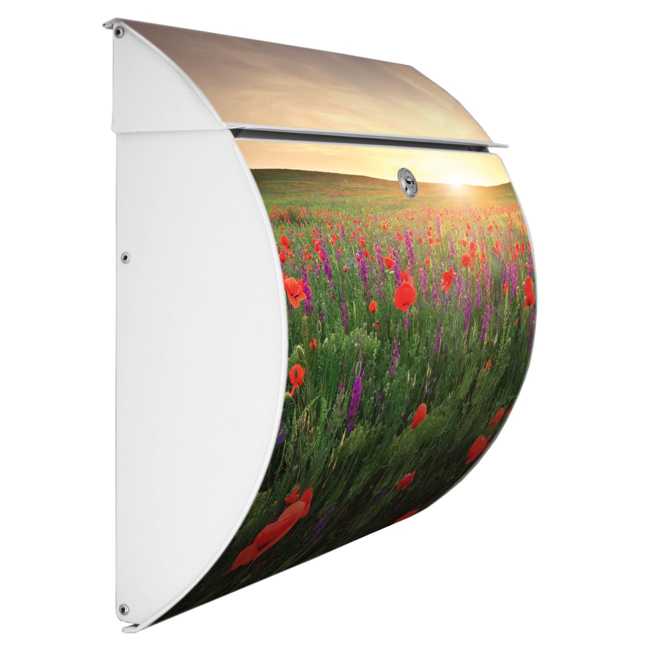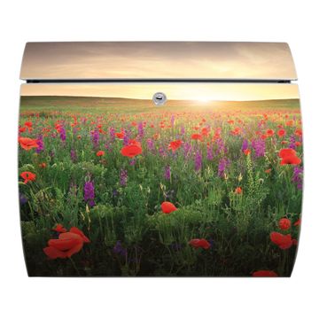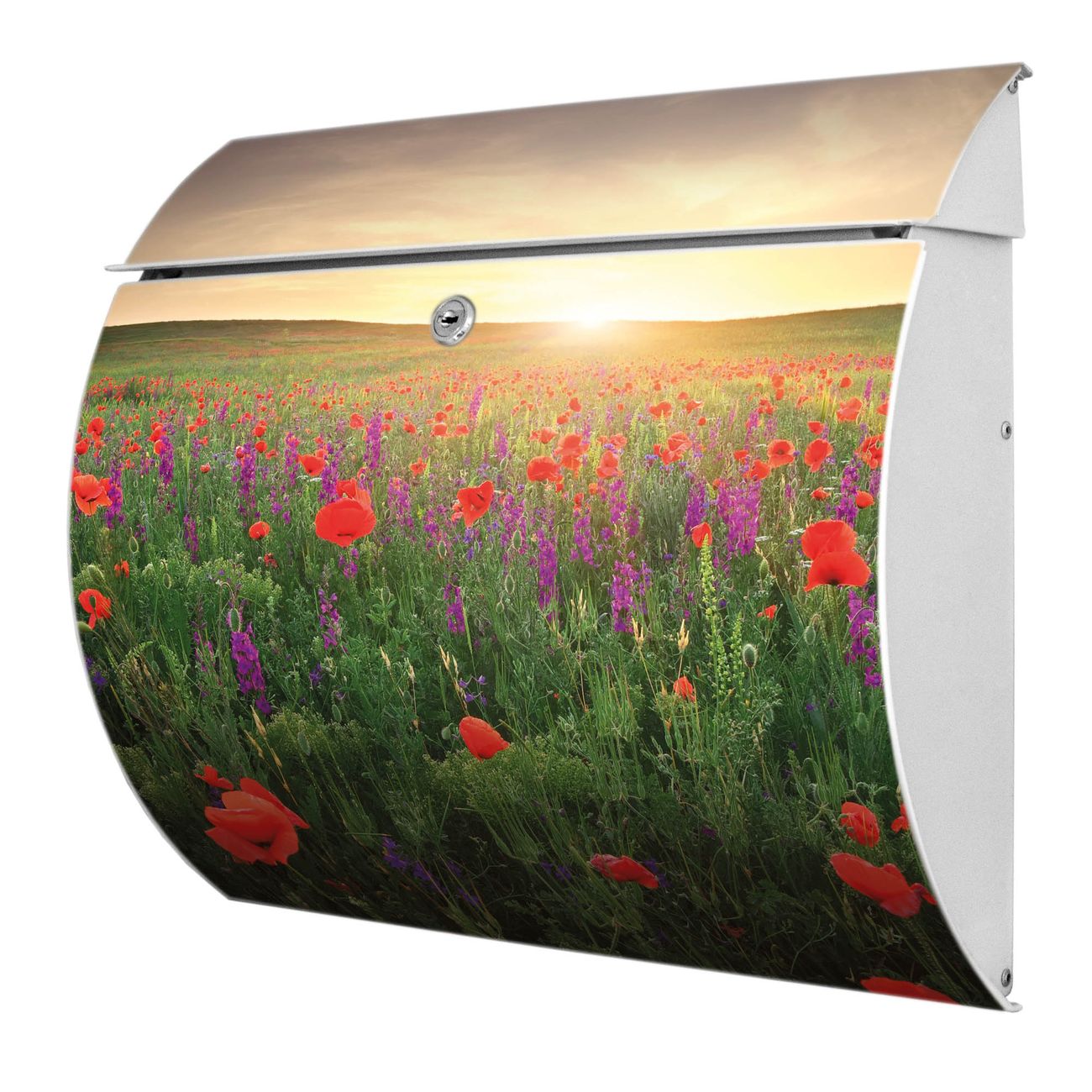 Der geschwungene Burg Wächter Briefkasten Toscana mit Motiv Sommerfeld bietet Ihnen mit seinem großen Fassungsvermögen genügend Platz auch für große A4 Sendungen. Auf Wunsch können Sie bei uns den passenden Standfuß bestellen und so aus dem Wandbriefkasten einen Standbriefkasten machen. Der integrierte Öffnungsstopp ermöglicht eine einfache Handhabung beim Entnehmen der Post.