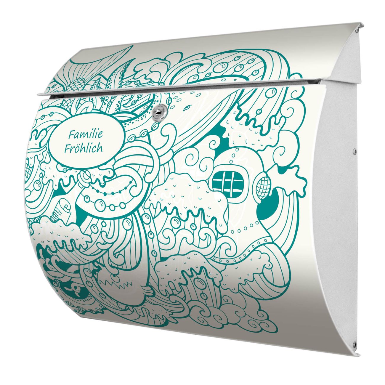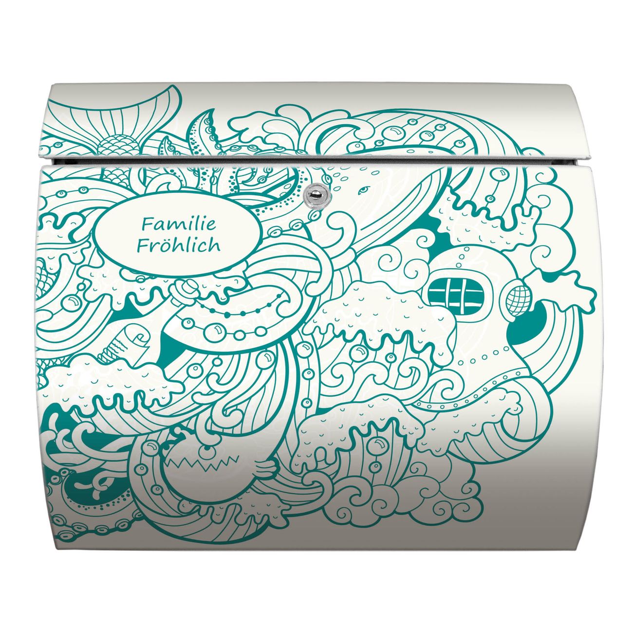 Der geschwungene Burg Wächter Briefkasten Toscana mit Motiv Tiefsee bietet Ihnen mit seinem großen Fassungsvermögen genügend Platz auch für große A4 Sendungen. Auf Wunsch können Sie bei uns den passenden Standfuß bestellen und so aus dem Wandbriefkasten einen Standbriefkasten machen. Der integrierte Öffnungsstopp ermöglicht eine einfache Handhabung beim Entnehmen der Post.