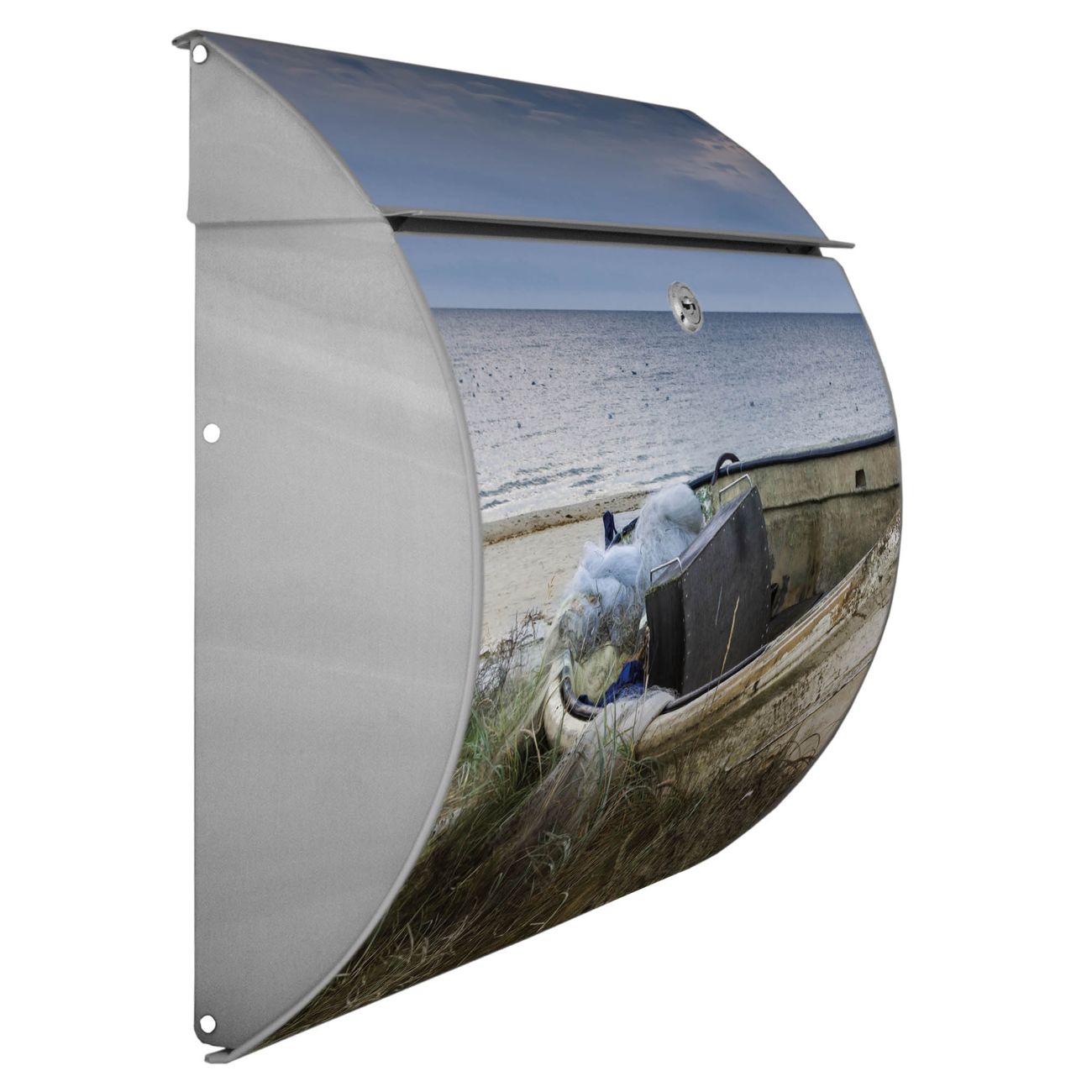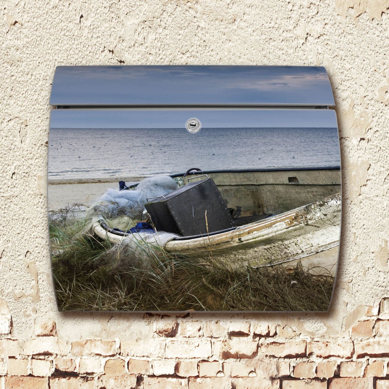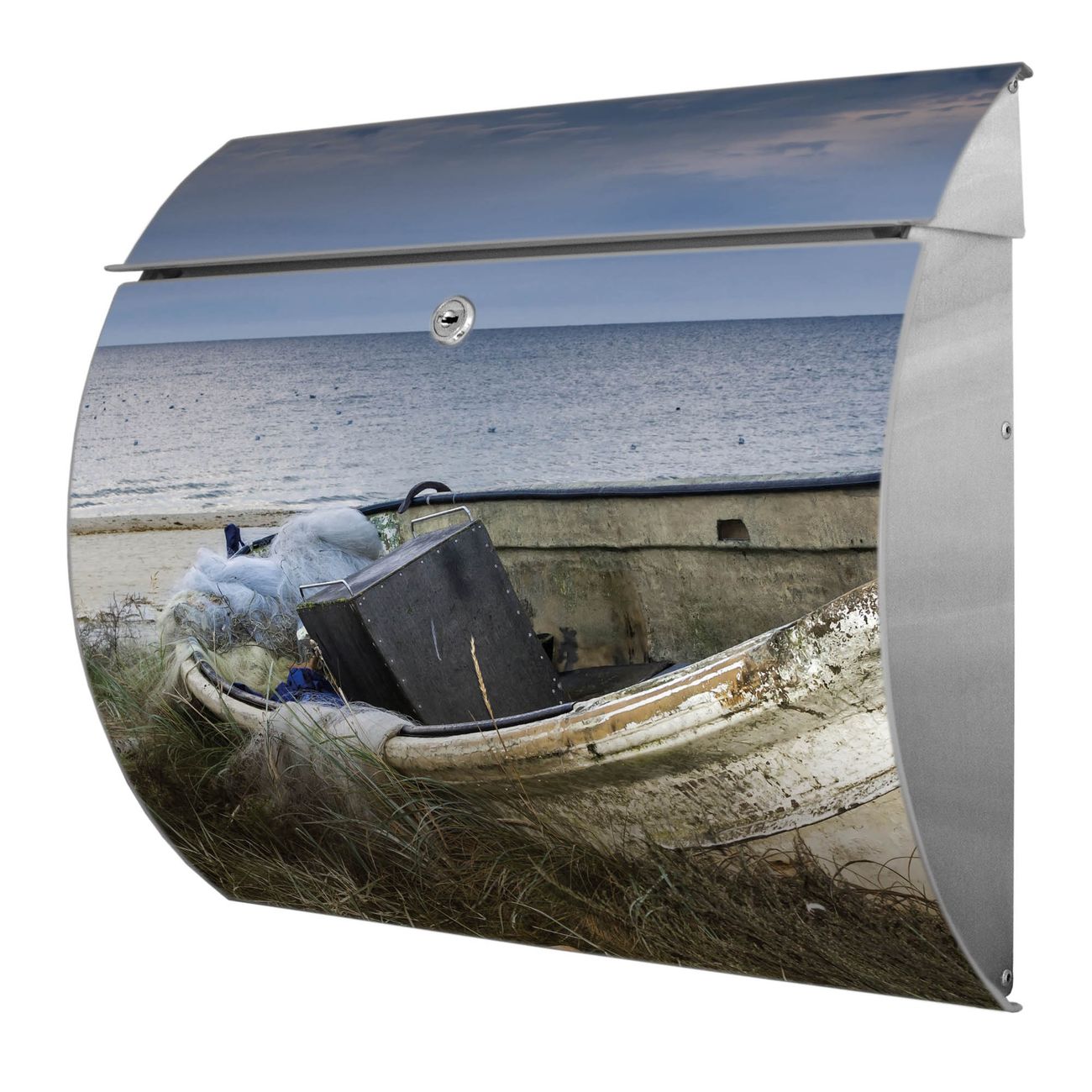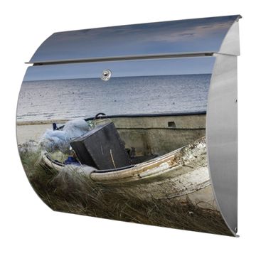 Motiv  Vergessenes Fischerboot Nr. 12085 Material  Edelstahl Dekorfolie  UV-beständig, wetterfest Gesamtgröße  37,6x33x10,6cm BxHxT Briefschlitz  32,5x3,5cm BxH Gewicht  ca. 2,30 kg Zubehör  inkl. Öffnungsstopp, Montagezubehör und 2 Schlüssel