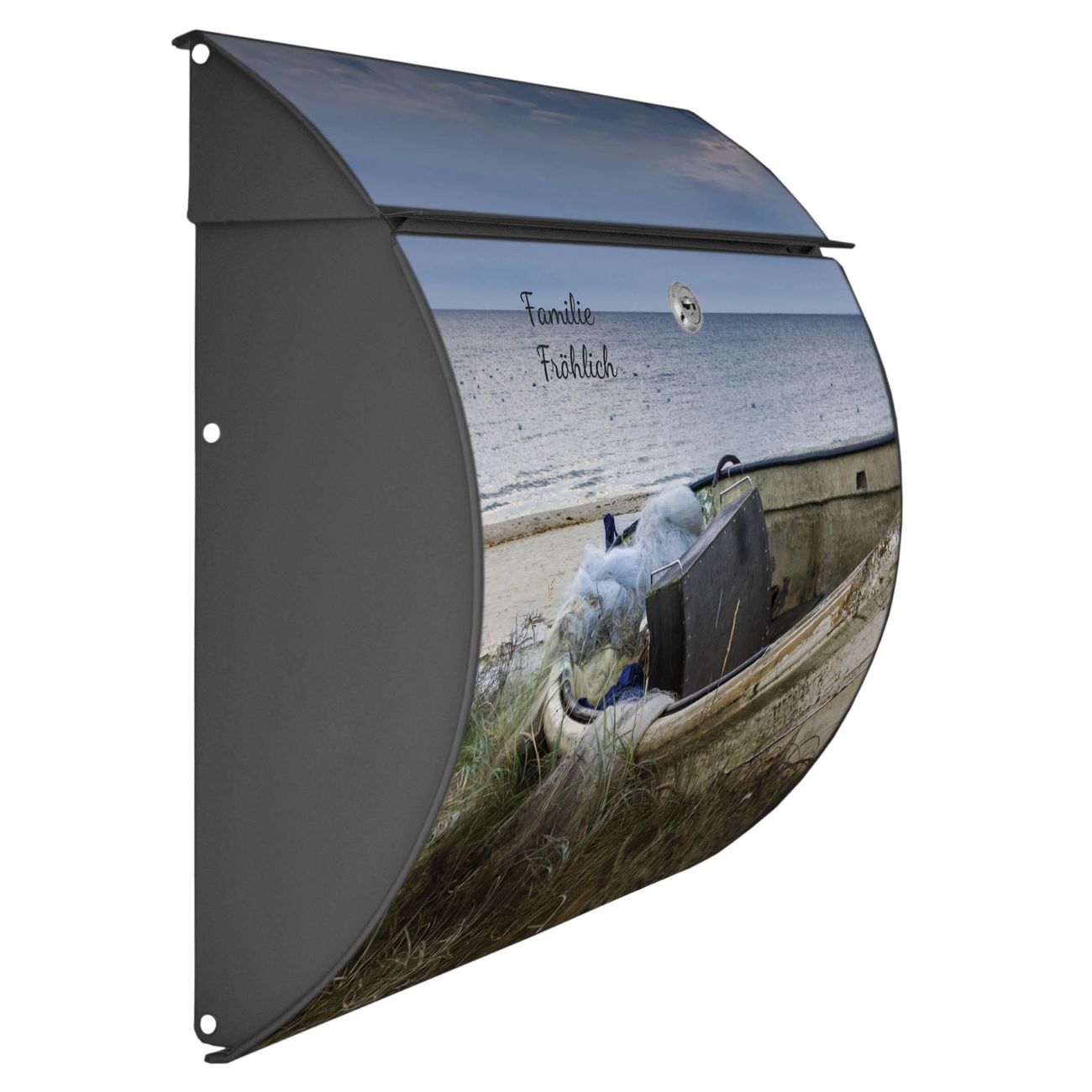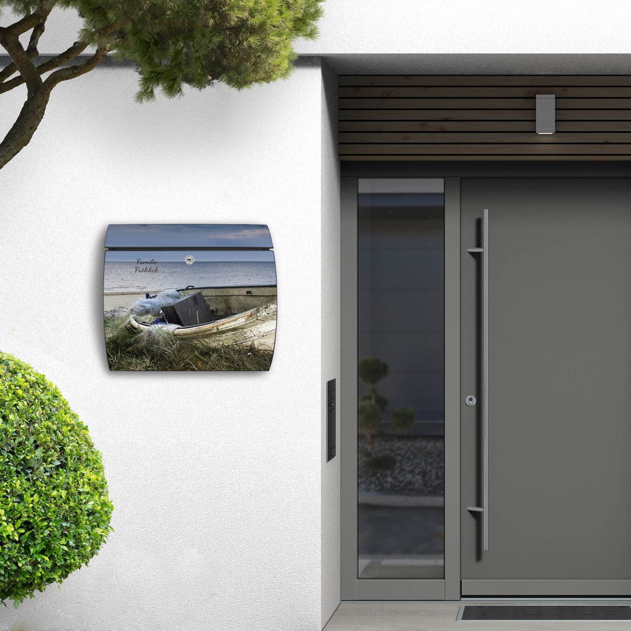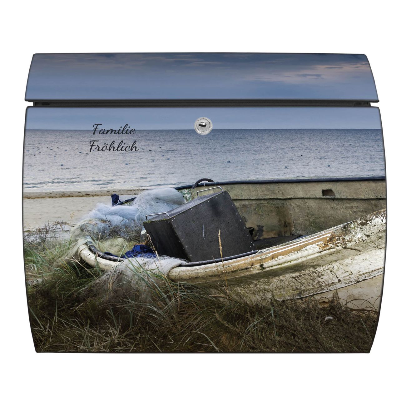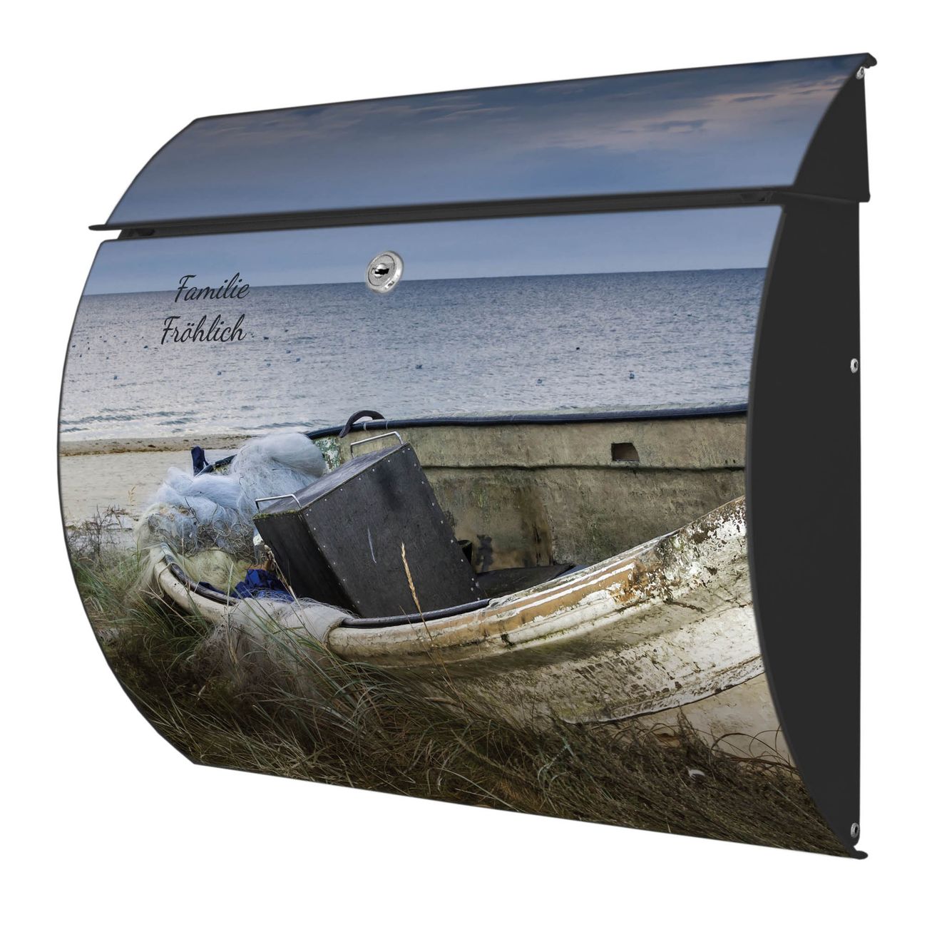 Motiv  Vergessenes Fischerboot Nr. 12085 Material  vollflächig verzinktes und anthrazit lackiert Stahlblech Dekorfolie  UV-beständig, wetterfest Gesamtgröße  37,6x33x10,6cm BxHxT Briefschlitz  32,5x3,5cm BxH Gewicht  ca. 2,50 kg Zubehör  inkl. Öffnungsstopp, Montagezubehör und 2 Schlüssel