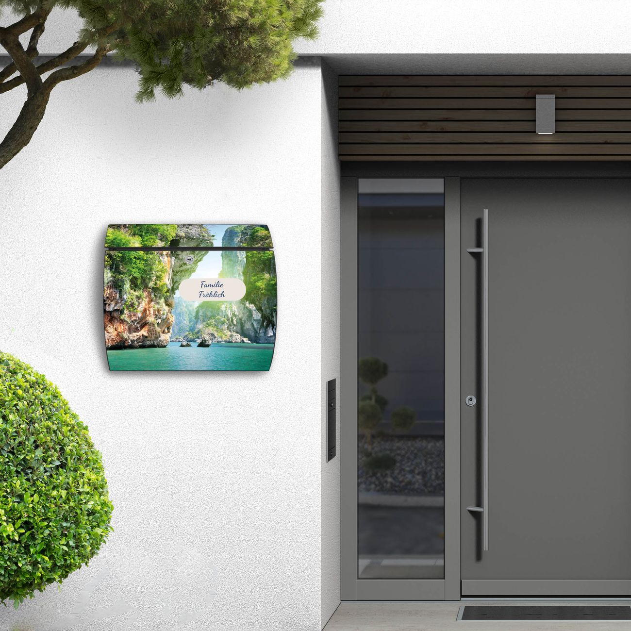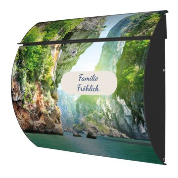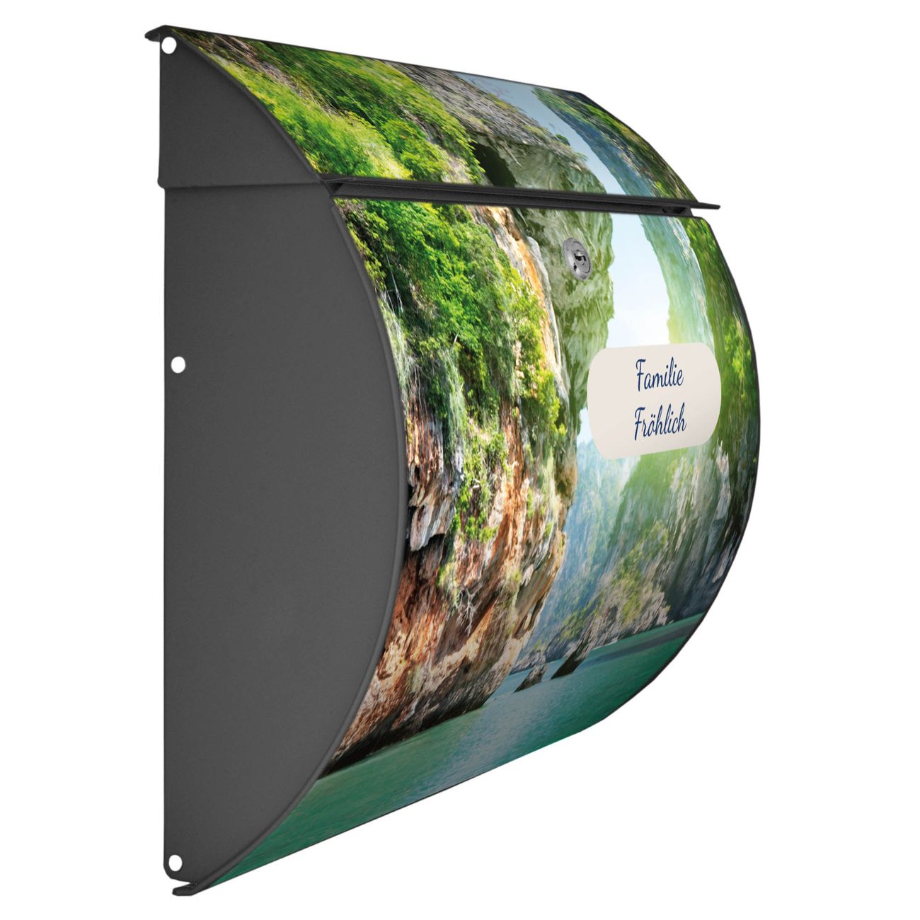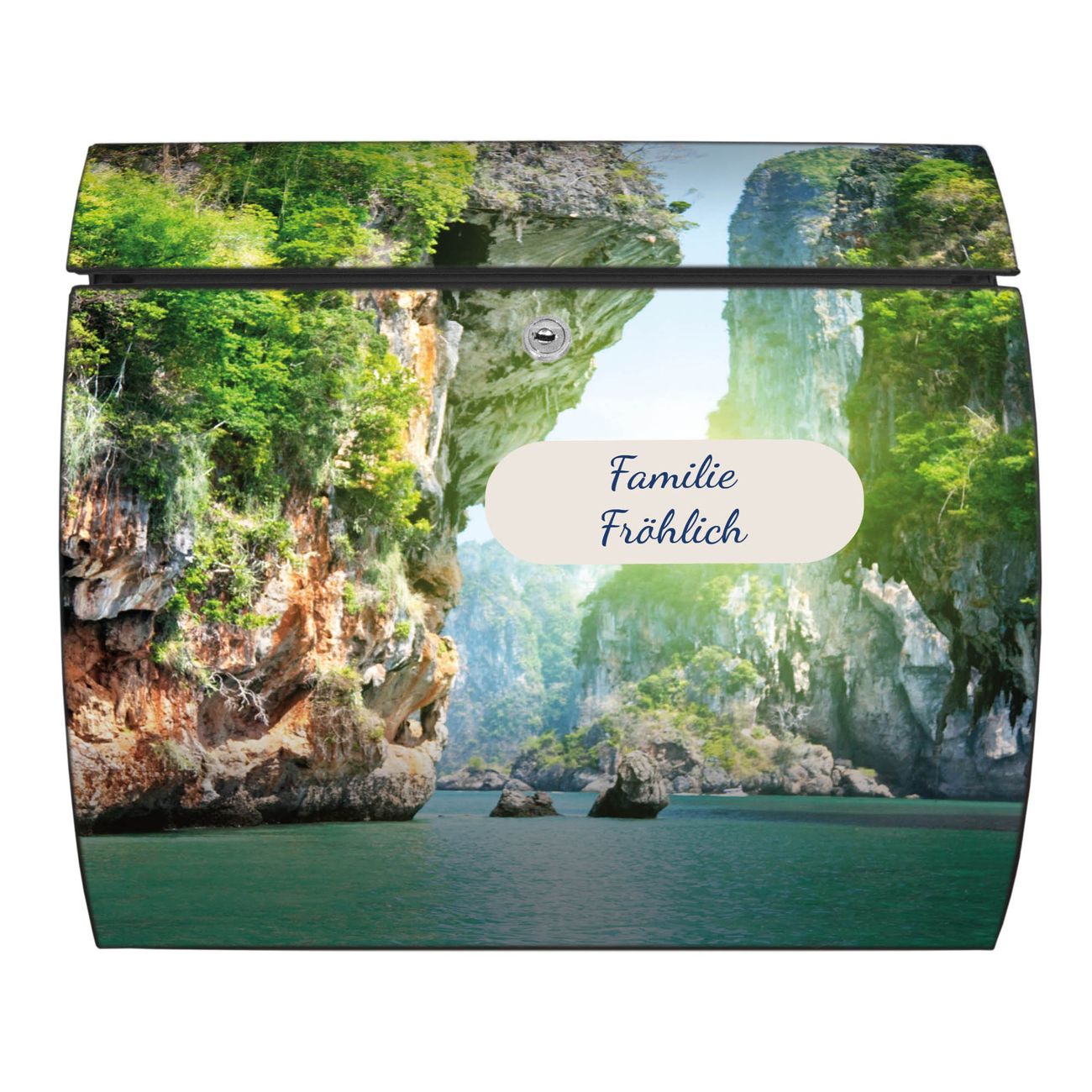 FUNKTION: DESIGN: Das Burg Wächter Modell Toscana mit Motiv Versteckte Bucht hat ein sehr ansprechendes und zeitloses Design und ist besonderes wetterfest. Heben Sie Sich von der tristen grauen Masse ab, ohne auf Funktionalität zu verzichten. Wir bieten Ihnen ebenfalls Namensschilder, bereits beschriftet oder frei zu beschriften, und verschiedene selbst gestaltete Bitte-Keine-Werbung-Aufkleber. DETAILS: Der Postkasten besteht aus vollflächig verzinktem Stahl welcher in Anthrazit oder Weiß lackiert wurde oder aus Edelstahl (je nach gewählter Variante). Das Motiv besteht aus einer wetter- und UV-festen Folie, die mit einem Schutzlaminat überzogen ist, durch die Ihren Briefkasten zusätzlich vor Kratzern geschützt ist und auf den Briefkasten kaschiert wurde. Sie erhalten zu Ihrem neuen Design Briefkasten 2 Schlüssel sowie das passende Montagematerial. BANJADO: Ihr Briefkasten wird von Burg Wächter in Deutschland gefertigt und in unserer kleinen Manufaktur von Hand veredelt. Die Motivfolie ist lösungsmittelfrei und schutzlaminiert, dies sorgt für einen langen Halt. Wir legen großen Wert auf die Verbindung von Funktionalität und Design. Sie erhalten besondere Handarbeit aus Sachsen und Made in Germany.