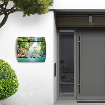 Der geschwungene Burg Wächter Briefkasten Toscana mit Motiv Versteckte Bucht bietet Ihnen mit seinem großen Fassungsvermögen genügend Platz auch für große A4 Sendungen. Auf Wunsch können Sie bei uns den passenden Standfuß bestellen und so aus dem Wandbriefkasten einen Standbriefkasten machen. Der integrierte Öffnungsstopp ermöglicht eine einfache Handhabung beim Entnehmen der Post.