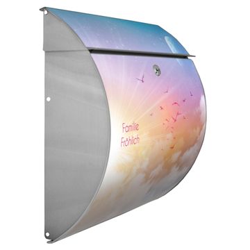 FUNKTION: DESIGN: Das Burg Wächter Modell Toscana mit Motiv Vögel am Himmel hat ein sehr ansprechendes und zeitloses Design und ist besonderes wetterfest. Heben Sie Sich von der tristen grauen Masse ab, ohne auf Funktionalität zu verzichten. Wir bieten Ihnen ebenfalls Namensschilder, bereits beschriftet oder frei zu beschriften, und verschiedene selbst gestaltete Bitte-Keine-Werbung-Aufkleber. DETAILS: Der Postkasten besteht aus vollflächig verzinktem Stahl welcher in Anthrazit oder Weiß lackiert wurde oder aus Edelstahl (je nach gewählter Variante). Das Motiv besteht aus einer wetter- und UV-festen Folie, die mit einem Schutzlaminat überzogen ist, durch die Ihren Briefkasten zusätzlich vor Kratzern geschützt ist und auf den Briefkasten kaschiert wurde. Sie erhalten zu Ihrem neuen Design Briefkasten 2 Schlüssel sowie das passende Montagematerial. BANJADO: Ihr Briefkasten wird von Burg Wächter in Deutschland gefertigt und in unserer kleinen Manufaktur von Hand veredelt. Die Motivfolie ist lösungsmittelfrei und schutzlaminiert, dies sorgt für einen langen Halt. Wir legen großen Wert auf die Verbindung von Funktionalität und Design. Sie erhalten besondere Handarbeit aus Sachsen und Made in Germany.