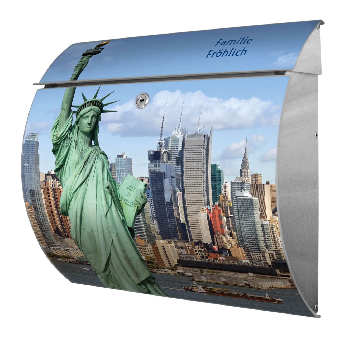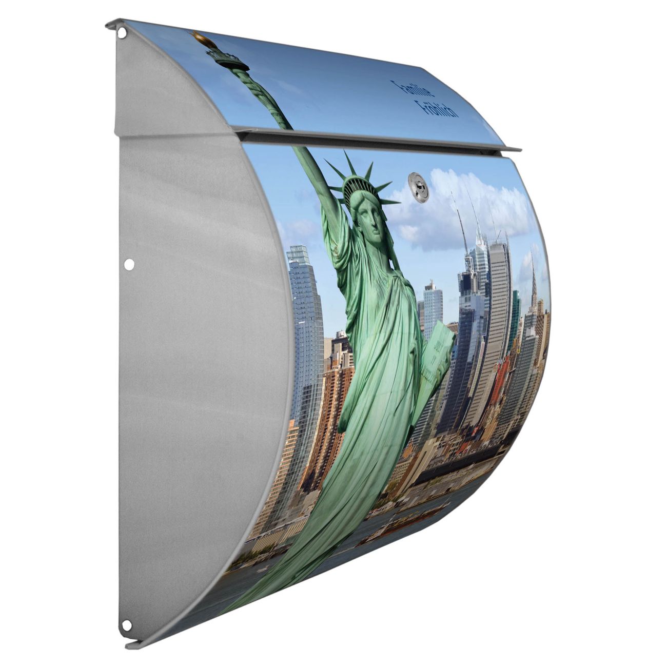 Der geschwungene Burg Wächter Briefkasten Toscana mit Motiv Welcome To NY bietet Ihnen mit seinem großen Fassungsvermögen genügend Platz auch für große A4 Sendungen. Auf Wunsch können Sie bei uns den passenden Standfuß bestellen und so aus dem Wandbriefkasten einen Standbriefkasten machen. Der integrierte Öffnungsstopp ermöglicht eine einfache Handhabung beim Entnehmen der Post.
