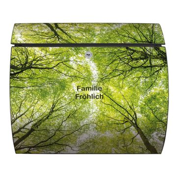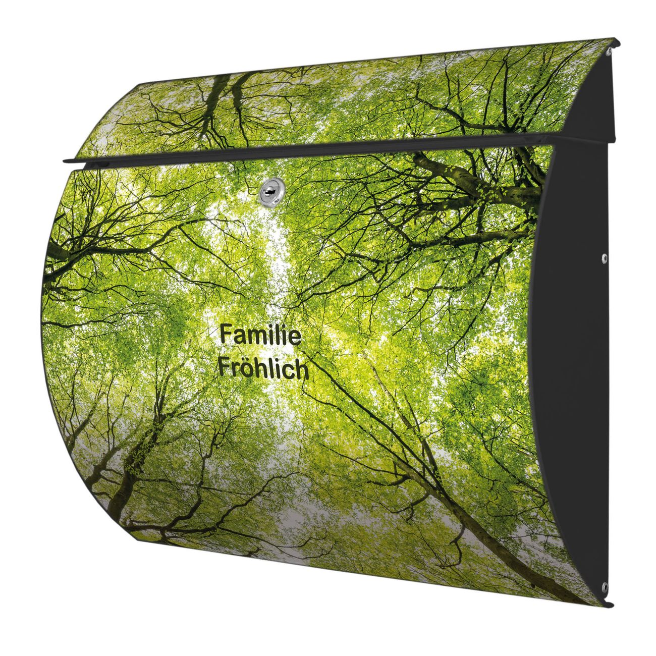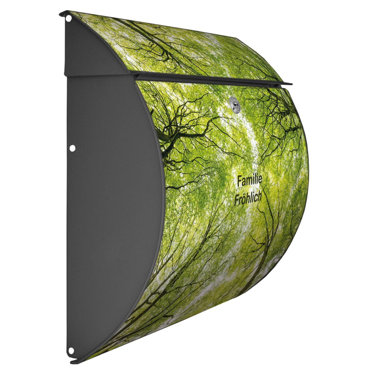 Motiv  Zwischen Bäumen Nr. 12873 Material  vollflächig verzinktes und anthrazit lackiert Stahlblech Dekorfolie  UV-beständig, wetterfest Gesamtgröße  37,6x33x10,6cm BxHxT Briefschlitz  32,5x3,5cm BxH Gewicht  ca. 2,50 kg Zubehör  inkl. Öffnungsstopp, Montagezubehör und 2 Schlüssel