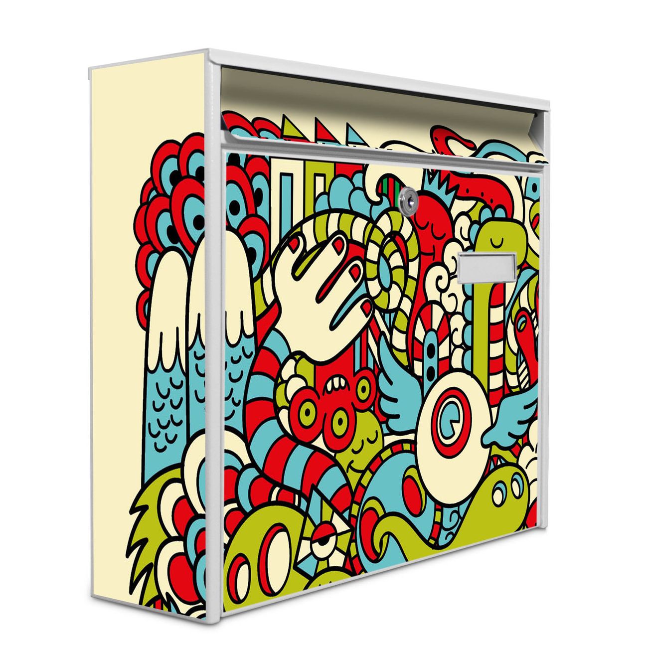 Der Burg Wächter Mail Briefkasten mit Motiv Birds Worms Freaks bietet Ihnen mit seinem Fassungsvermögen genügend Platz auch für große A4 Sendungen. Auf Wunsch können Sie bei uns den passenden Standfuß kaufen und so aus dem Wandbriefkasten einen Standbriefkasten machen. Wir bieten Ihnen ebenfalls Namensschilder, bereits beschriftet oder frei zu beschriften, und verschiedene selbst gestaltete Bitte-Keine-Werbung-Aufkleber.