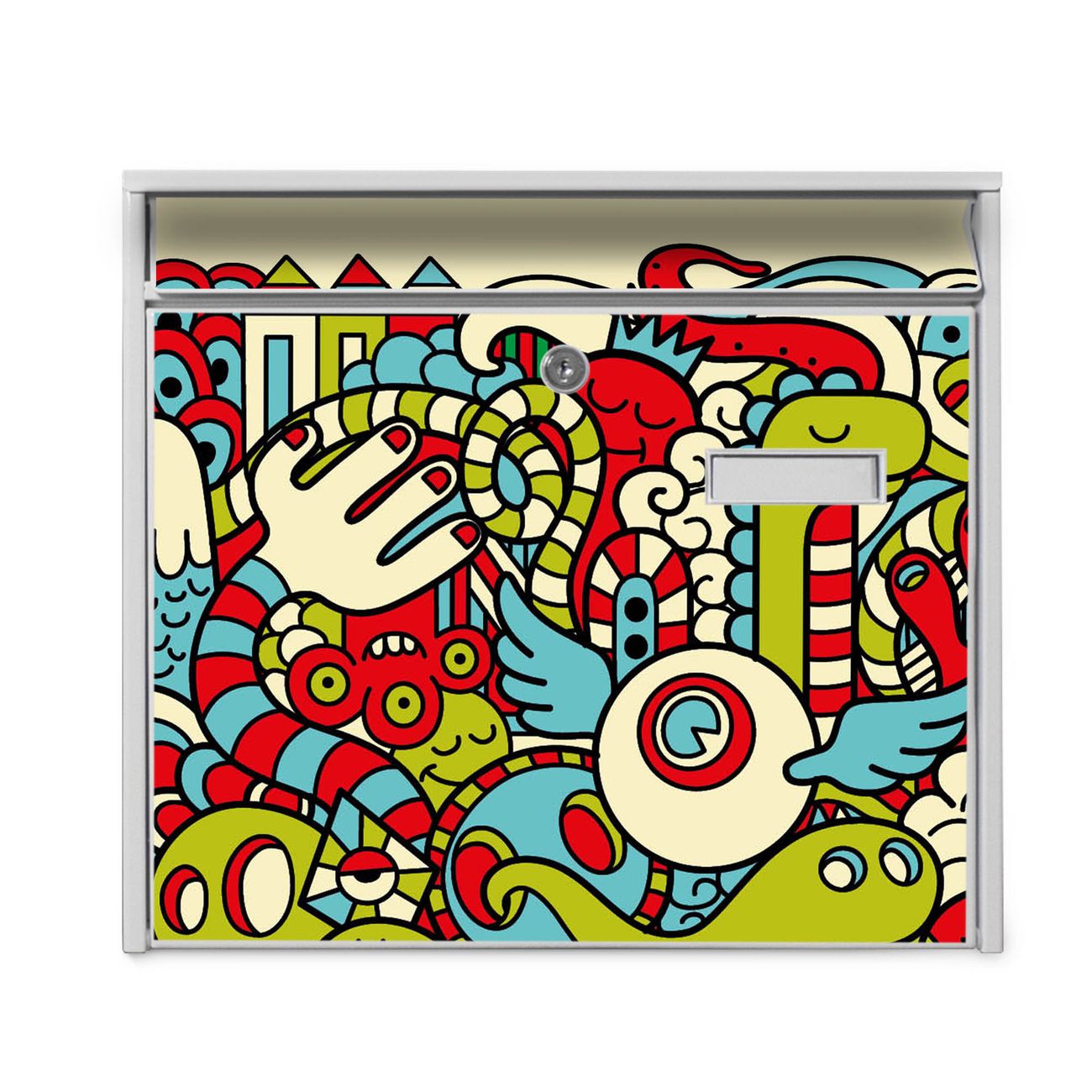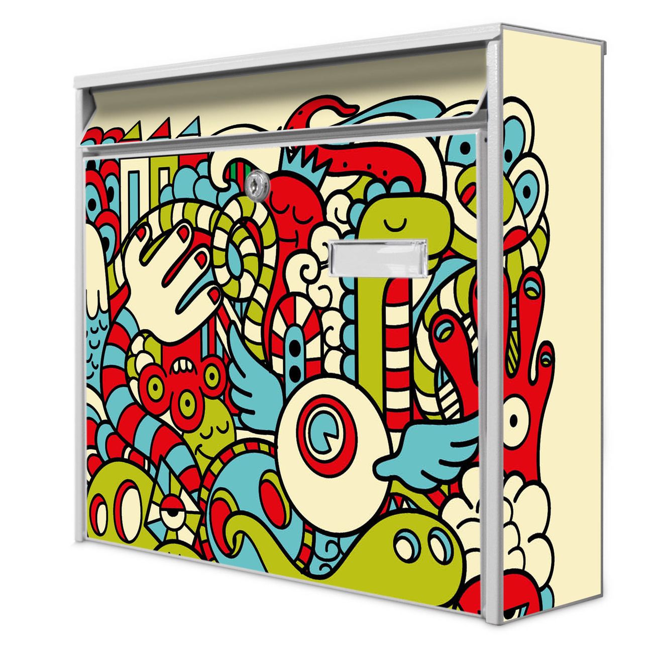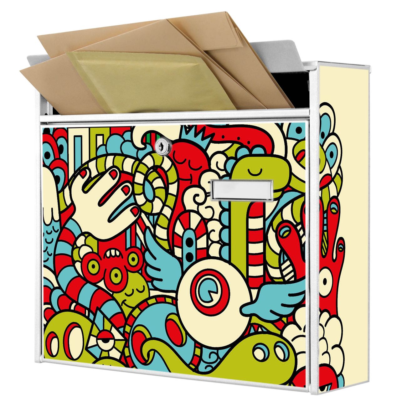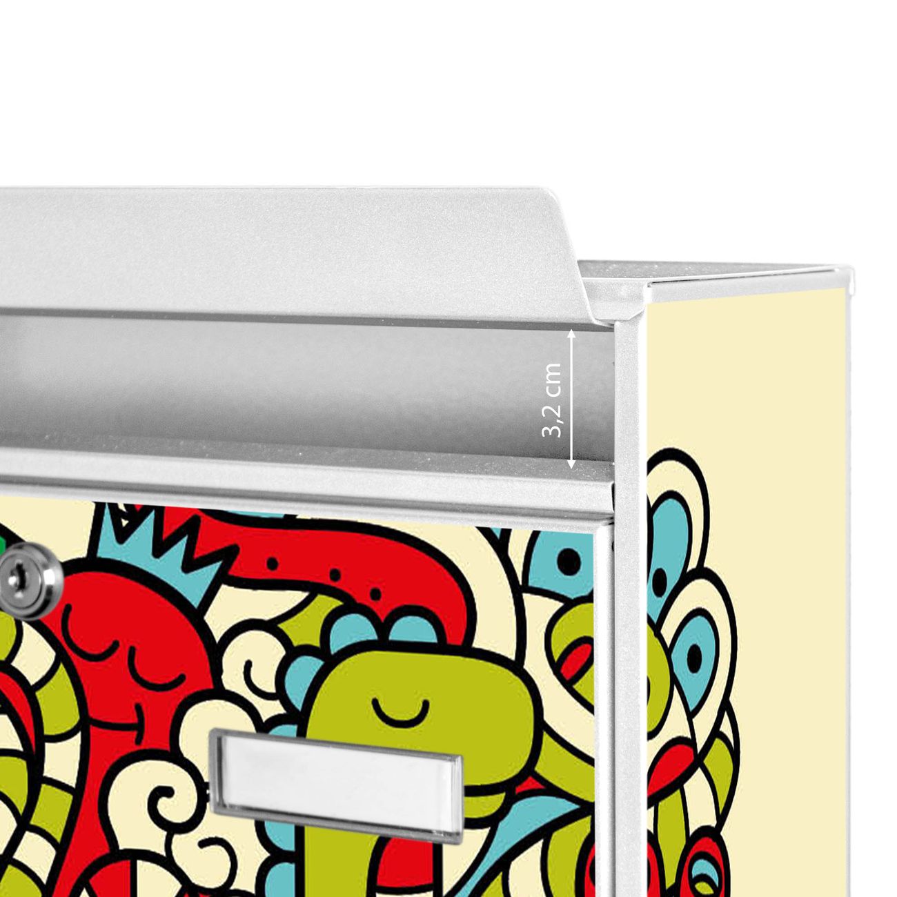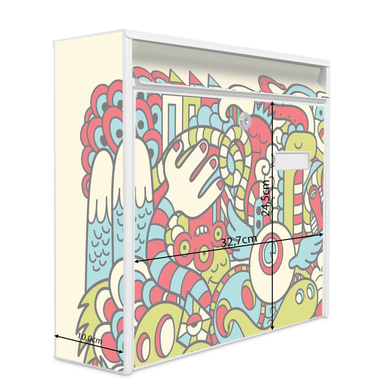 Die Größe des Briefkastens ist 36 x 32 x 10cm (BxHxT) groß. Das Motiv besteht aus einer wetter- und UV-festen Folie, die mit einem Schutzlaminat überzogen ist und Ihren Briefkasten zusätzlich vor Kratzern schützt. Sie erhalten 2 Schlüssel sowie das Montagematerial.