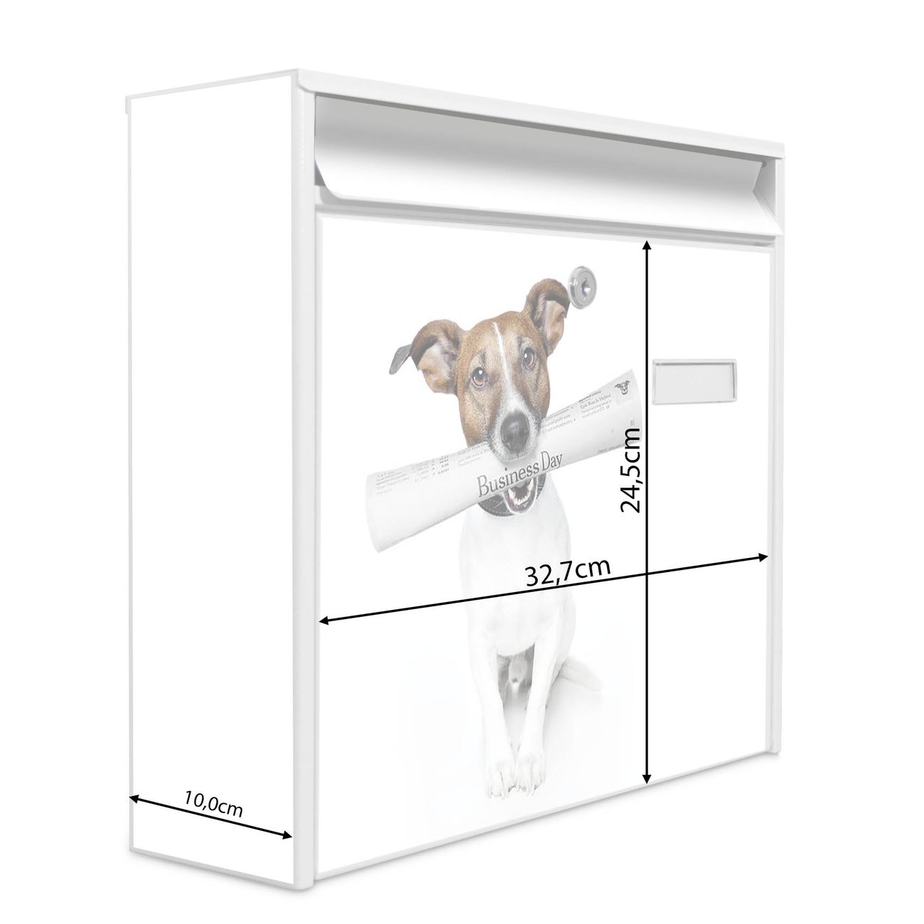 Die Größe des Briefkastens ist 36 x 32 x 10cm (BxHxT) groß. Das Motiv besteht aus einer wetter- und UV-festen Folie, die mit einem Schutzlaminat überzogen ist und Ihren Briefkasten zusätzlich vor Kratzern schützt. Sie erhalten 2 Schlüssel sowie das Montagematerial.
