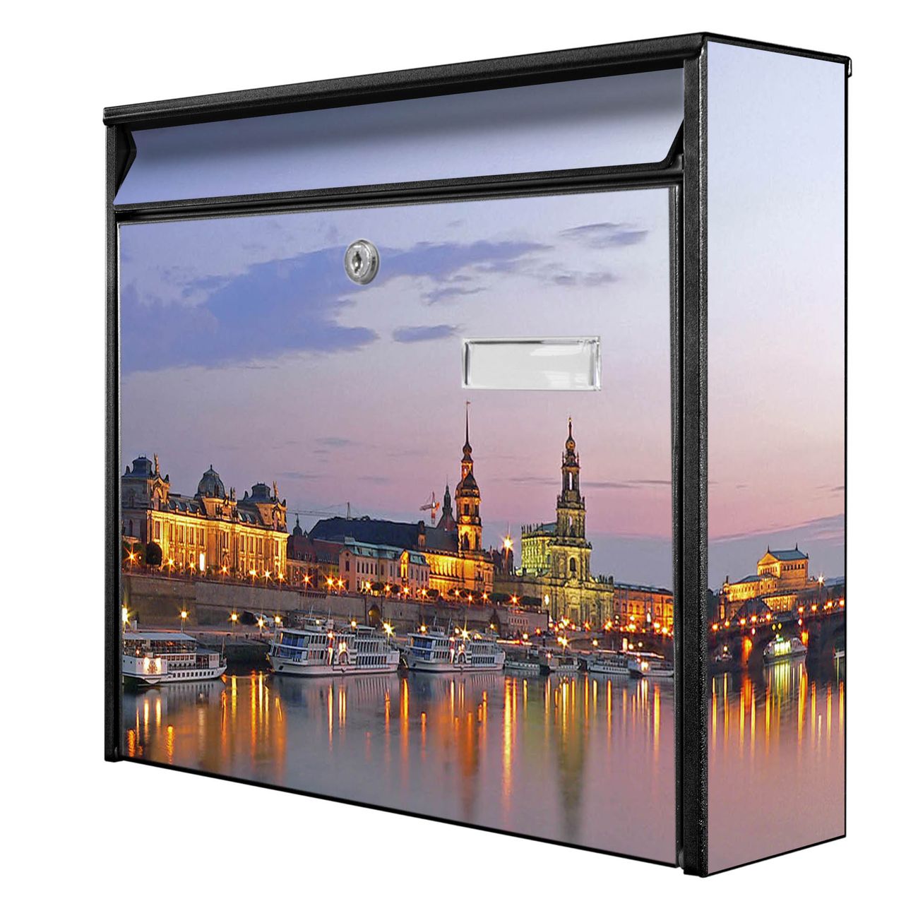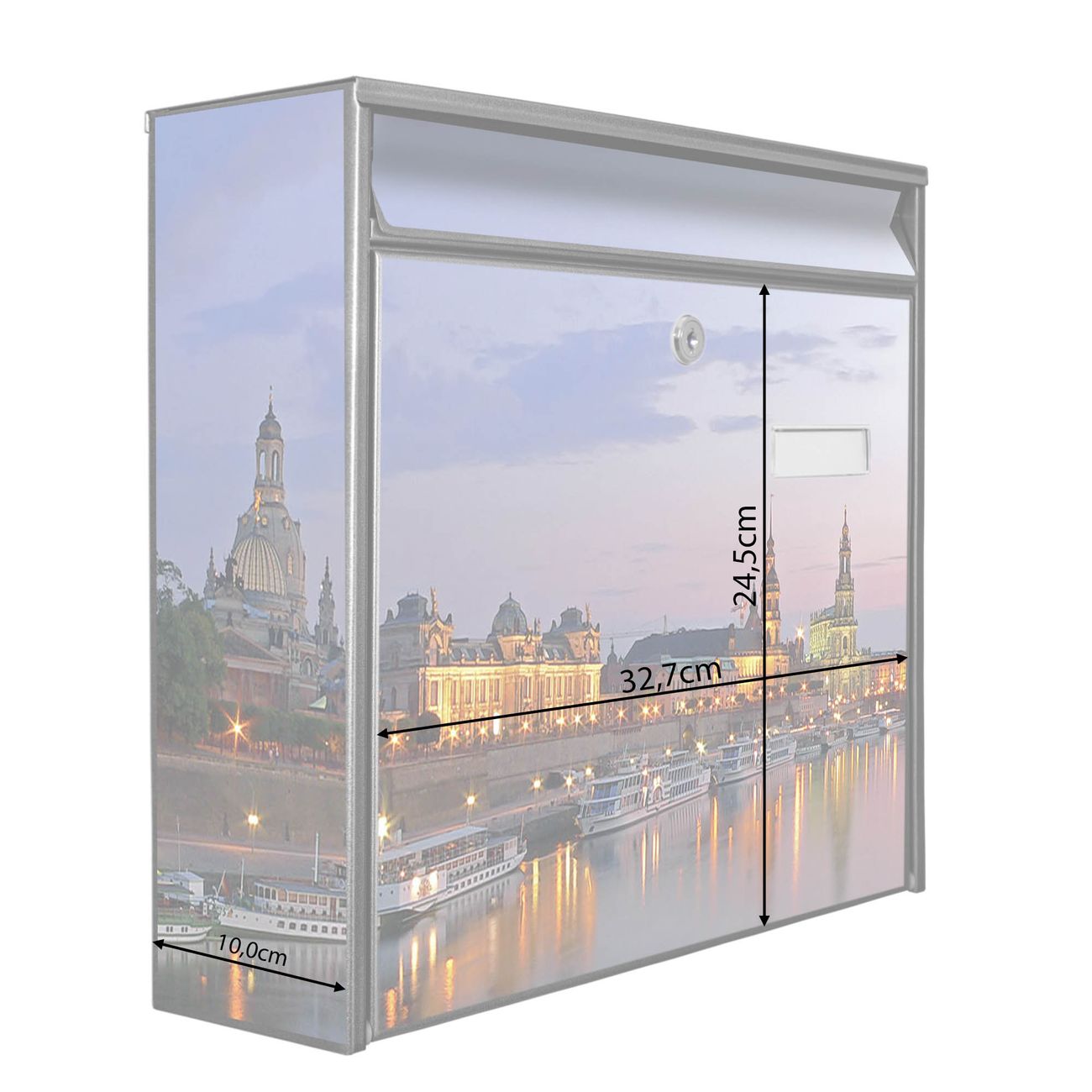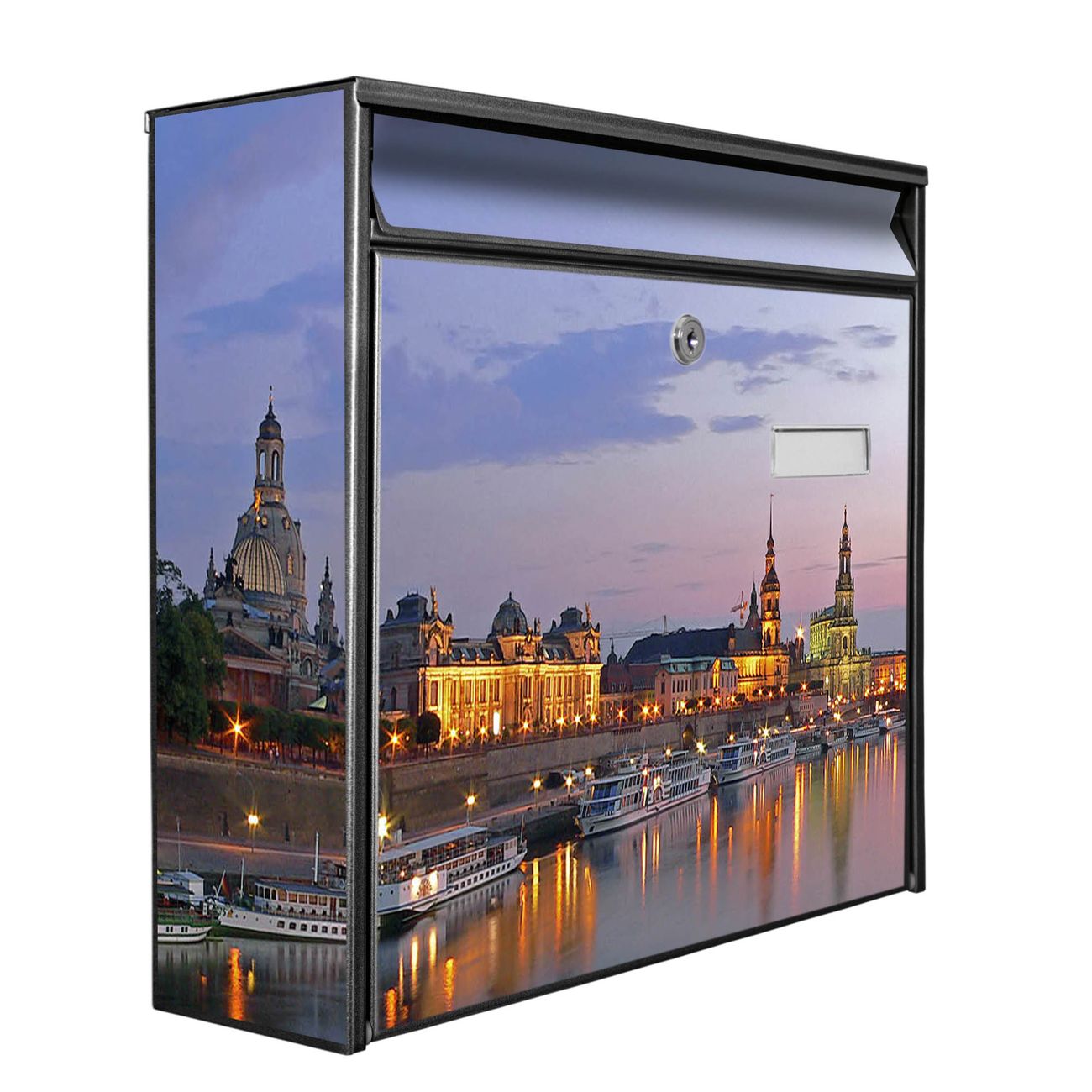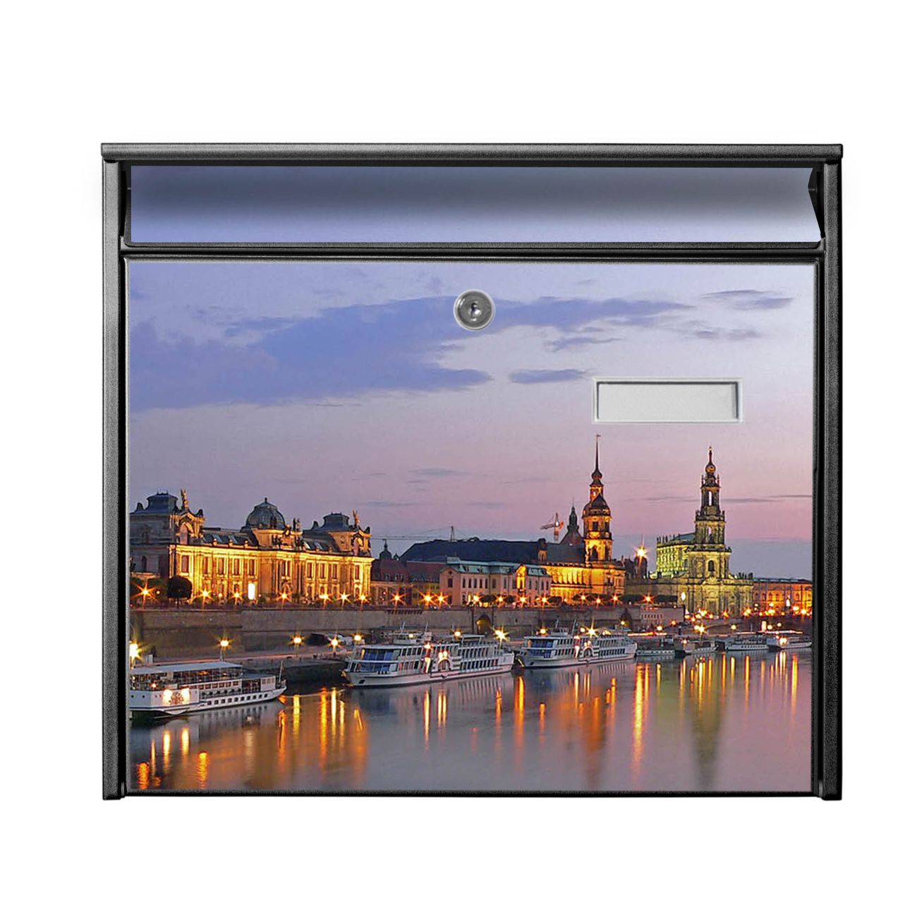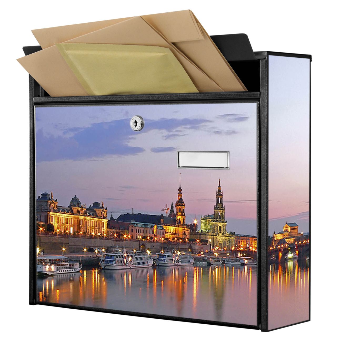 Der Postkasten mit Motiv Dresden hat ein sehr ansprechendes und zeitloses Design. Heben Sie Sich von der tristen grauen Masse ab, ohne auf Funktionalität zu verzichten. Die weite Öffnung ohne scharfe Kanten ermöglicht eine einfache Handhabung beim Entnehmen der Post. Die Größe bietet genügend Platz für Sendungen aller Art, der Einwurf fasst auch größere A4 Sendungen. Ihr Burg-Wächter Motivbriefkasten wird in Sachsen in einer kleinen Manufaktur von Hand veredelt. Die Motivfolie ist lösungsmittelfrei und schutzlaminiert, dies sorgt für einen langen Halt. Wir legen großen Wert auf die Verbindung von Funktionalität und Design.
