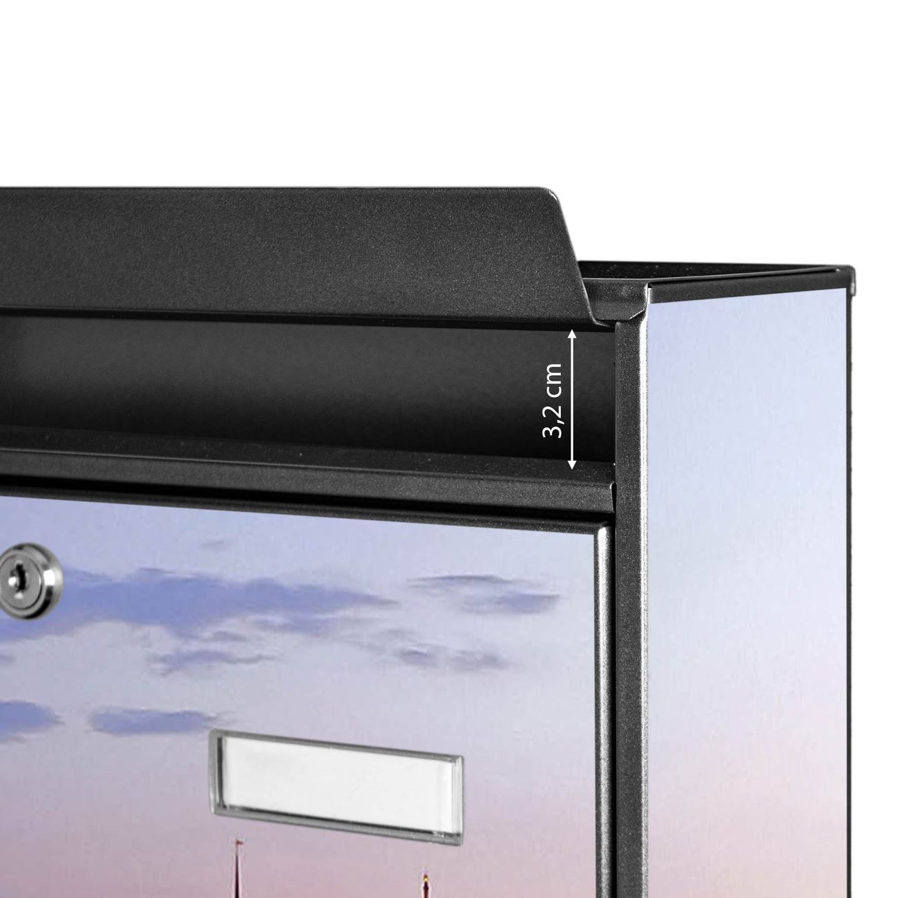 Die Größe des Briefkastens ist 36 x 32 x 10cm (BxHxT) groß. Das Motiv besteht aus einer wetter- und UV-festen Folie, die mit einem Schutzlaminat überzogen ist und Ihren Briefkasten zusätzlich vor Kratzern schützt. Sie erhalten 2 Schlüssel sowie das Montagematerial.