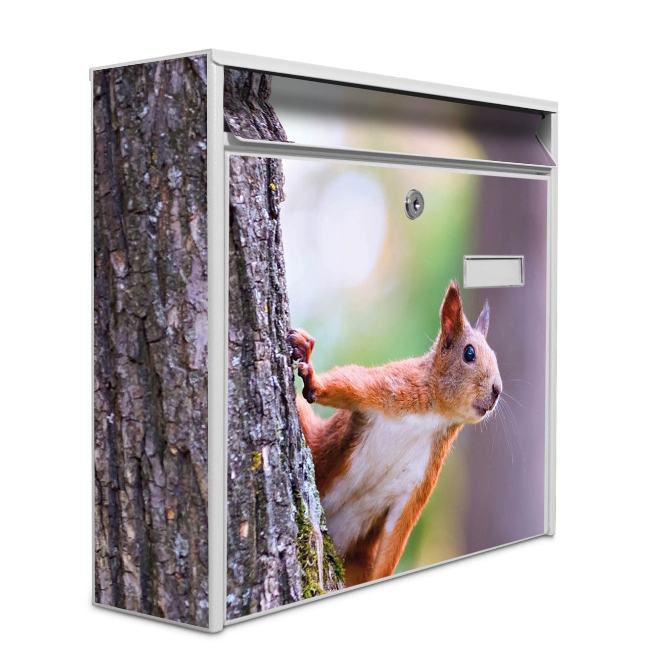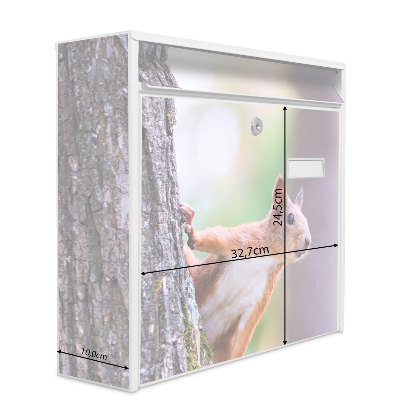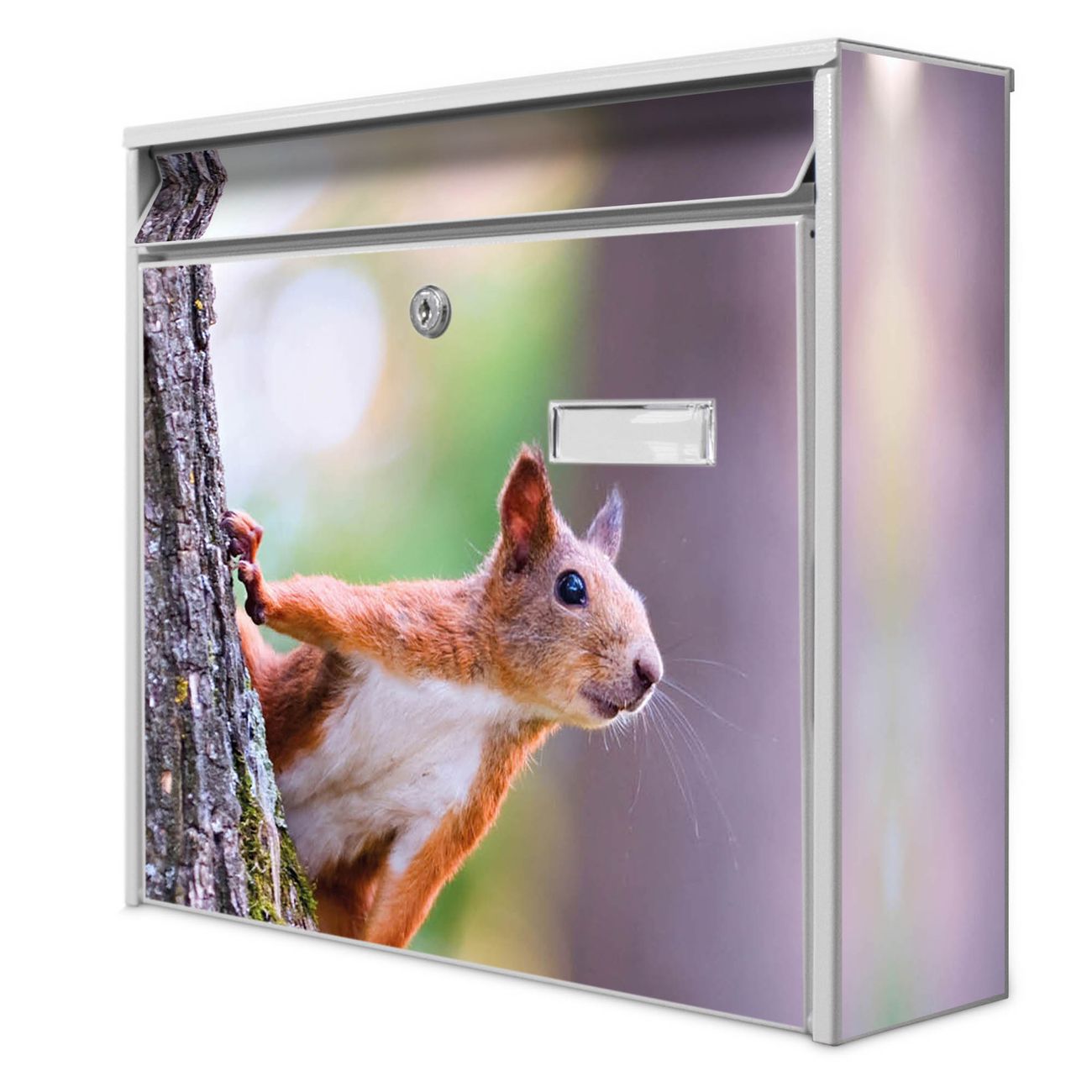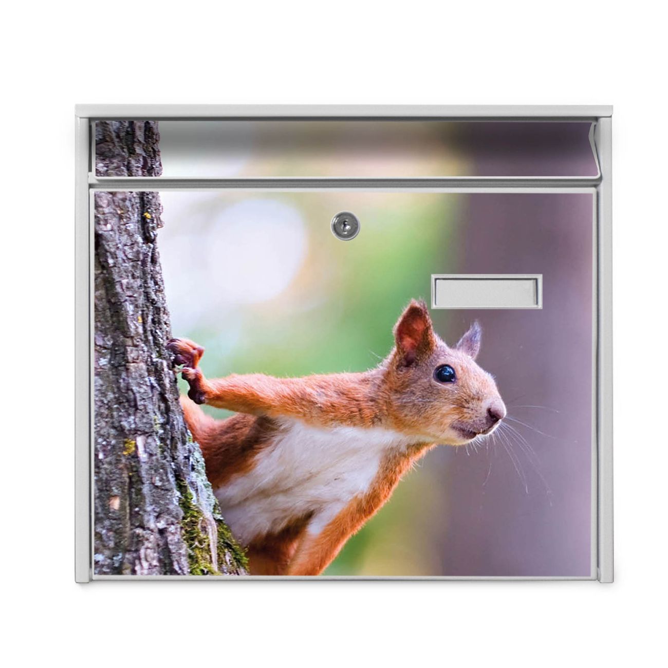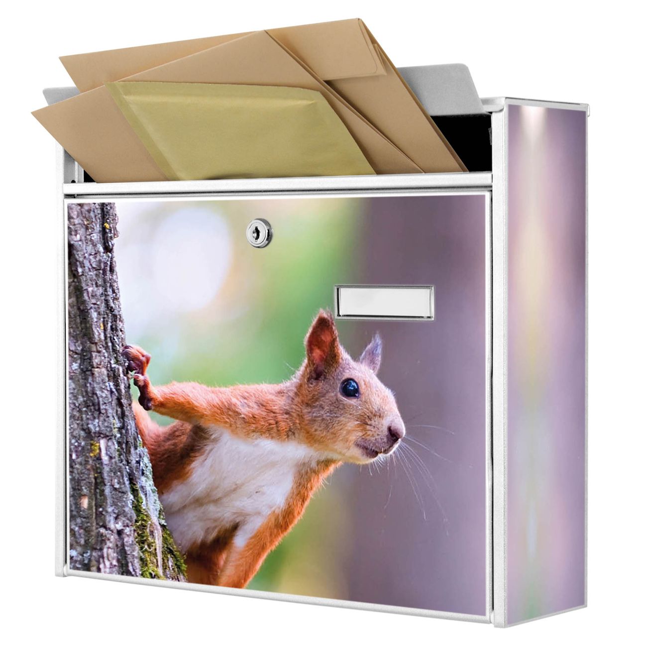 Der Burg Wächter Mail Briefkasten mit Motiv Eichhörnchen bietet Ihnen mit seinem Fassungsvermögen genügend Platz auch für große A4 Sendungen. Auf Wunsch können Sie bei uns den passenden Standfuß kaufen und so aus dem Wandbriefkasten einen Standbriefkasten machen. Wir bieten Ihnen ebenfalls Namensschilder, bereits beschriftet oder frei zu beschriften, und verschiedene selbst gestaltete Bitte-Keine-Werbung-Aufkleber.