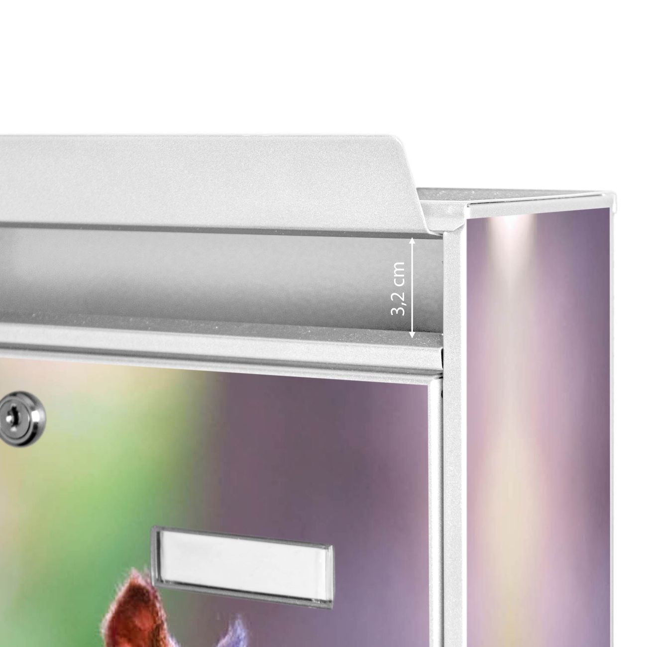 Die Größe des Briefkastens ist 36 x 32 x 10cm (BxHxT) groß. Das Motiv besteht aus einer wetter- und UV-festen Folie, die mit einem Schutzlaminat überzogen ist und Ihren Briefkasten zusätzlich vor Kratzern schützt. Sie erhalten 2 Schlüssel sowie das Montagematerial.