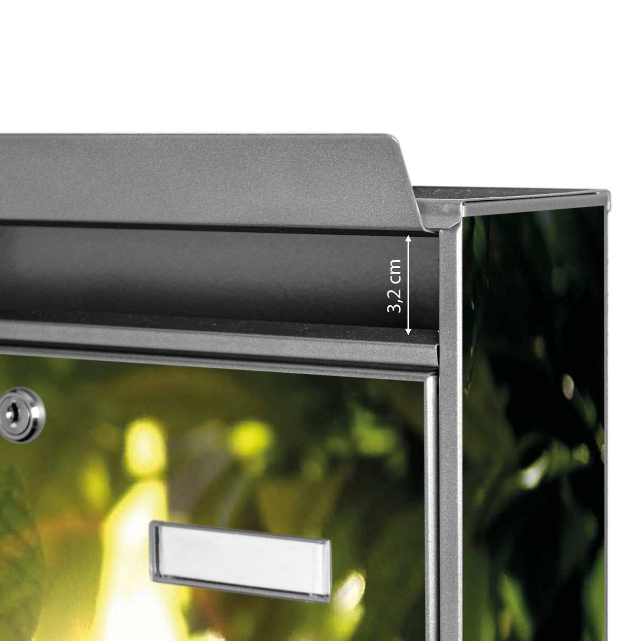 Die Größe des Briefkastens ist 36 x 32 x 10cm (BxHxT) groß. Das Motiv besteht aus einer wetter- und UV-festen Folie, die mit einem Schutzlaminat überzogen ist und Ihren Briefkasten zusätzlich vor Kratzern schützt. Sie erhalten 2 Schlüssel sowie das Montagematerial.
