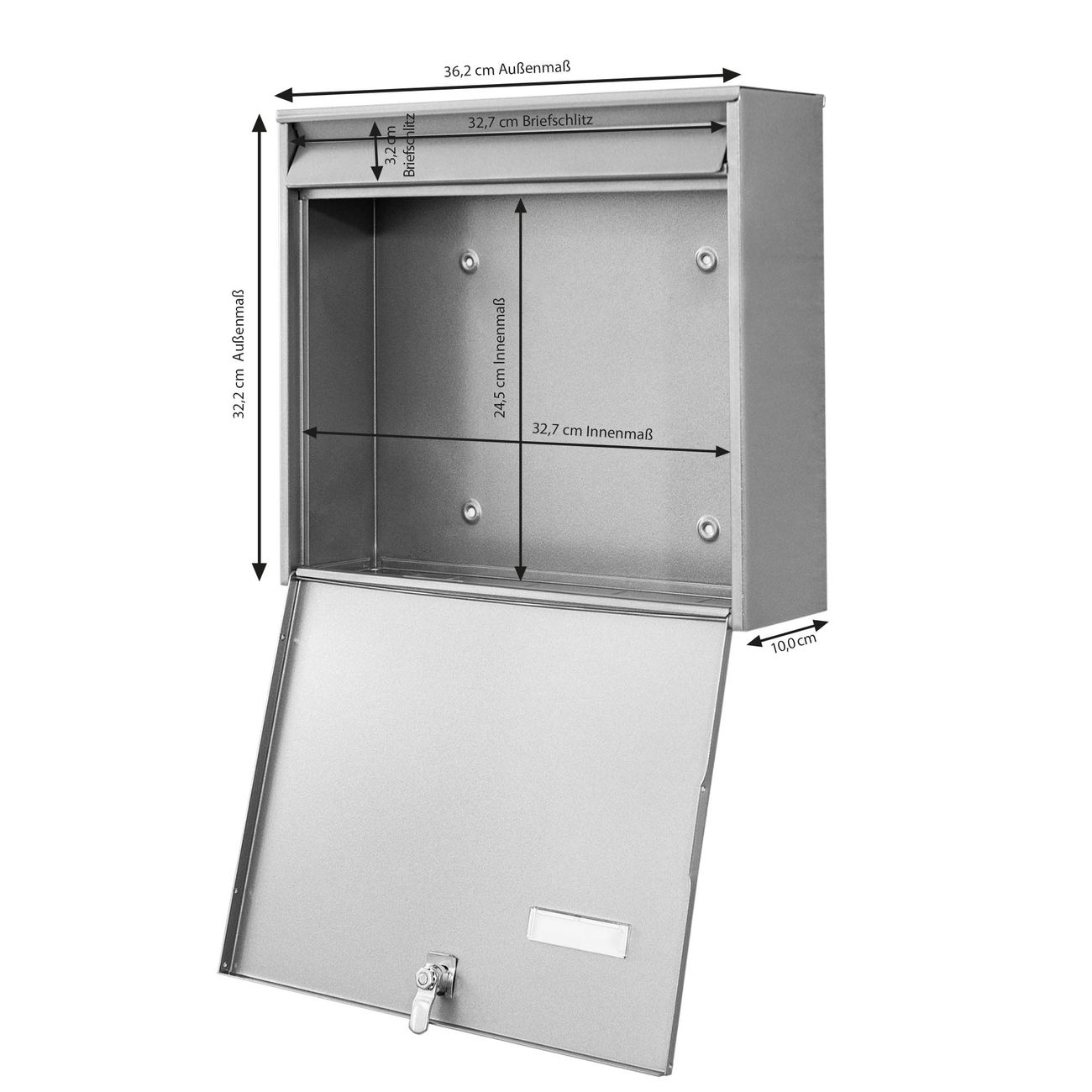 Der Briefkasten besteht aus hochwertig verzinktem Stahl und wird dann silberfarben lackiert.