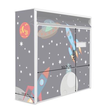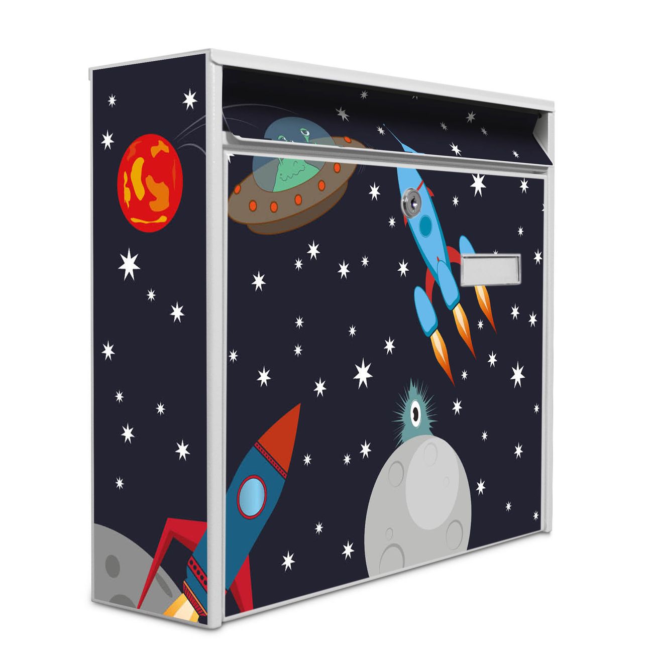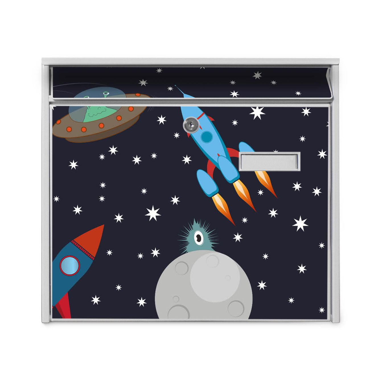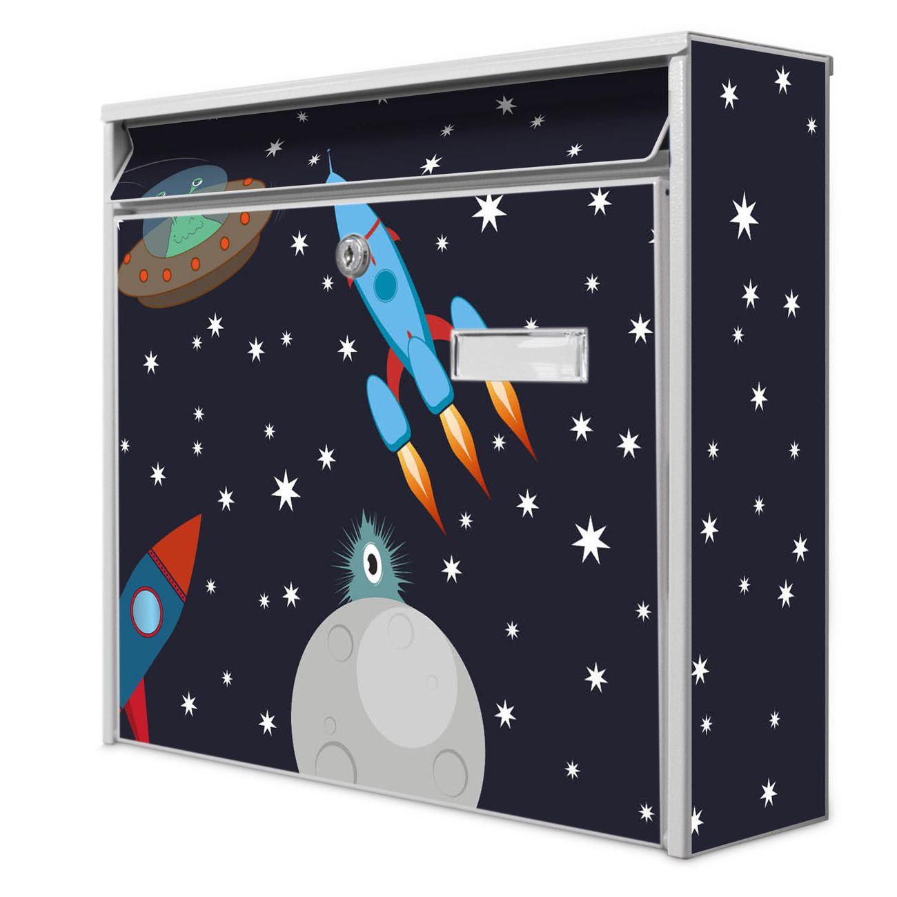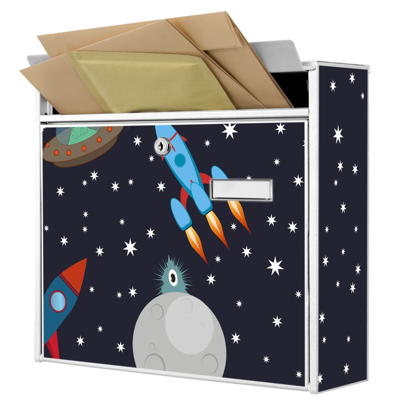 Der Burg Wächter Mail Briefkasten mit Motiv Space Traffic bietet Ihnen mit seinem Fassungsvermögen genügend Platz auch für große A4 Sendungen. Auf Wunsch können Sie bei uns den passenden Standfuß kaufen und so aus dem Wandbriefkasten einen Standbriefkasten machen. Wir bieten Ihnen ebenfalls Namensschilder, bereits beschriftet oder frei zu beschriften, und verschiedene selbst gestaltete Bitte-Keine-Werbung-Aufkleber.