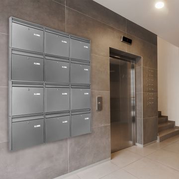 Die Briefkastenanlage besteht aus 6 einzelnen Briefkästen und ist komplett 108,8 x 64,5 x 10cm groß, besteht aus silber-grau pulverbeschichtetem Stahl und wiegt zusammen ca. 18kg. Da die Briefkästen einzeln angebracht werden, können Sie frei wählen, wie diese hängen sollen. Sie erhalten zu jedem einzelnen Kasten zwei Schlüssel sowie passendes Montagematerial.