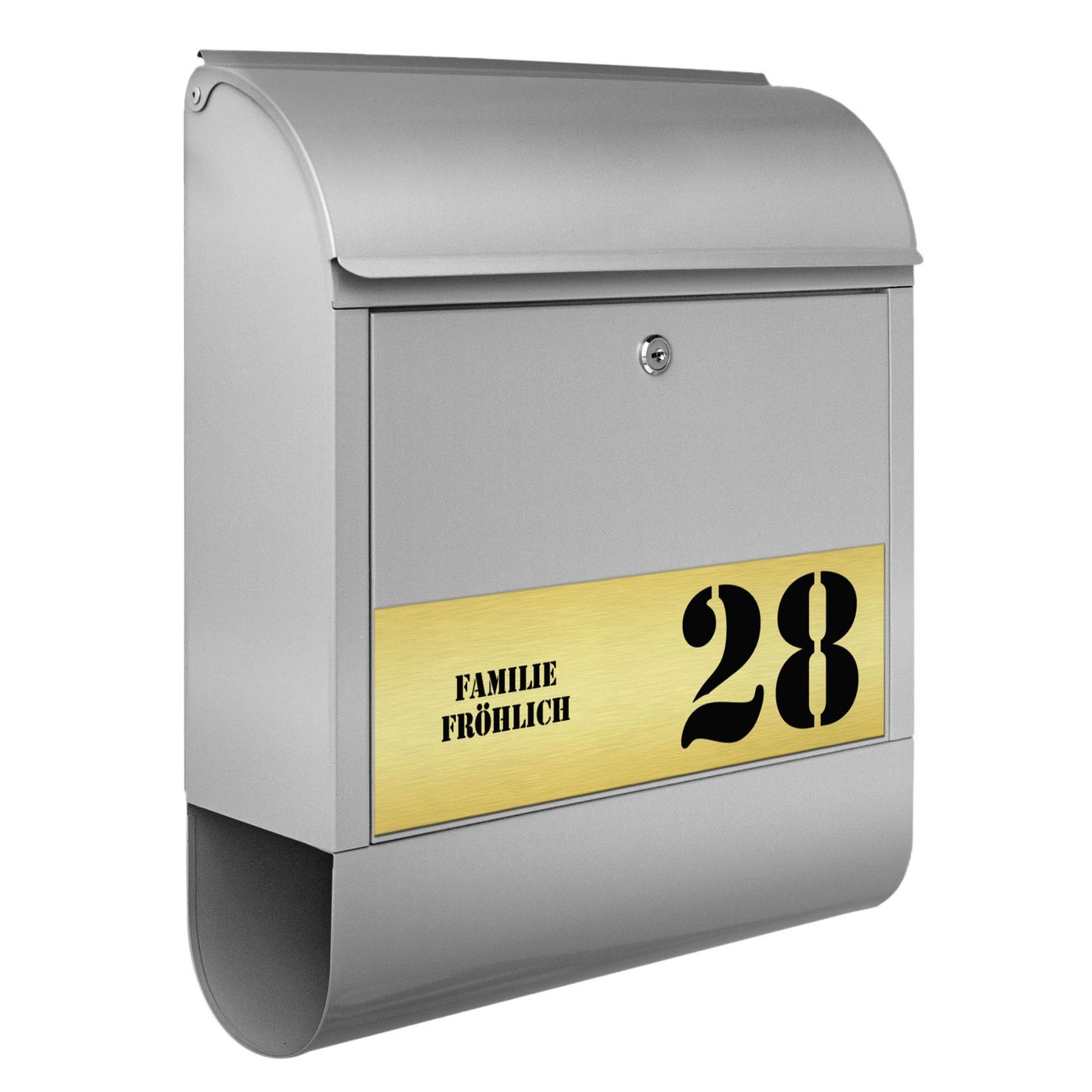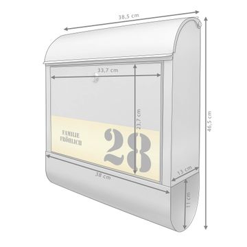 Der Postkasten besteht aus pulverbeschichtetem Stahl. Er ist 38x47x13cm groß. Die Gravur Platte besteht aus einem Laminat auf Acrylbasis mit authentisch metallischem Erscheinungsbild und ist wetter- sowie UV-resistent. Diese wir bereits von uns fest mit dem Briefkasten verklebt. Der Briefkasten wird mit Montagematerial, zwei Schlüsseln sowie einer Bohrschablone geliefert. Sie können diesen Briefkasten sowohl als Wandbriefkasten montieren oder einen passenden Briefkastenstandfuß kaufen und als Standbriefkasten einbetonieren. Auch für die Montage an einem Zaun bieten wir das passende Zubehör an. Die Größe bietet genügend Platz für Sendungen aller Art, der Einwurf fasst auch größere A4 Sendungen.