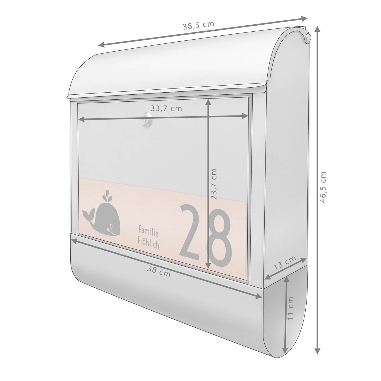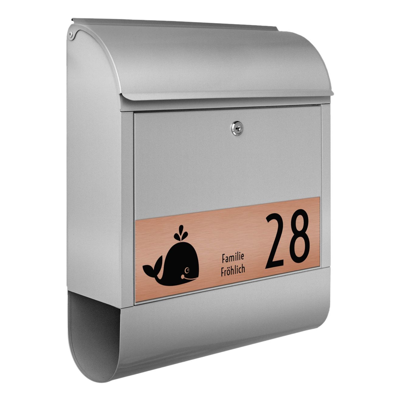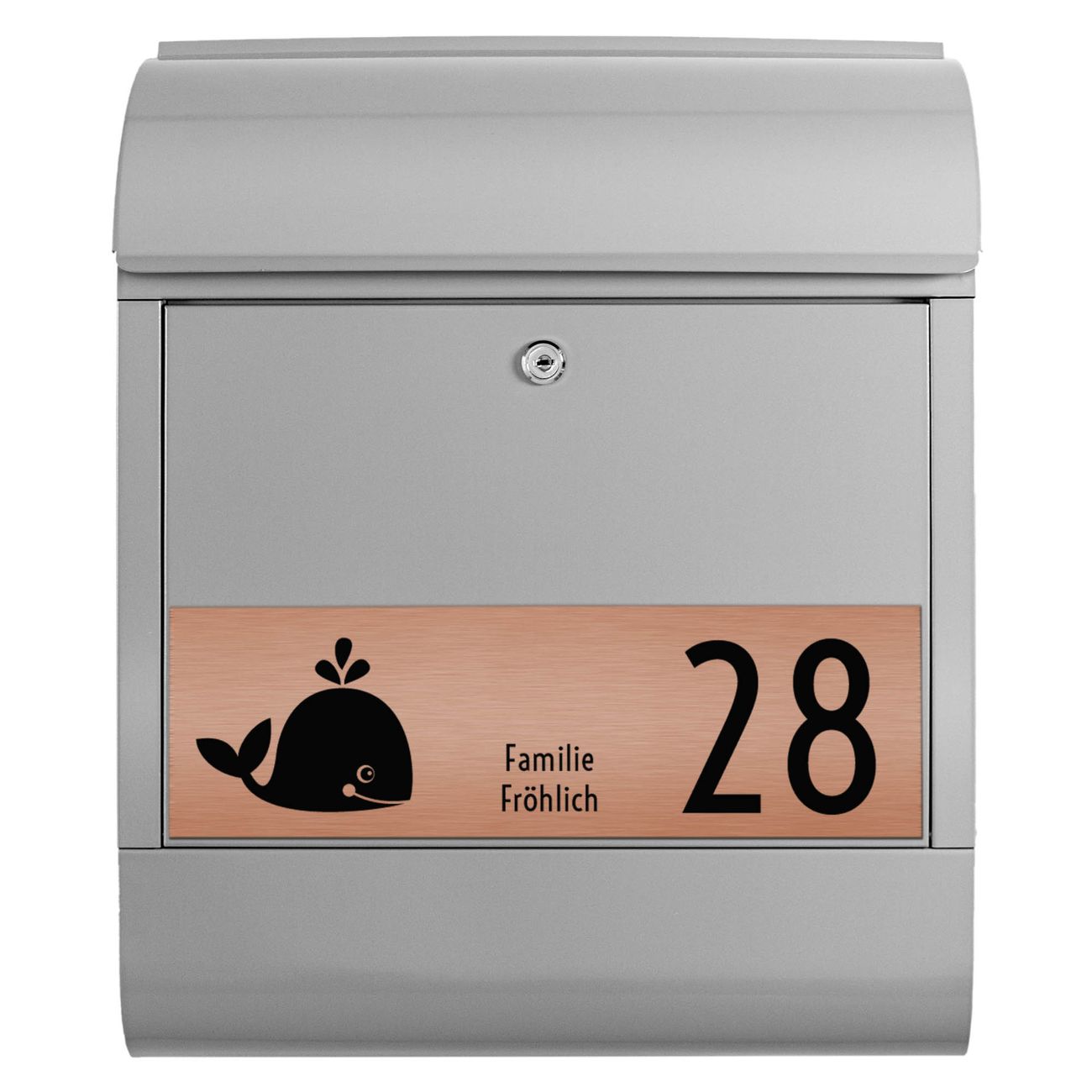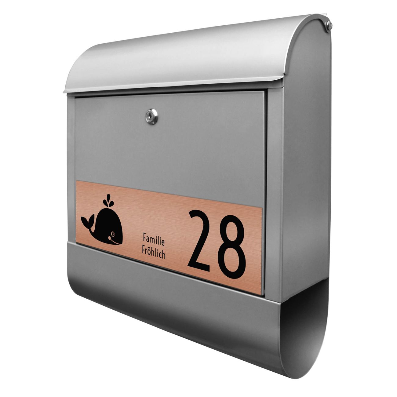 Der Postkasten besteht aus pulverbeschichtetem Stahl. Er ist 38x47x13cm groß. Die Gravur Platte besteht aus einem Laminat auf Acrylbasis mit authentisch metallischem Erscheinungsbild und ist wetter- sowie UV-resistent. Diese wir bereits von uns fest mit dem Briefkasten verklebt. Der Briefkasten wird mit Montagematerial, zwei Schlüsseln sowie einer Bohrschablone geliefert. Sie können diesen Briefkasten sowohl als Wandbriefkasten montieren oder einen passenden Briefkastenstandfuß kaufen und als Standbriefkasten einbetonieren. Auch für die Montage an einem Zaun bieten wir das passende Zubehör an. Die Größe bietet genügend Platz für Sendungen aller Art, der Einwurf fasst auch größere A4 Sendungen.