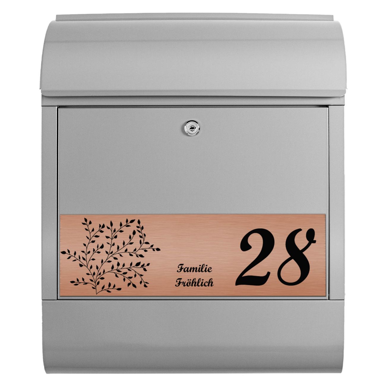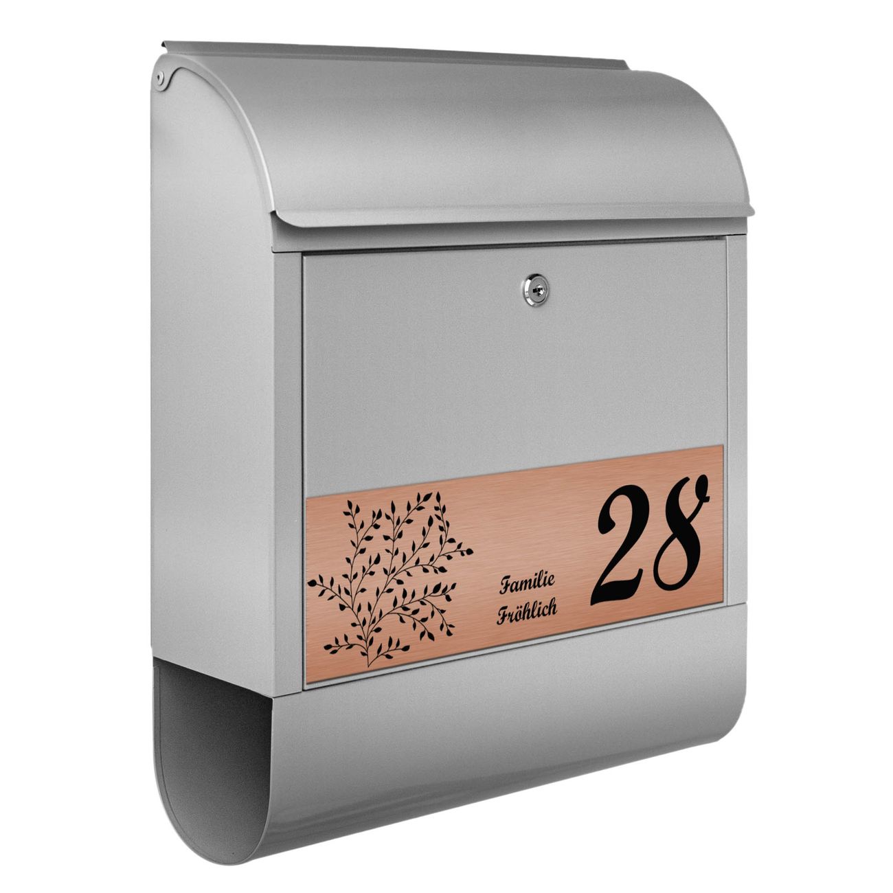 Der banjado Briefkasten mit dem Gravur Motiv Dezente Ranke bietet Ihnen mit seinem Fassungsvermögen genügend Platz auch für große A4 Sendungen. Die integrierte Zeitungsrolle eignet sich hervorragend, um unkompliziert die Tageszeitung zu fassen. Der Postkasten mit Motiv Dezente Ranke hat ein sehr ansprechendes und ausgefallenes Design, damit entlocken Sie Ihren Nachbarn und dem Postboten ein Lächeln. Heben Sie Sich von der tristen grauen Masse ab, ohne auf Funktionalität zu verzichten. Die Gravur Platte aus Acryl in Edelstahl, Gold oder Kupfer-Optik ist 33x10cm groß und schmückt die Vorderseite des Briefkastens. Das Material sieht Edelstahl, Gold und Kupfer zum Verwechseln ähnlich und ist ebenso witterungsbeständig wie dieser. Durch das Bearbeiten erscheint an den gravierten Stellen die schwarze Unterschicht und hebt so in einem guten Kontrast ihren Wunschtext, Ihre Hausnummer und das Gravur Motiv Dezente Ranke ab.