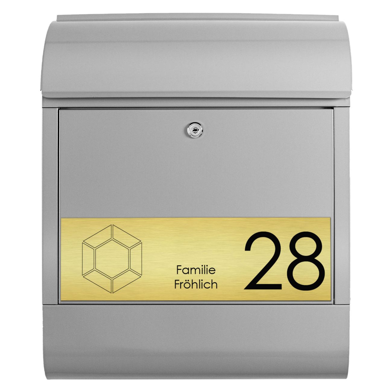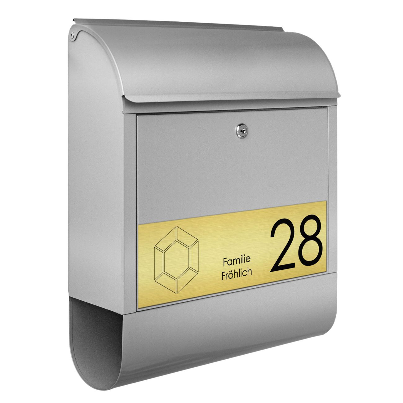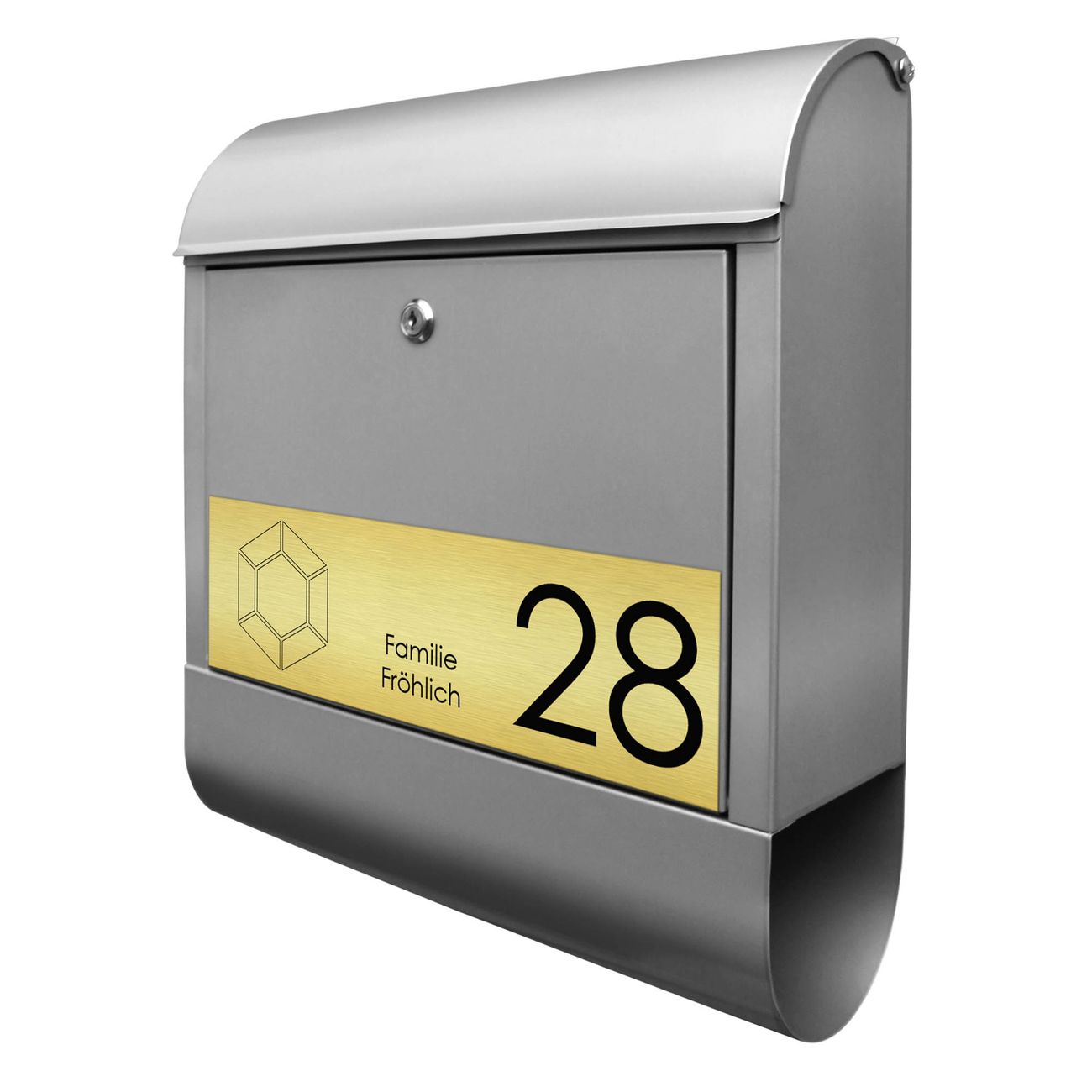 Der banjado Briefkasten mit dem Gravur Motiv Diament bietet Ihnen mit seinem Fassungsvermögen genügend Platz auch für große A4 Sendungen. Die integrierte Zeitungsrolle eignet sich hervorragend, um unkompliziert die Tageszeitung zu fassen. Der Postkasten mit Motiv Diament hat ein sehr ansprechendes und ausgefallenes Design, damit entlocken Sie Ihren Nachbarn und dem Postboten ein Lächeln. Heben Sie Sich von der tristen grauen Masse ab, ohne auf Funktionalität zu verzichten. Die Gravur Platte aus Acryl in Edelstahl, Gold oder Kupfer-Optik ist 33x10cm groß und schmückt die Vorderseite des Briefkastens. Das Material sieht Edelstahl, Gold und Kupfer zum Verwechseln ähnlich und ist ebenso witterungsbeständig wie dieser. Durch das Bearbeiten erscheint an den gravierten Stellen die schwarze Unterschicht und hebt so in einem guten Kontrast ihren Wunschtext, Ihre Hausnummer und das Gravur Motiv Diament ab.