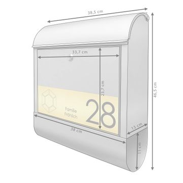 Der Postkasten besteht aus pulverbeschichtetem Stahl. Er ist 38x47x13cm groß. Die Gravur Platte besteht aus einem Laminat auf Acrylbasis mit authentisch metallischem Erscheinungsbild und ist wetter- sowie UV-resistent. Diese wir bereits von uns fest mit dem Briefkasten verklebt. Der Briefkasten wird mit Montagematerial, zwei Schlüsseln sowie einer Bohrschablone geliefert. Sie können diesen Briefkasten sowohl als Wandbriefkasten montieren oder einen passenden Briefkastenstandfuß kaufen und als Standbriefkasten einbetonieren. Auch für die Montage an einem Zaun bieten wir das passende Zubehör an. Die Größe bietet genügend Platz für Sendungen aller Art, der Einwurf fasst auch größere A4 Sendungen.