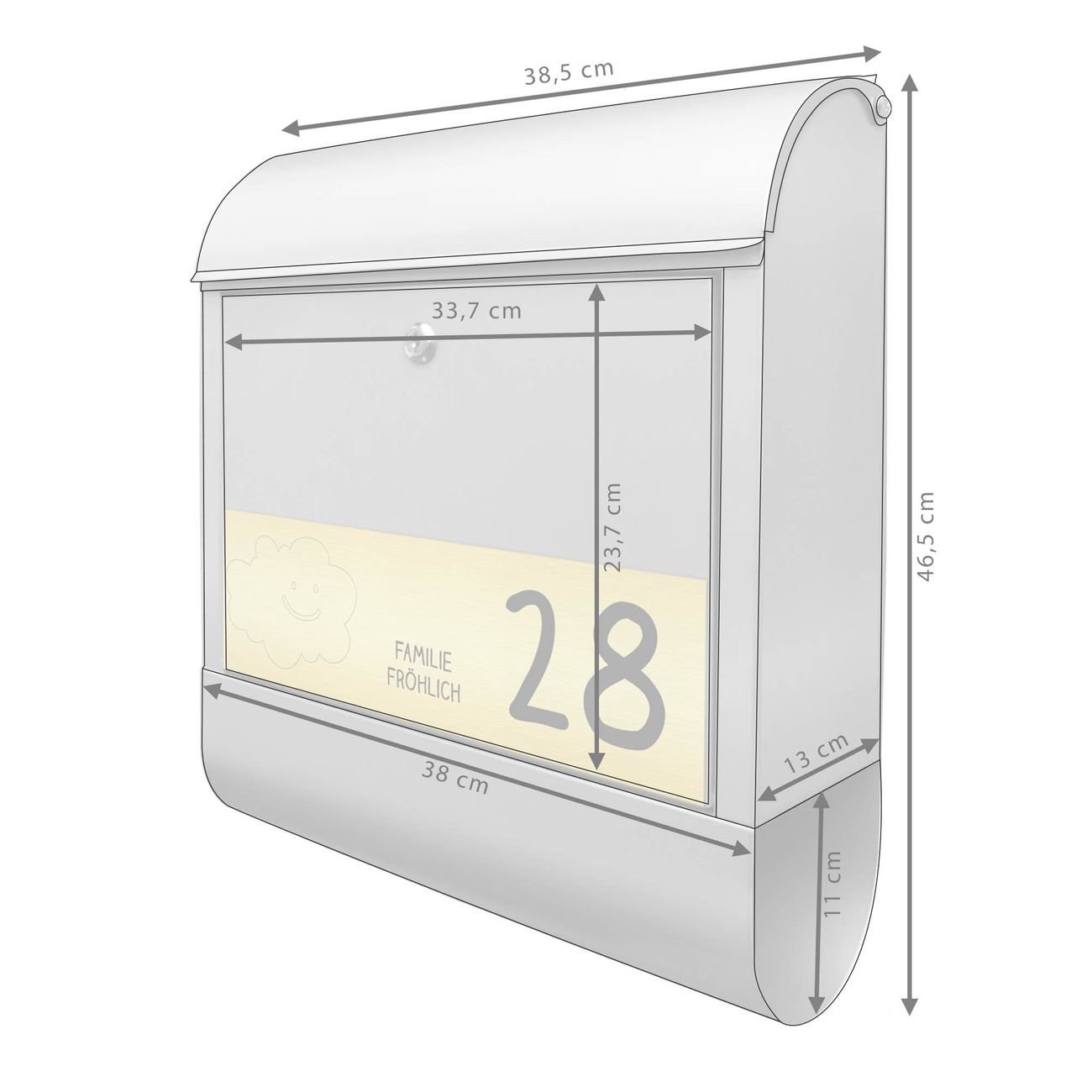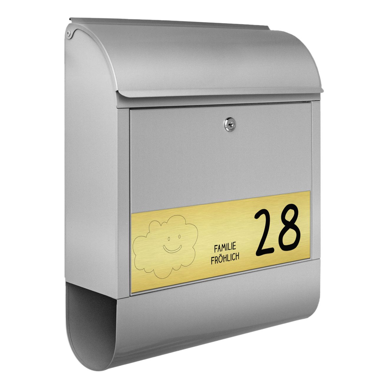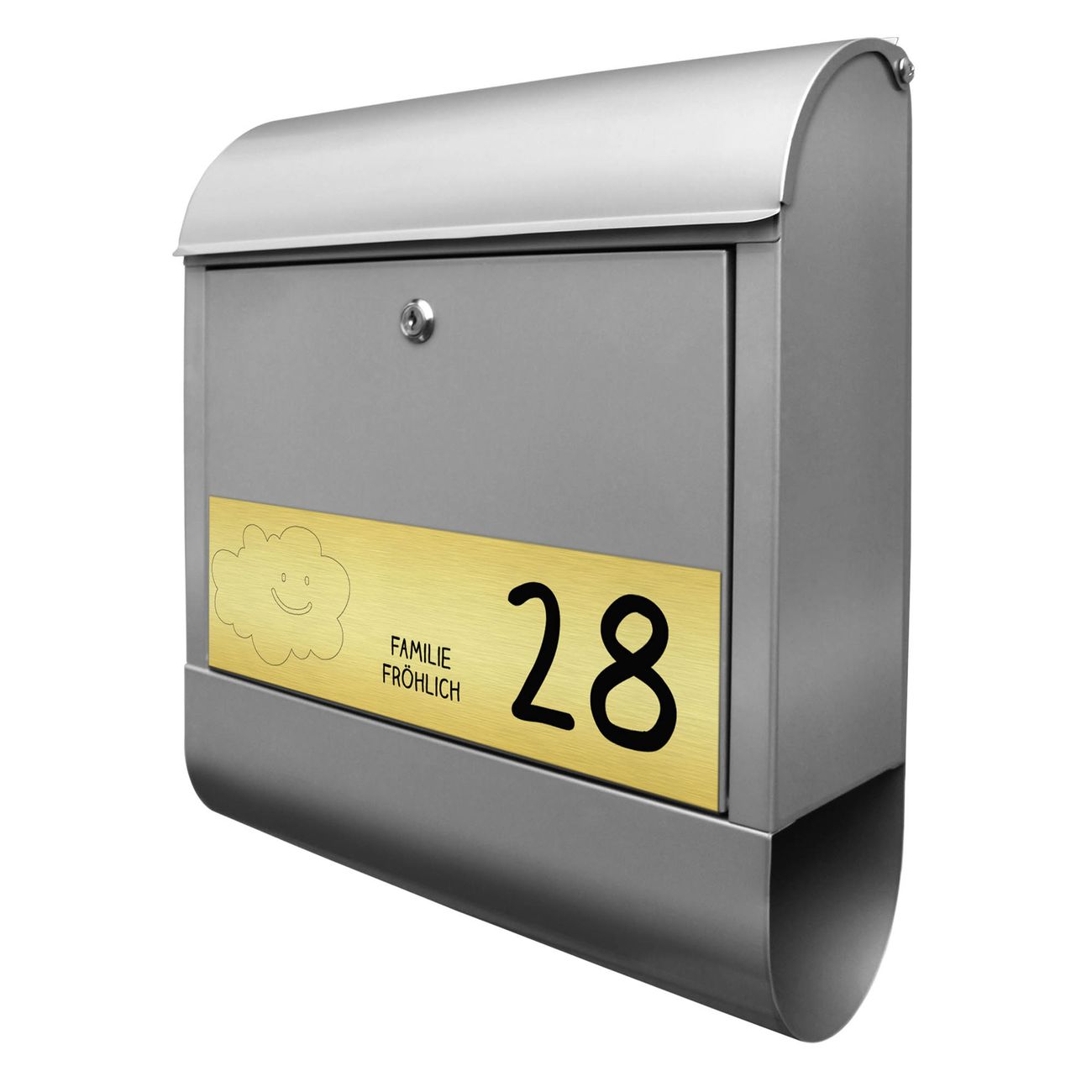 Der banjado Briefkasten mit dem Gravur Motiv glückliche Regenwolken bietet Ihnen mit seinem Fassungsvermögen genügend Platz auch für große A4 Sendungen. Die integrierte Zeitungsrolle eignet sich hervorragend, um unkompliziert die Tageszeitung zu fassen. Der Postkasten mit Motiv glückliche Regenwolken hat ein sehr ansprechendes und ausgefallenes Design, damit entlocken Sie Ihren Nachbarn und dem Postboten ein Lächeln. Heben Sie Sich von der tristen grauen Masse ab, ohne auf Funktionalität zu verzichten. Die Gravur Platte aus Acryl in Edelstahl, Gold oder Kupfer-Optik ist 33x10cm groß und schmückt die Vorderseite des Briefkastens. Das Material sieht Edelstahl, Gold und Kupfer zum Verwechseln ähnlich und ist ebenso witterungsbeständig wie dieser. Durch das Bearbeiten erscheint an den gravierten Stellen die schwarze Unterschicht und hebt so in einem guten Kontrast ihren Wunschtext, Ihre Hausnummer und das Gravur Motiv glückliche Regenwolken ab.