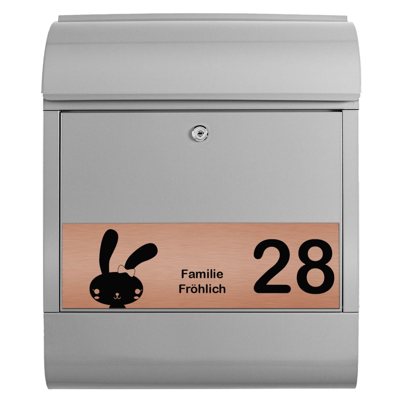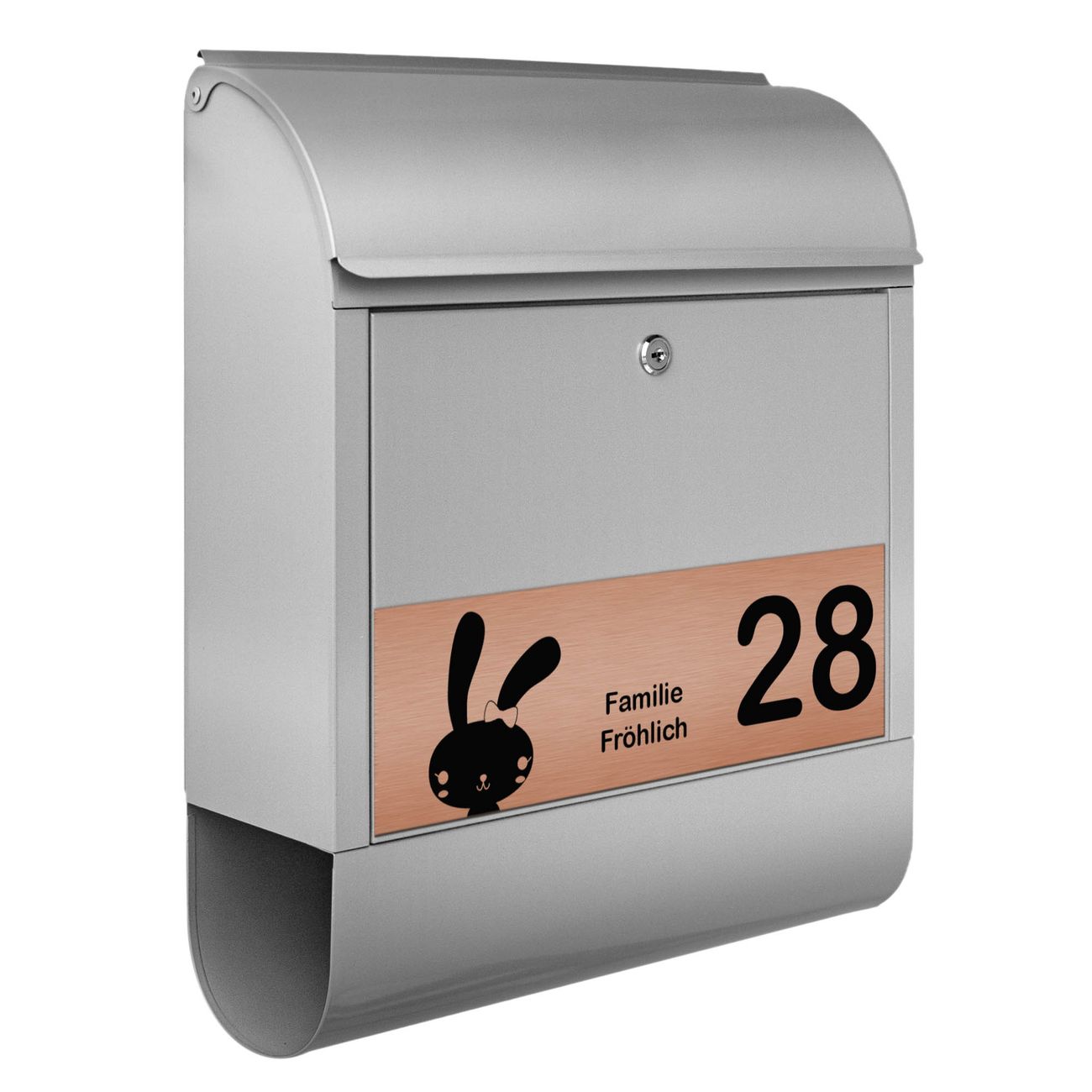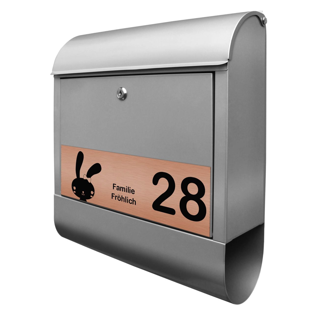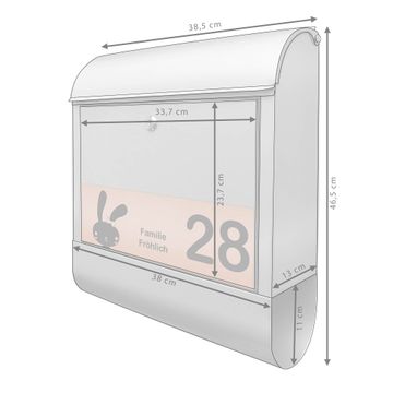 Der banjado Briefkasten mit dem Gravur Motiv Hase bietet Ihnen mit seinem Fassungsvermögen genügend Platz auch für große A4 Sendungen. Die integrierte Zeitungsrolle eignet sich hervorragend, um unkompliziert die Tageszeitung zu fassen. Der Postkasten mit Motiv Hase hat ein sehr ansprechendes und ausgefallenes Design, damit entlocken Sie Ihren Nachbarn und dem Postboten ein Lächeln. Heben Sie Sich von der tristen grauen Masse ab, ohne auf Funktionalität zu verzichten. Die Gravur Platte aus Acryl in Edelstahl, Gold oder Kupfer-Optik ist 33x10cm groß und schmückt die Vorderseite des Briefkastens. Das Material sieht Edelstahl, Gold und Kupfer zum Verwechseln ähnlich und ist ebenso witterungsbeständig wie dieser. Durch das Bearbeiten erscheint an den gravierten Stellen die schwarze Unterschicht und hebt so in einem guten Kontrast ihren Wunschtext, Ihre Hausnummer und das Gravur Motiv Hase ab.