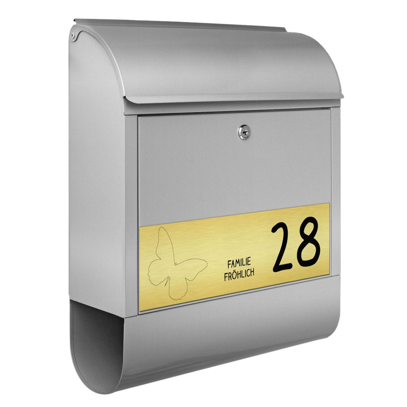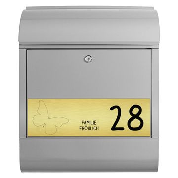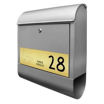 Der banjado Briefkasten mit dem Gravur Motiv Schmetterling bietet Ihnen mit seinem Fassungsvermögen genügend Platz auch für große A4 Sendungen. Die integrierte Zeitungsrolle eignet sich hervorragend, um unkompliziert die Tageszeitung zu fassen. Der Postkasten mit Motiv Schmetterling hat ein sehr ansprechendes und ausgefallenes Design, damit entlocken Sie Ihren Nachbarn und dem Postboten ein Lächeln. Heben Sie Sich von der tristen grauen Masse ab, ohne auf Funktionalität zu verzichten. Die Gravur Platte aus Acryl in Edelstahl, Gold oder Kupfer-Optik ist 33x10cm groß und schmückt die Vorderseite des Briefkastens. Das Material sieht Edelstahl, Gold und Kupfer zum Verwechseln ähnlich und ist ebenso witterungsbeständig wie dieser. Durch das Bearbeiten erscheint an den gravierten Stellen die schwarze Unterschicht und hebt so in einem guten Kontrast ihren Wunschtext, Ihre Hausnummer und das Gravur Motiv Schmetterling ab.