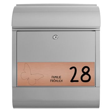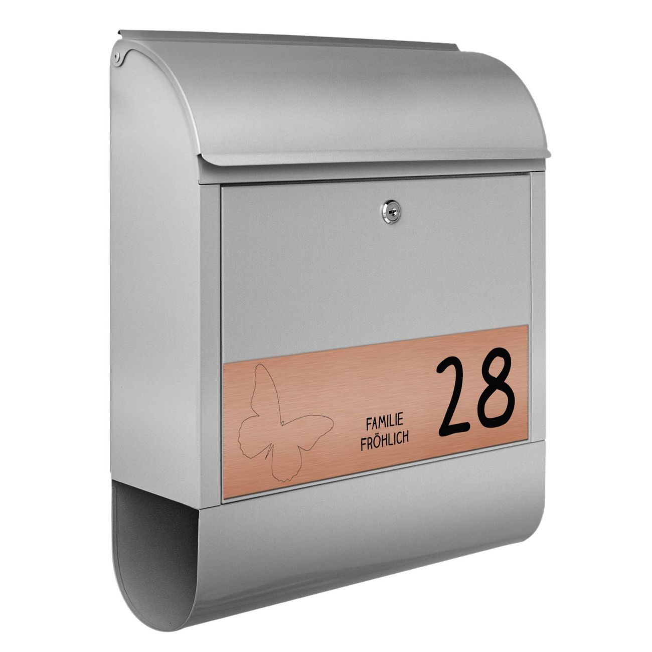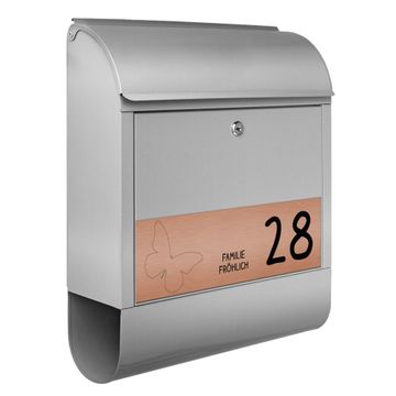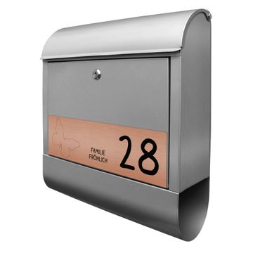 Der banjado Briefkasten mit dem Gravur Motiv Schmetterling bietet Ihnen mit seinem Fassungsvermögen genügend Platz auch für große A4 Sendungen. Die integrierte Zeitungsrolle eignet sich hervorragend, um unkompliziert die Tageszeitung zu fassen. Der Postkasten mit Motiv Schmetterling hat ein sehr ansprechendes und ausgefallenes Design, damit entlocken Sie Ihren Nachbarn und dem Postboten ein Lächeln. Heben Sie Sich von der tristen grauen Masse ab, ohne auf Funktionalität zu verzichten. Die Gravur Platte aus Acryl in Edelstahl, Gold oder Kupfer-Optik ist 33x10cm groß und schmückt die Vorderseite des Briefkastens. Das Material sieht Edelstahl, Gold und Kupfer zum Verwechseln ähnlich und ist ebenso witterungsbeständig wie dieser. Durch das Bearbeiten erscheint an den gravierten Stellen die schwarze Unterschicht und hebt so in einem guten Kontrast ihren Wunschtext, Ihre Hausnummer und das Gravur Motiv Schmetterling ab.