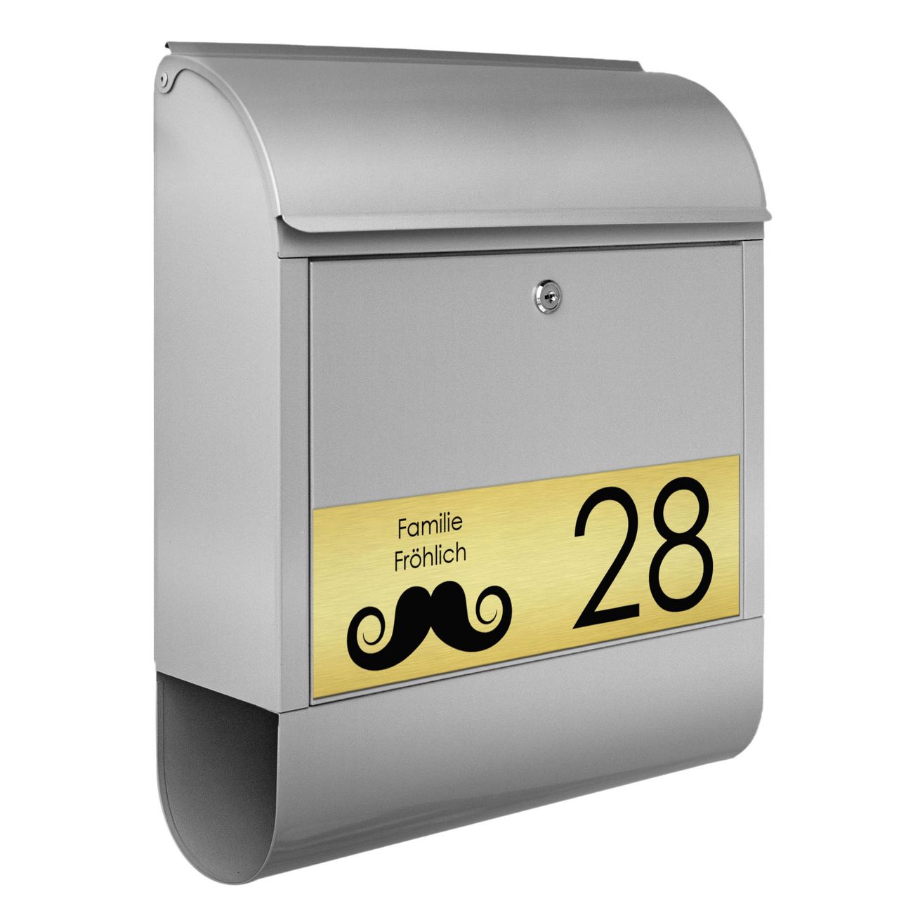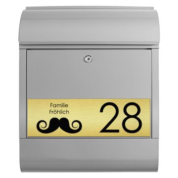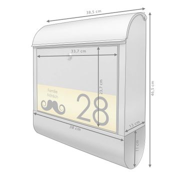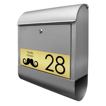Der banjado Briefkasten mit dem Gravur Motiv Schnurrbart bietet Ihnen mit seinem Fassungsvermögen genügend Platz auch für große A4 Sendungen. Die integrierte Zeitungsrolle eignet sich hervorragend, um unkompliziert die Tageszeitung zu fassen. Der Postkasten mit Motiv Schnurrbart hat ein sehr ansprechendes und ausgefallenes Design, damit entlocken Sie Ihren Nachbarn und dem Postboten ein Lächeln. Heben Sie Sich von der tristen grauen Masse ab, ohne auf Funktionalität zu verzichten. Die Gravur Platte aus Acryl in Edelstahl, Gold oder Kupfer-Optik ist 33x10cm groß und schmückt die Vorderseite des Briefkastens. Das Material sieht Edelstahl, Gold und Kupfer zum Verwechseln ähnlich und ist ebenso witterungsbeständig wie dieser. Durch das Bearbeiten erscheint an den gravierten Stellen die schwarze Unterschicht und hebt so in einem guten Kontrast ihren Wunschtext, Ihre Hausnummer und das Gravur Motiv Schnurrbart ab.