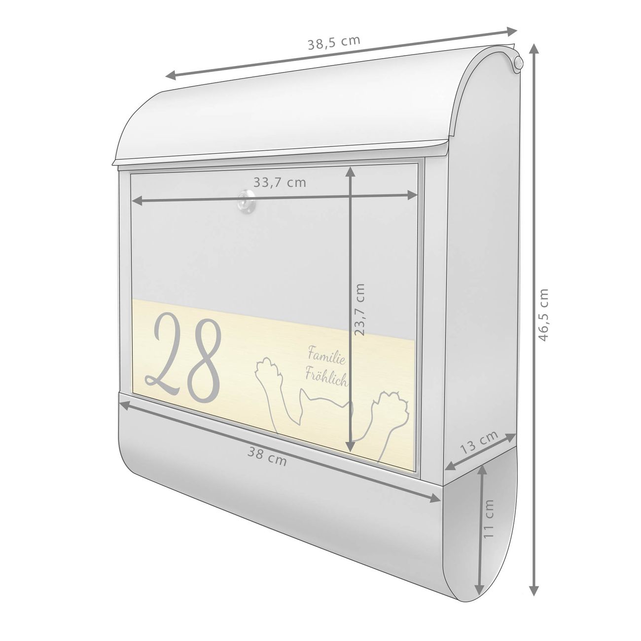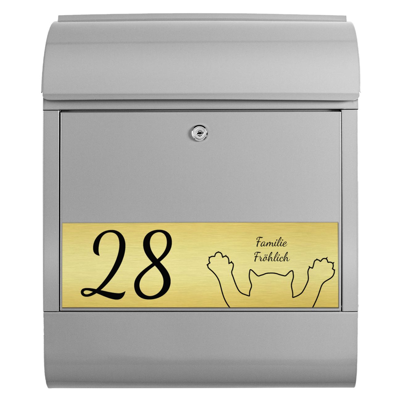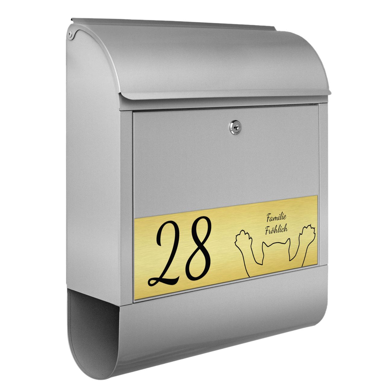Der Postkasten besteht aus pulverbeschichtetem Stahl. Er ist 38x47x13cm groß. Die Gravur Platte besteht aus einem Laminat auf Acrylbasis mit authentisch metallischem Erscheinungsbild und ist wetter- sowie UV-resistent. Diese wir bereits von uns fest mit dem Briefkasten verklebt. Der Briefkasten wird mit Montagematerial, zwei Schlüsseln sowie einer Bohrschablone geliefert. Sie können diesen Briefkasten sowohl als Wandbriefkasten montieren oder einen passenden Briefkastenstandfuß kaufen und als Standbriefkasten einbetonieren. Auch für die Montage an einem Zaun bieten wir das passende Zubehör an. Die Größe bietet genügend Platz für Sendungen aller Art, der Einwurf fasst auch größere A4 Sendungen.