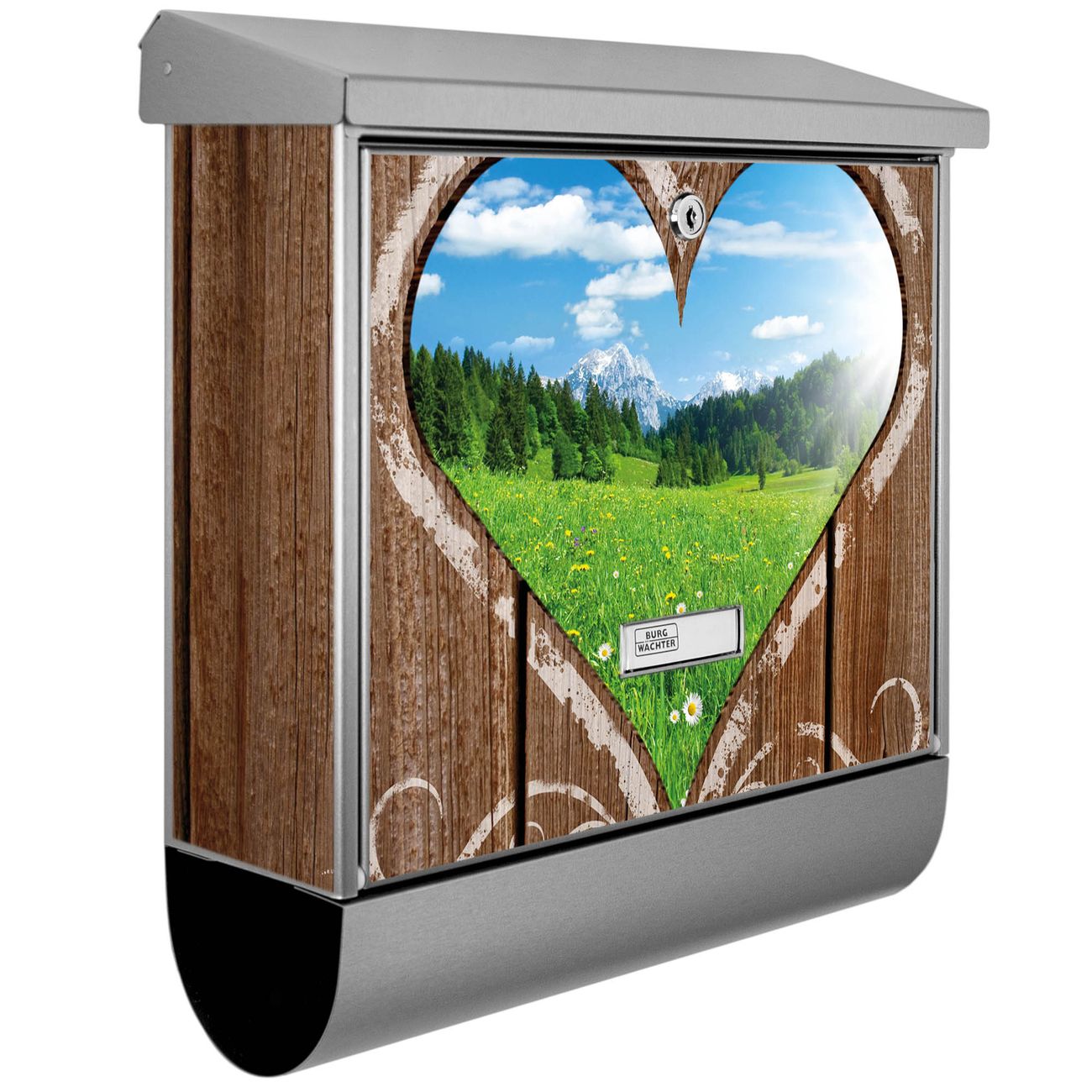 Der BURG-WÄCHTER Edelstahl Briefkasten mit Motiv Ausblick mit Herz und Zeitungsrolle bietet Ihnen mit seinem Fassungsvermögen genügend Platz auch für große A4 Sendungen und Zeitschriften. Das integrierte Regendach schützt Ihre Post vor dem Eindringen von Regen.