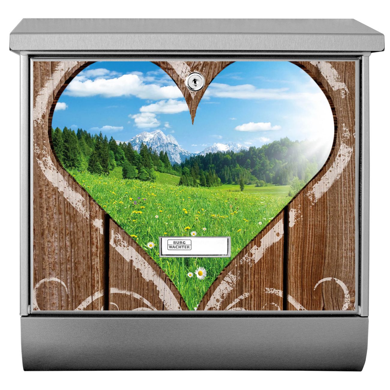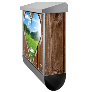 Der Ausblick mit Herz Motivbriefkasten hat ein sehr ansprechendes und zeitloses Design. Unsere Motivpalette hält jede Menge Varianten bereit, ob klassisch, modern, verspielt oder witzig - für jeden haben wir das passende Motiv parat. Der Briefkasten mit Zeitungsfach ist Ihr Aushängeschild, heben Sie Sich ab ohne auf Funktionalität zu verzichten.