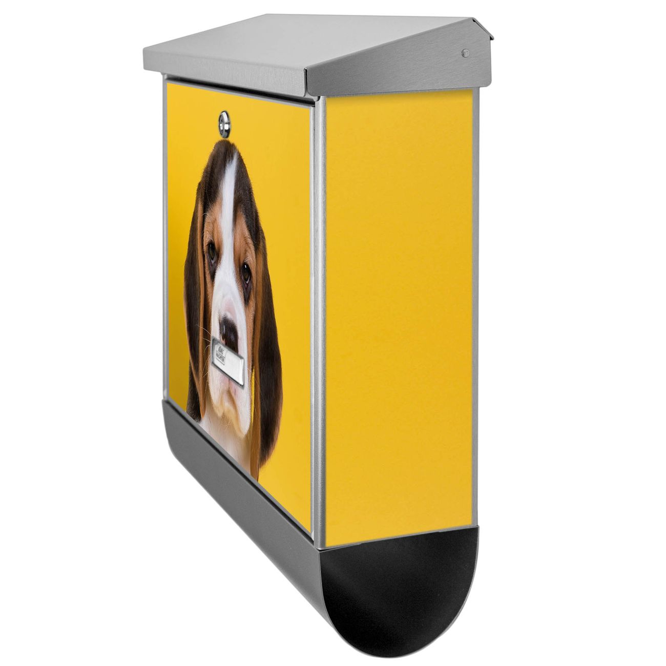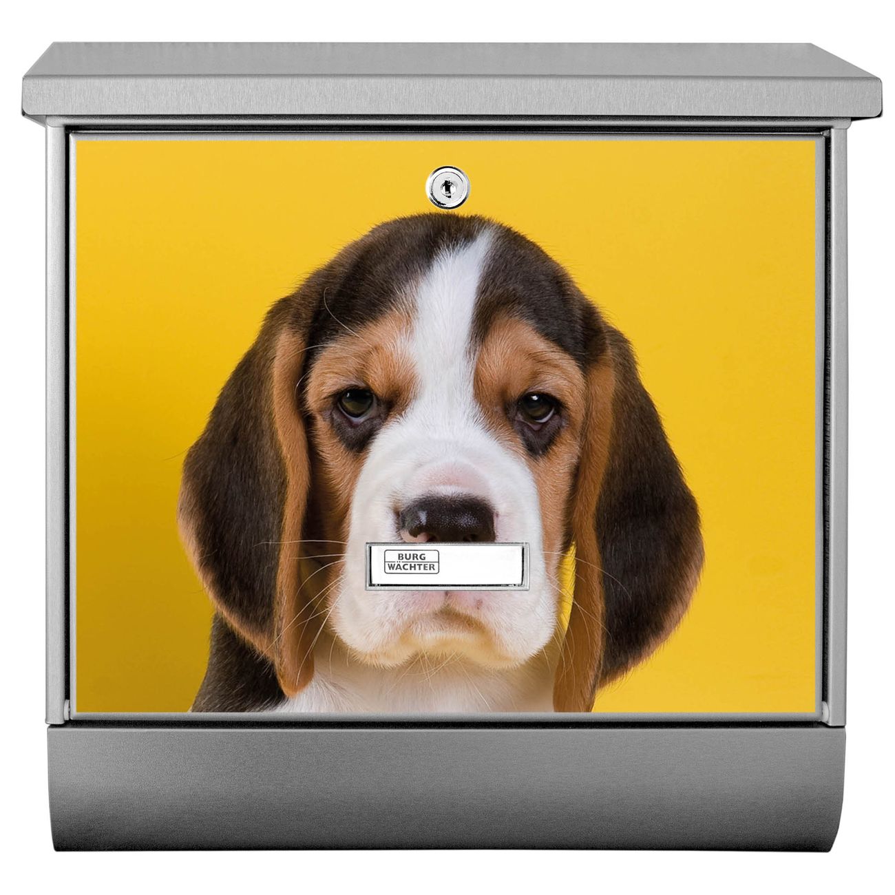 Der BURG-WÄCHTER Edelstahl Briefkasten mit Motiv Beagle und Zeitungsrolle bietet Ihnen mit seinem Fassungsvermögen genügend Platz auch für große A4 Sendungen und Zeitschriften. Das integrierte Regendach schützt Ihre Post vor dem Eindringen von Regen.
