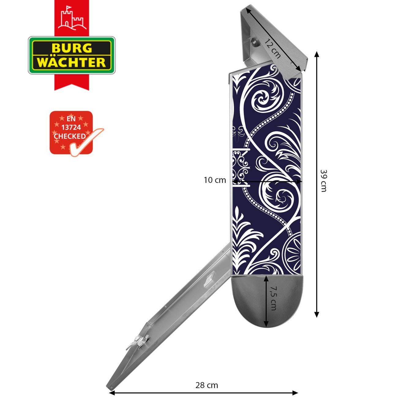Der BURG-WÄCHTER Edelstahl Briefkasten mit Motiv Blaue Tapete und Zeitungsrolle bietet Ihnen mit seinem Fassungsvermögen genügend Platz auch für große A4 Sendungen und Zeitschriften. Das integrierte Regendach schützt Ihre Post vor dem Eindringen von Regen.