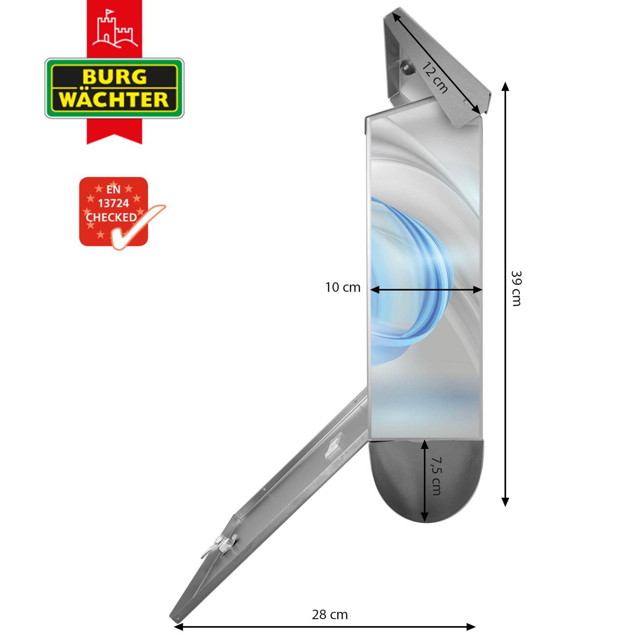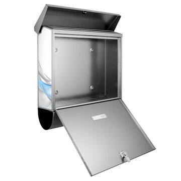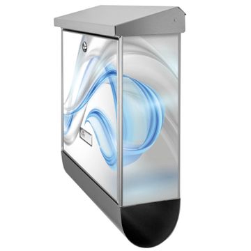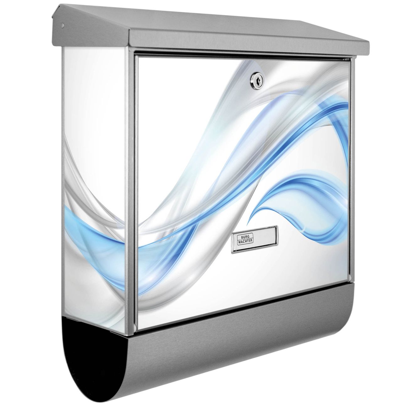 Der BURG-WÄCHTER Edelstahl Briefkasten mit Motiv Blauer Schleier und Zeitungsrolle bietet Ihnen mit seinem Fassungsvermögen genügend Platz auch für große A4 Sendungen und Zeitschriften. Das integrierte Regendach schützt Ihre Post vor dem Eindringen von Regen.