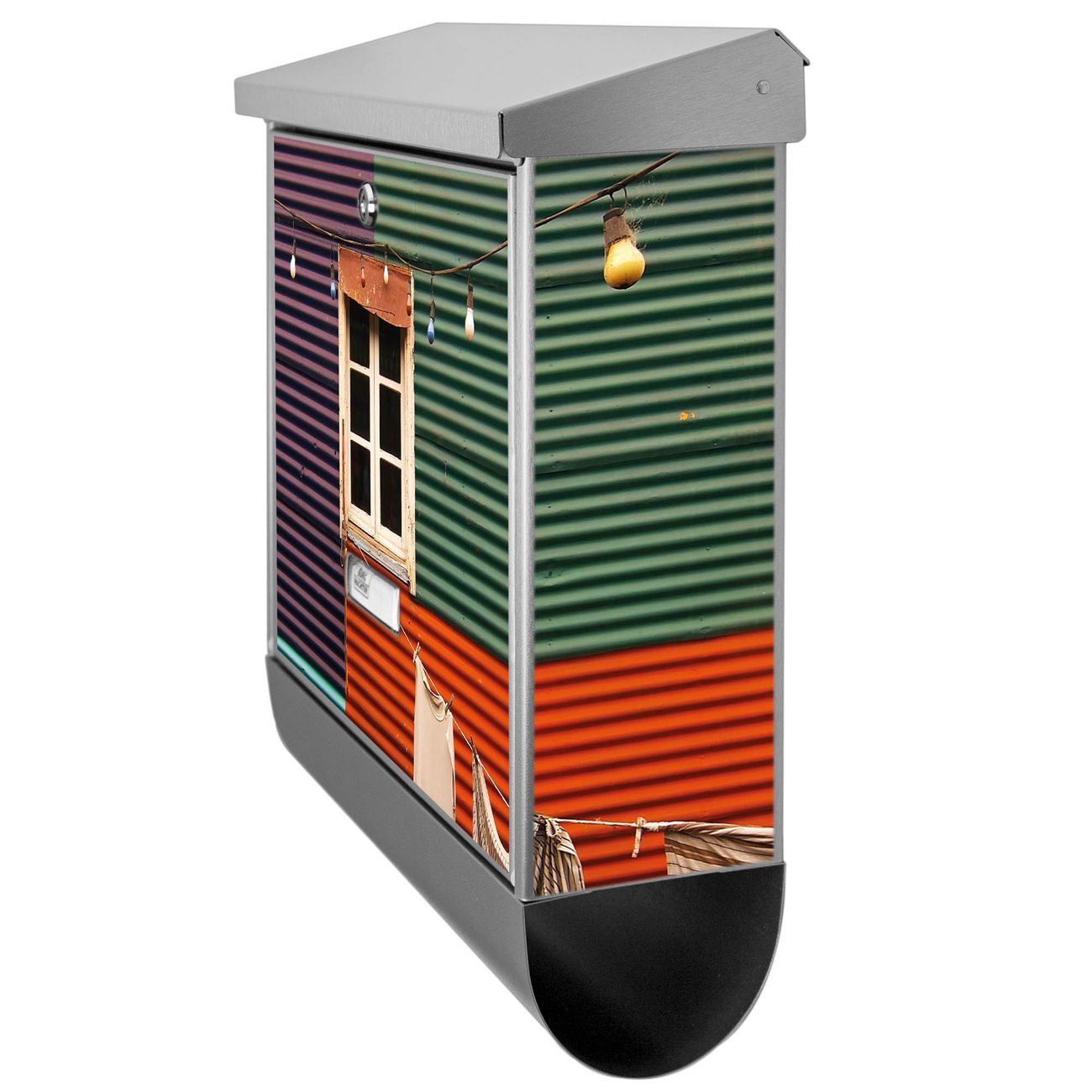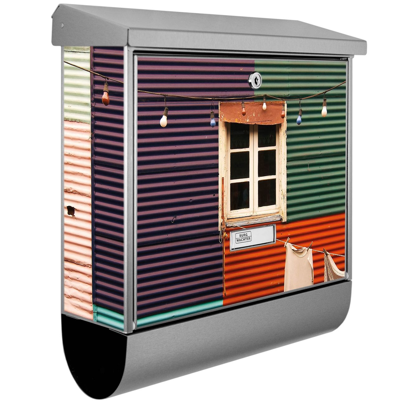 Der BURG-WÄCHTER Edelstahl Briefkasten mit Motiv Buntes Haus und Zeitungsrolle bietet Ihnen mit seinem Fassungsvermögen genügend Platz auch für große A4 Sendungen und Zeitschriften. Das integrierte Regendach schützt Ihre Post vor dem Eindringen von Regen.