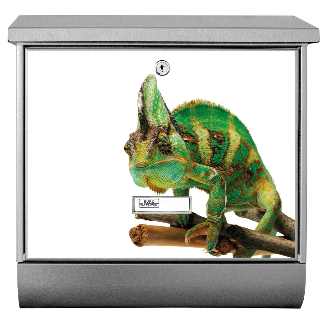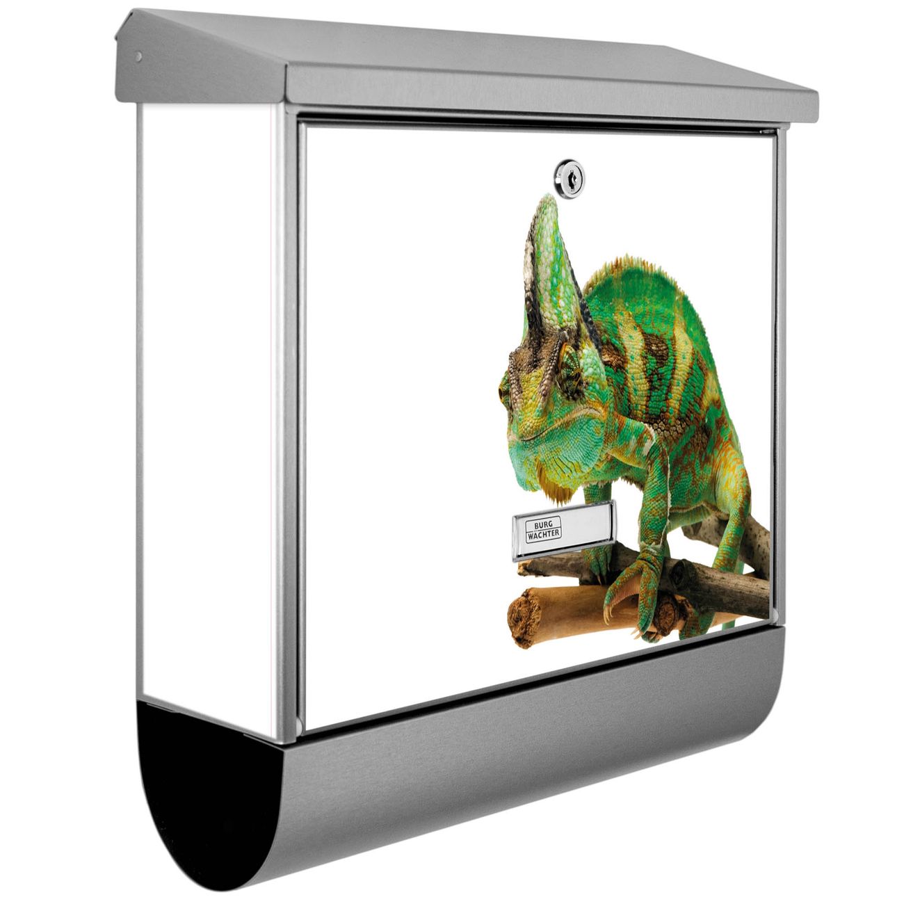 Der BURG-WÄCHTER Edelstahl Briefkasten mit Motiv Chamäleon und Zeitungsrolle bietet Ihnen mit seinem Fassungsvermögen genügend Platz auch für große A4 Sendungen und Zeitschriften. Das integrierte Regendach schützt Ihre Post vor dem Eindringen von Regen.