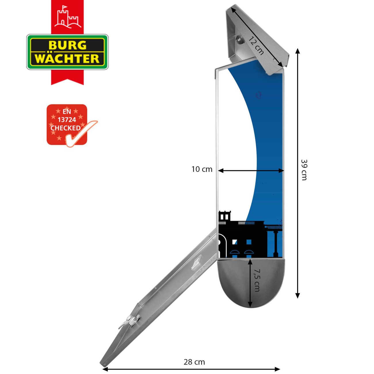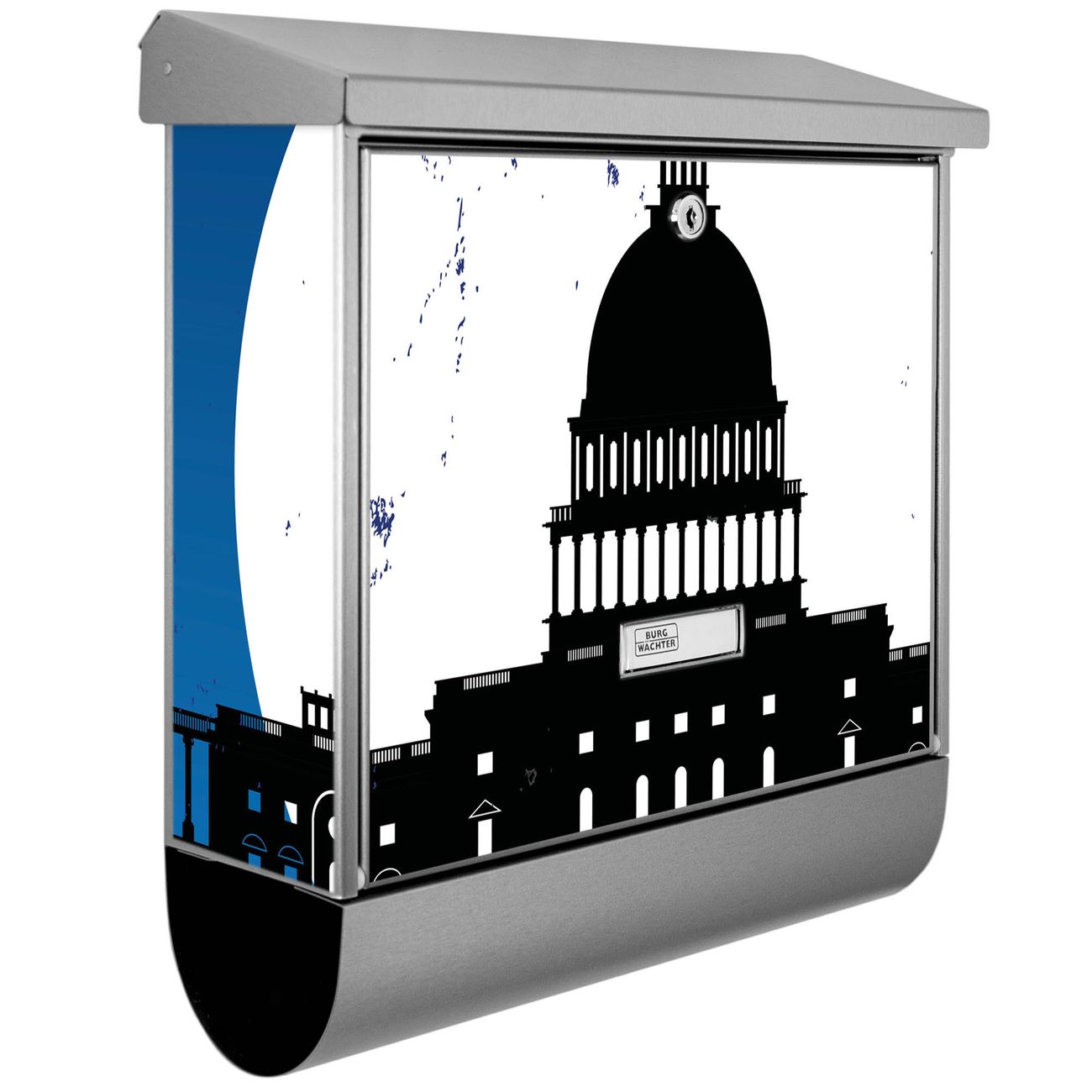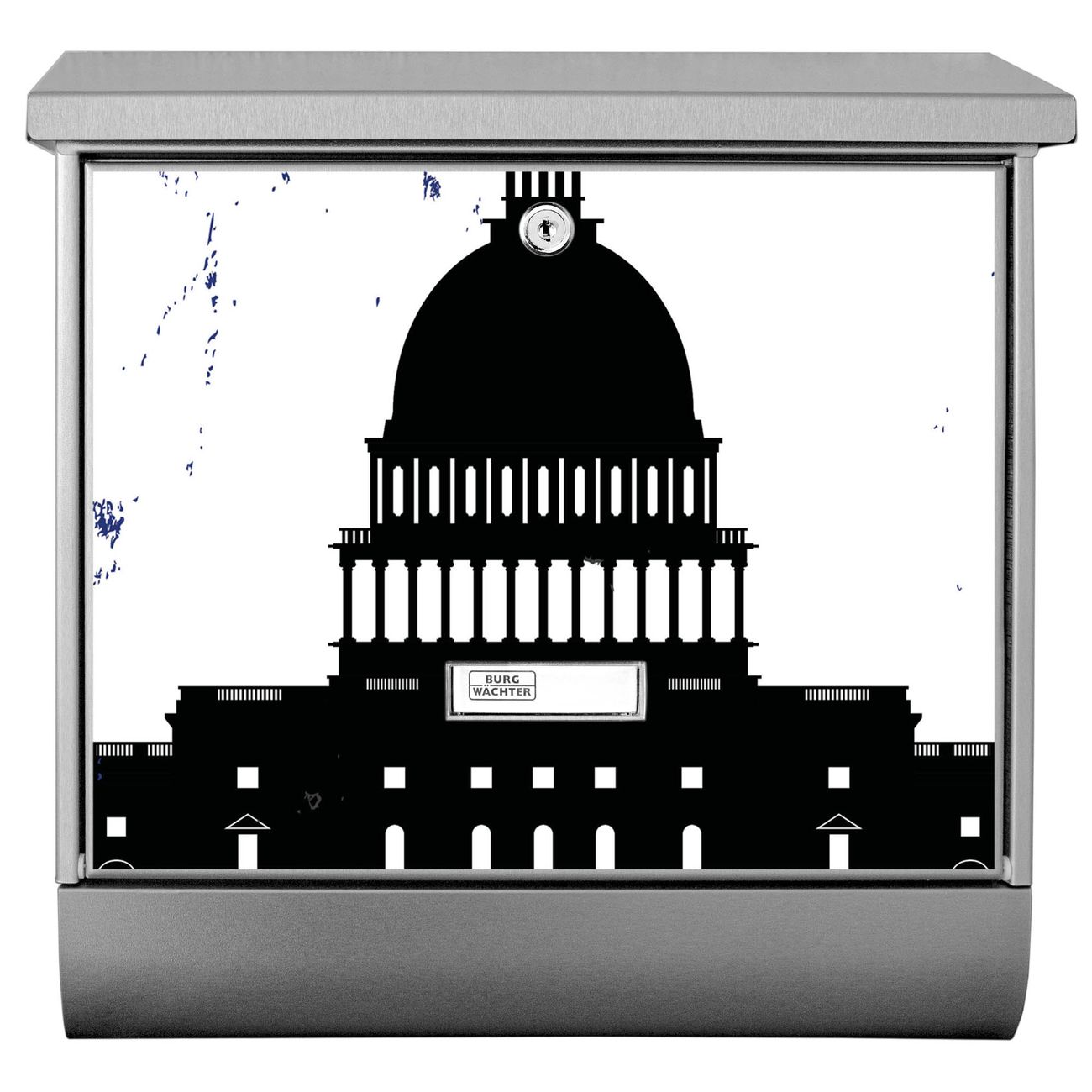 Der BURG-WÄCHTER Edelstahl Briefkasten mit Motiv City Poster Washington und Zeitungsrolle bietet Ihnen mit seinem Fassungsvermögen genügend Platz auch für große A4 Sendungen und Zeitschriften. Das integrierte Regendach schützt Ihre Post vor dem Eindringen von Regen.