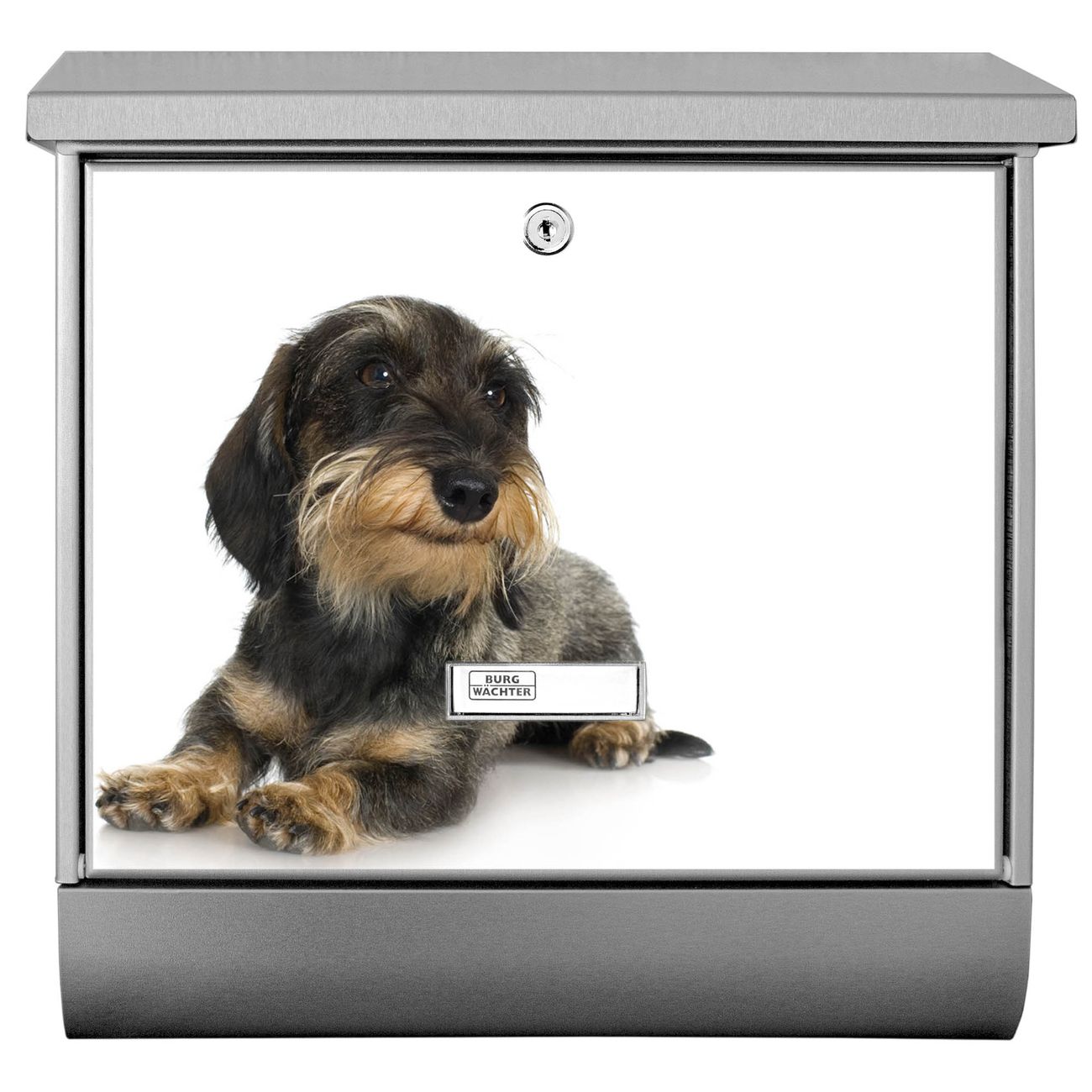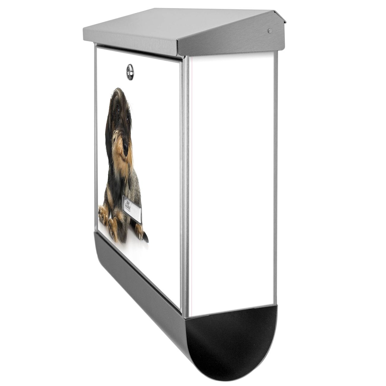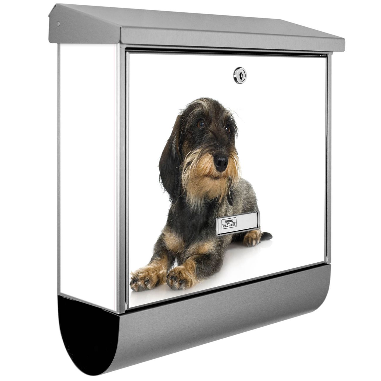 Der BURG-WÄCHTER Edelstahl Briefkasten mit Motiv Dackel und Zeitungsrolle bietet Ihnen mit seinem Fassungsvermögen genügend Platz auch für große A4 Sendungen und Zeitschriften. Das integrierte Regendach schützt Ihre Post vor dem Eindringen von Regen.