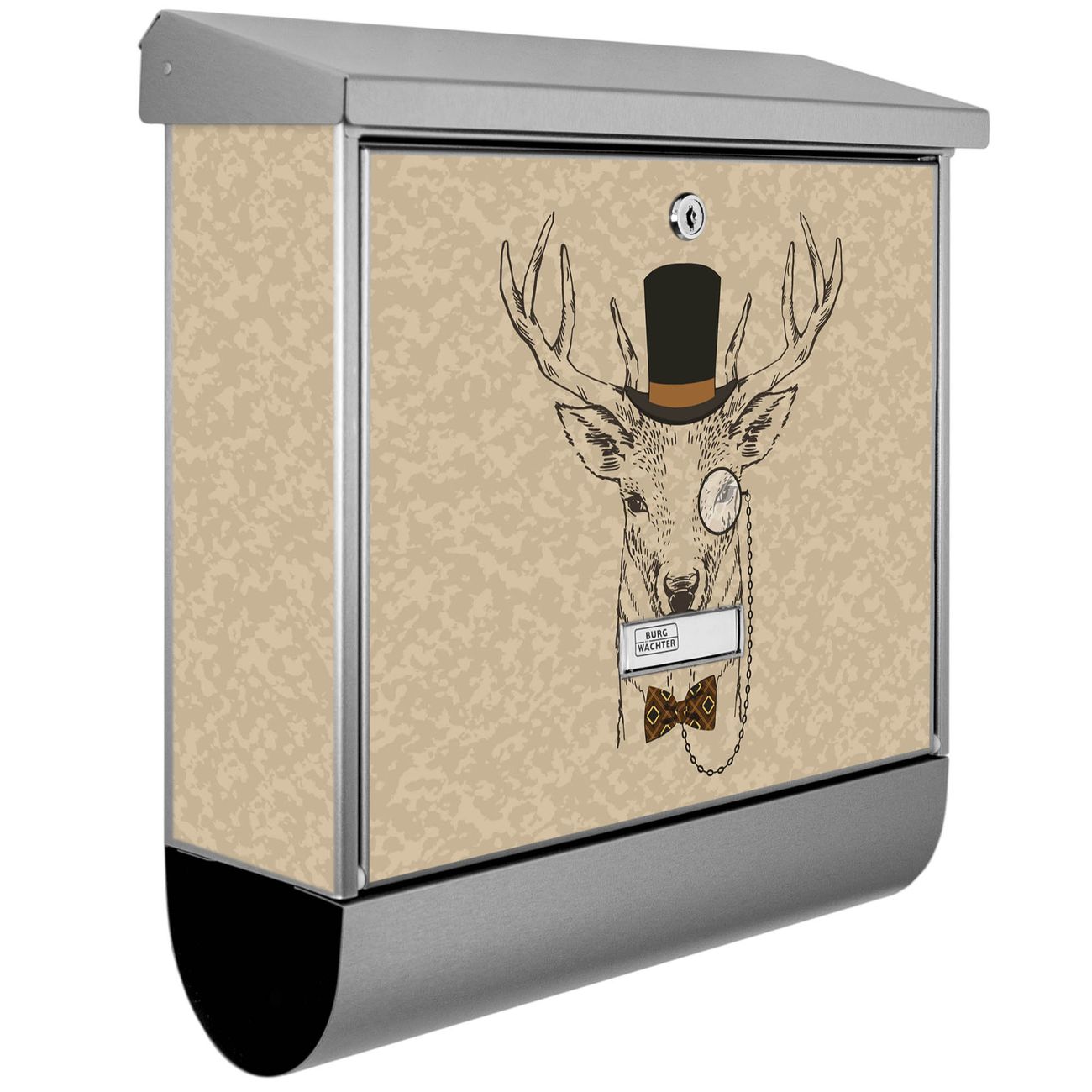 Der BURG-WÄCHTER Edelstahl Briefkasten mit Motiv Direktor Hirsch und Zeitungsrolle bietet Ihnen mit seinem Fassungsvermögen genügend Platz auch für große A4 Sendungen und Zeitschriften. Das integrierte Regendach schützt Ihre Post vor dem Eindringen von Regen.