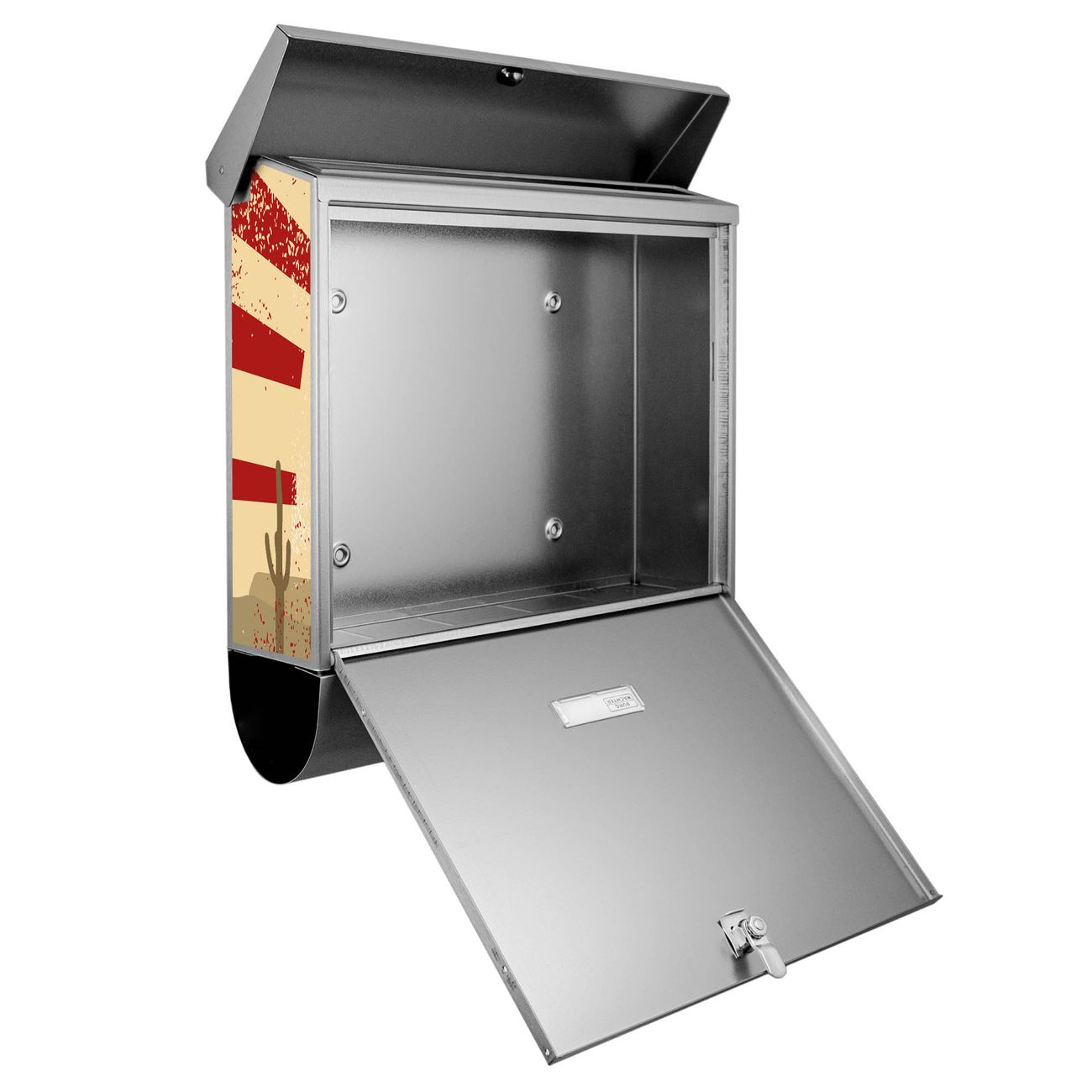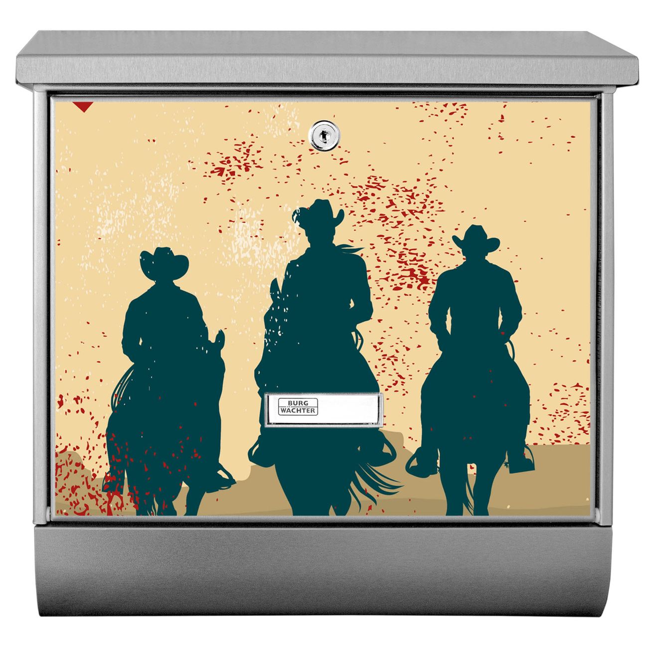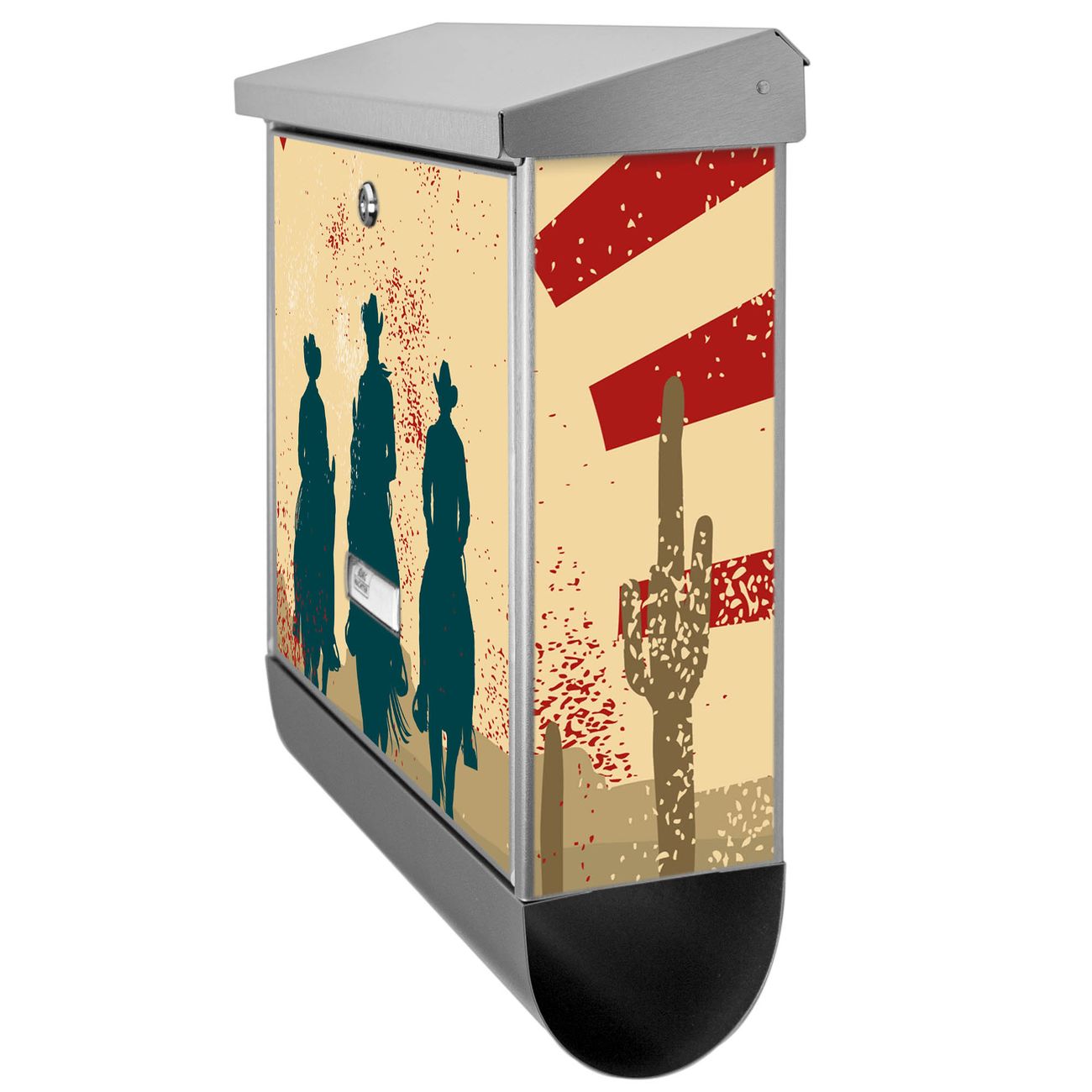 Der BURG-WÄCHTER Edelstahl Briefkasten mit Motiv Drei Cowboys und Zeitungsrolle bietet Ihnen mit seinem Fassungsvermögen genügend Platz auch für große A4 Sendungen und Zeitschriften. Das integrierte Regendach schützt Ihre Post vor dem Eindringen von Regen.